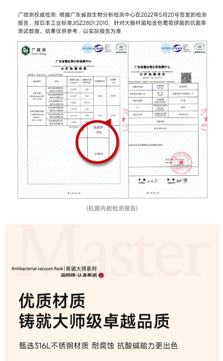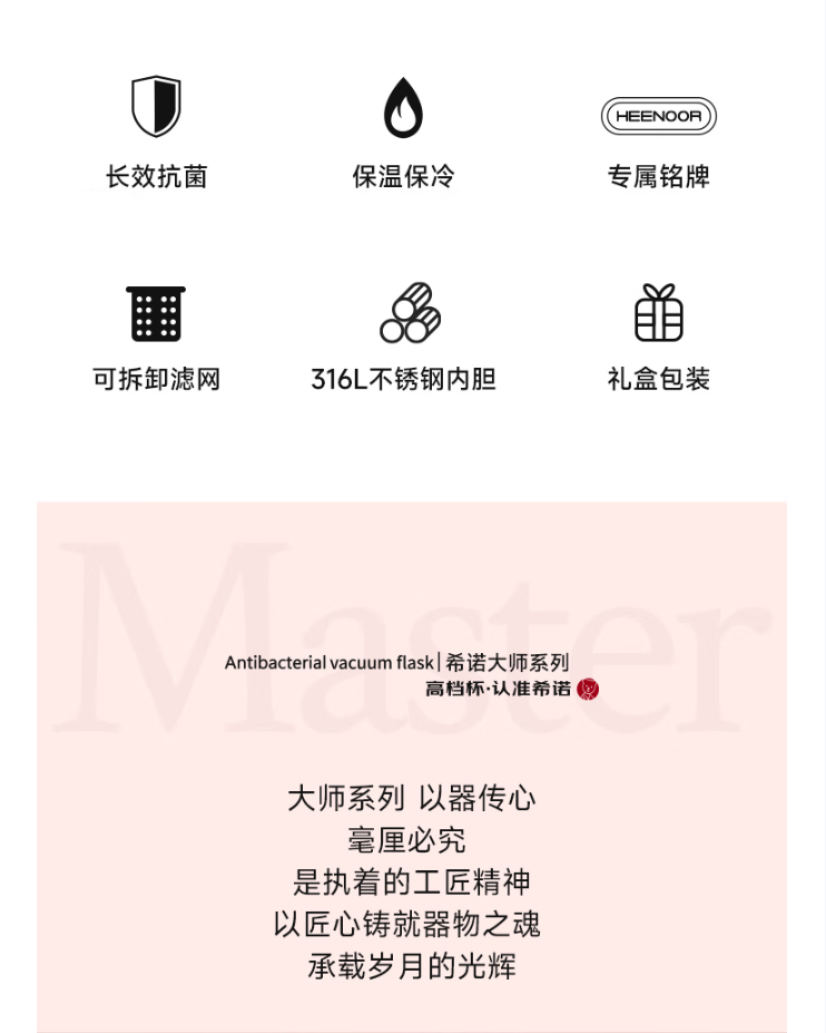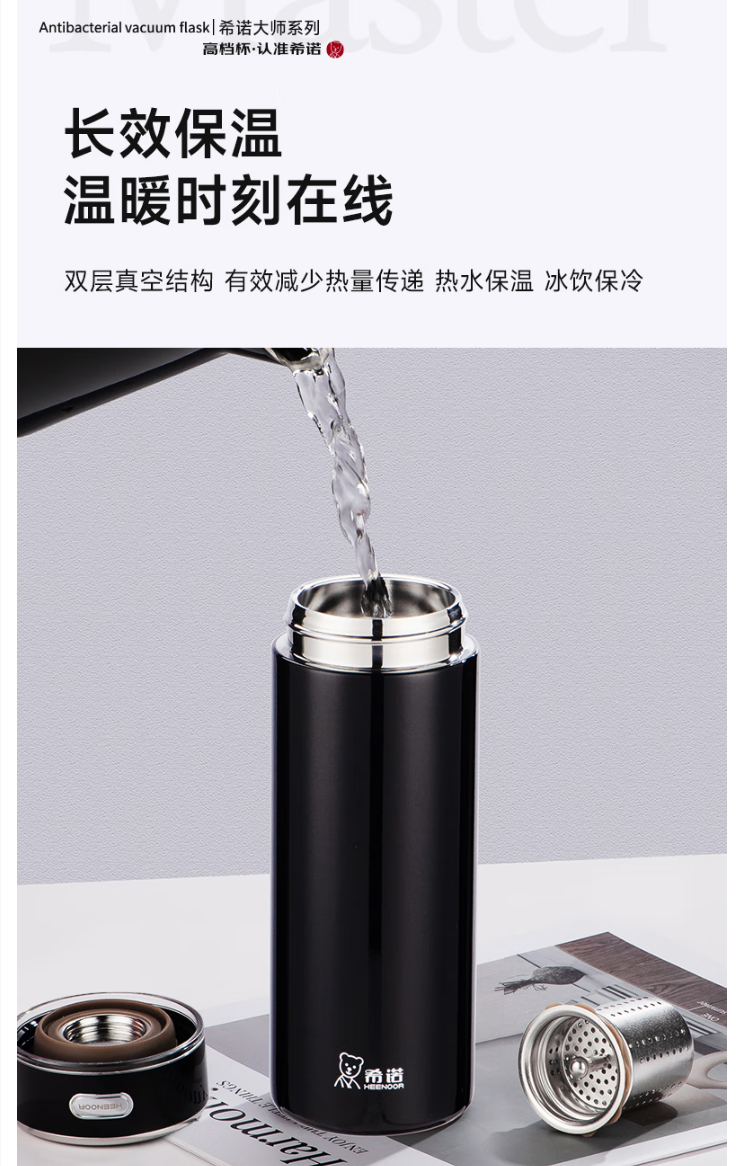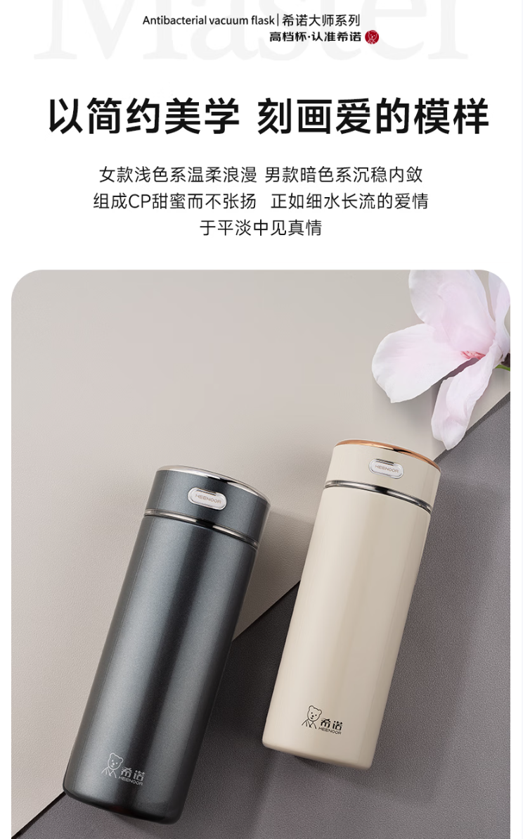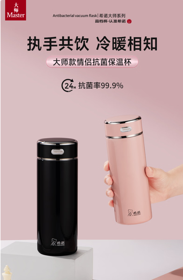 大师款情侣抗菌保温杯,24H抗菌率99.9%;硬核抗菌全面守护,持久洁净,守护饮水健康;甄选316L不锈钢材质,耐腐蚀,铸就大师级卓越品质
