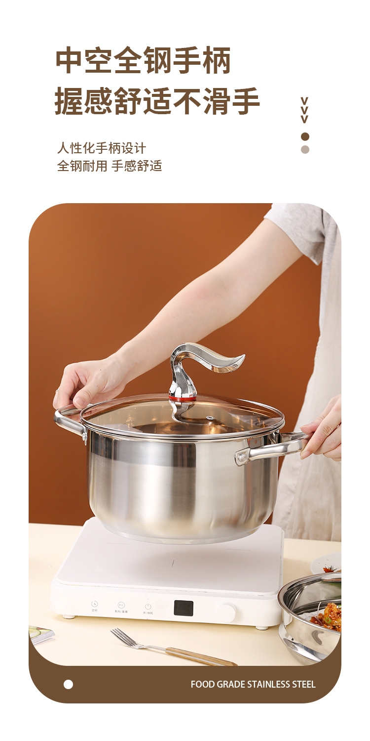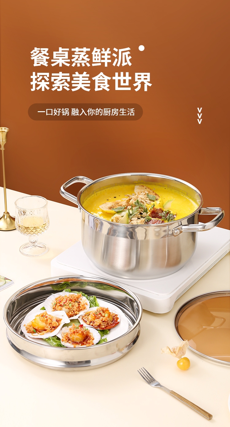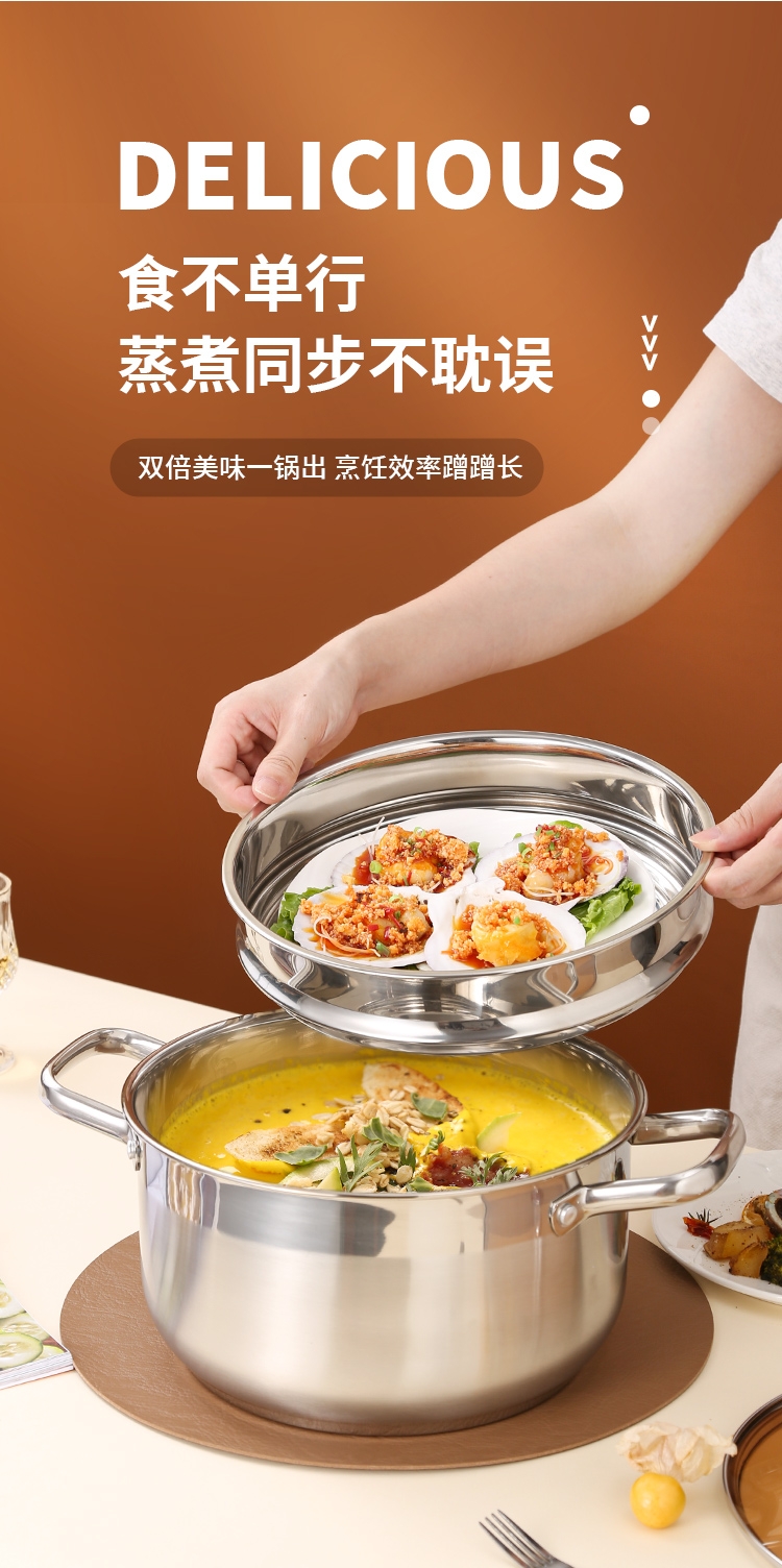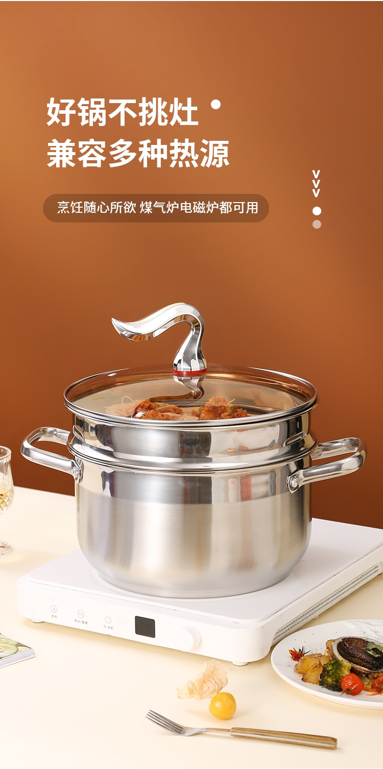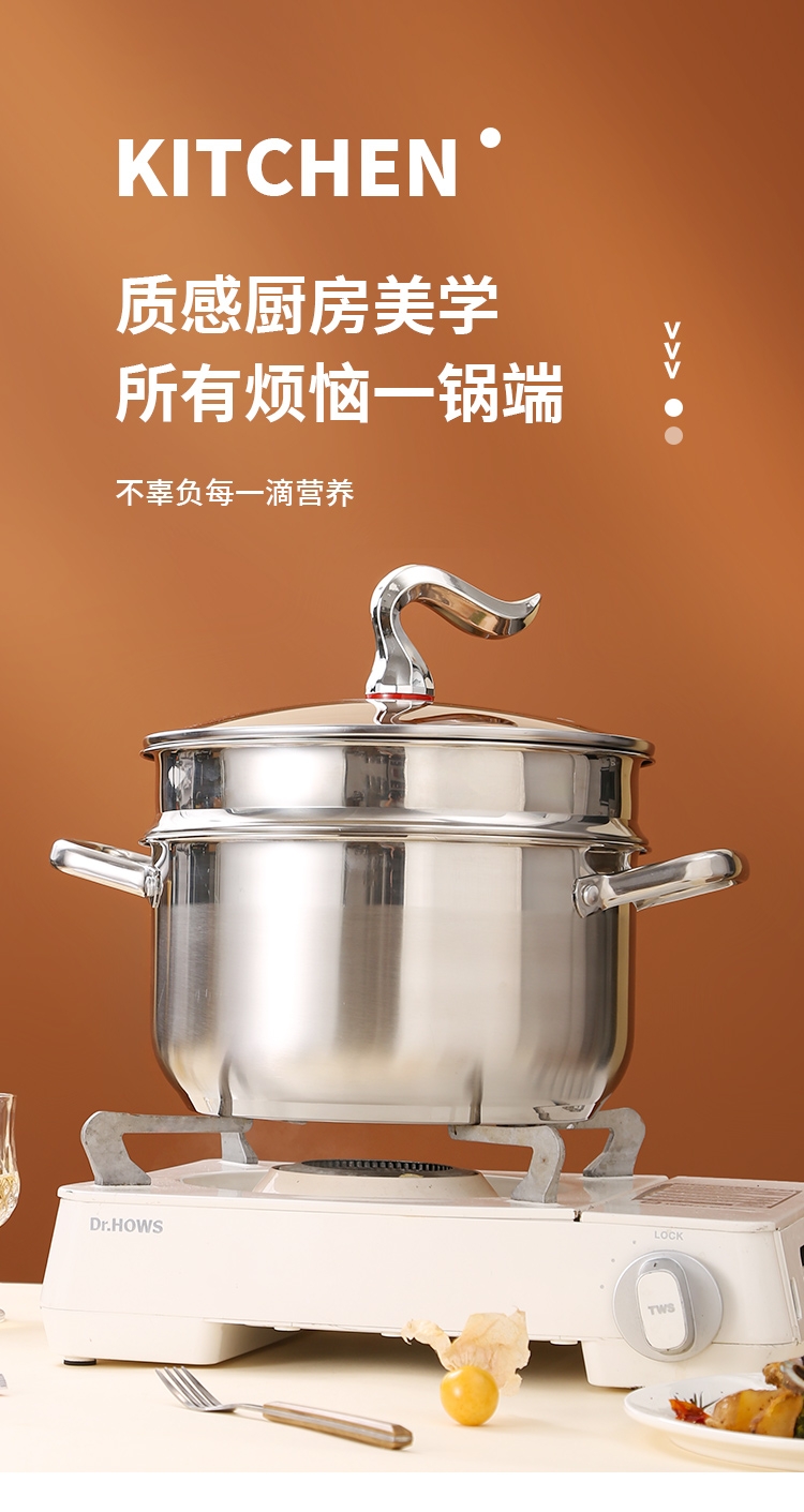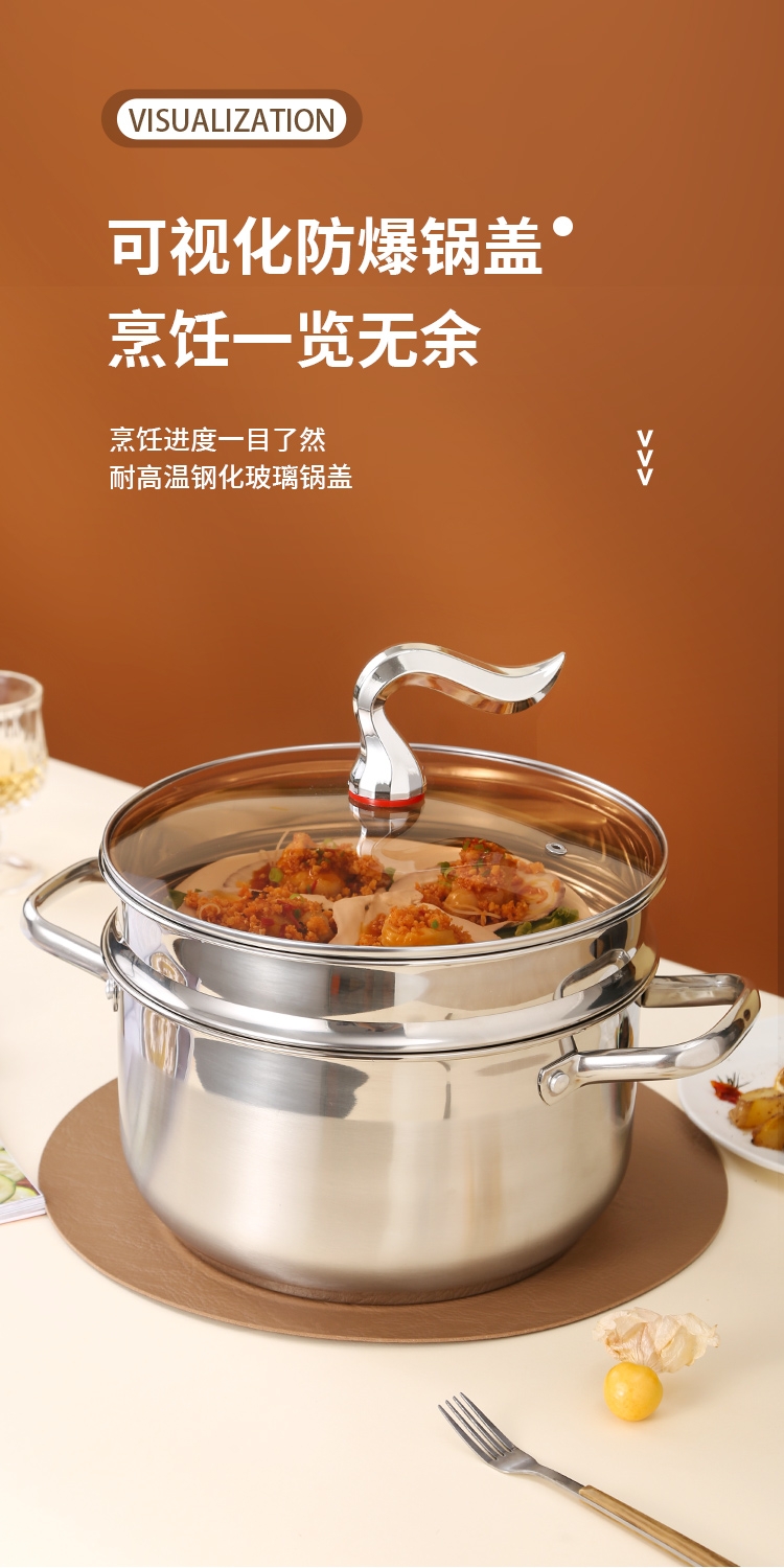 采用高品质不锈钢基材精工制作,质感厚重;当烟雾蒸腾,开锅即开运,好运一整年;兼容多种炉具,可用于燃气炉,电磁炉、电陶炉
