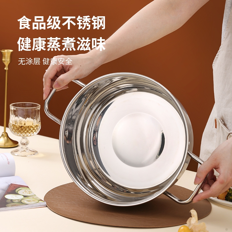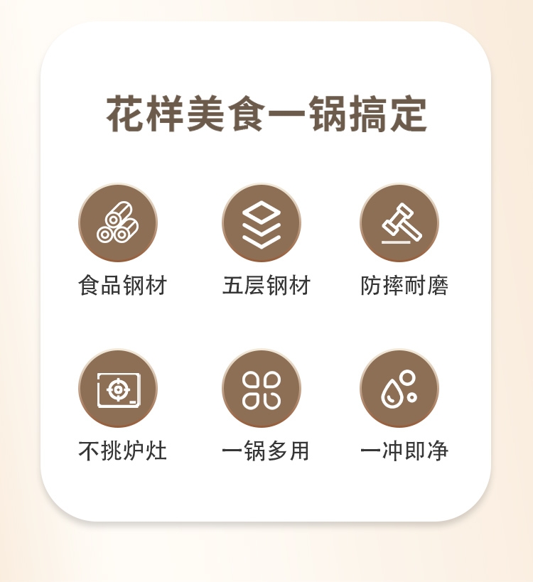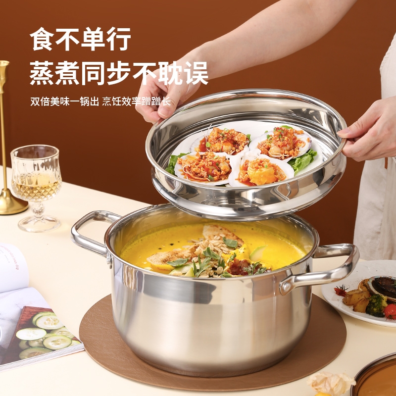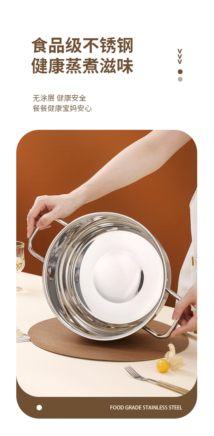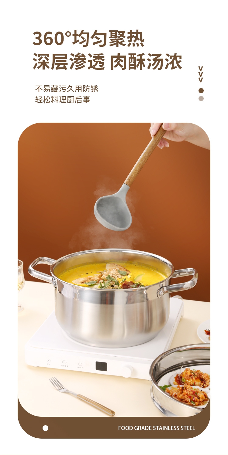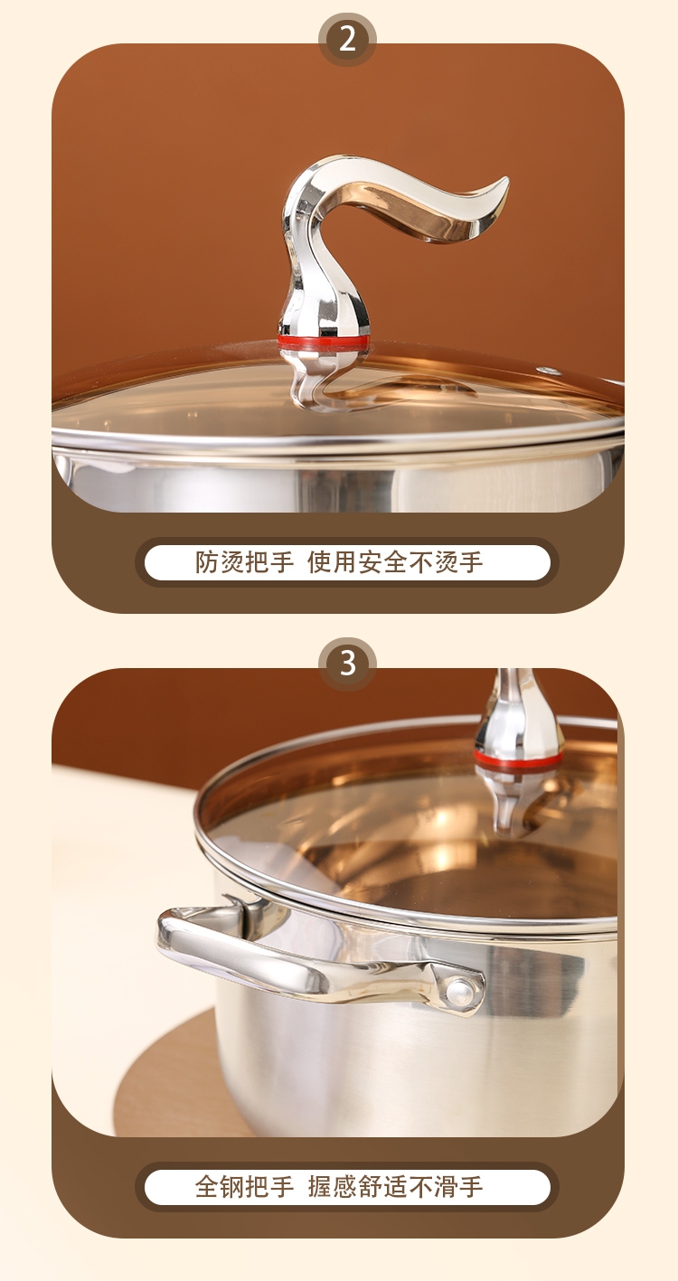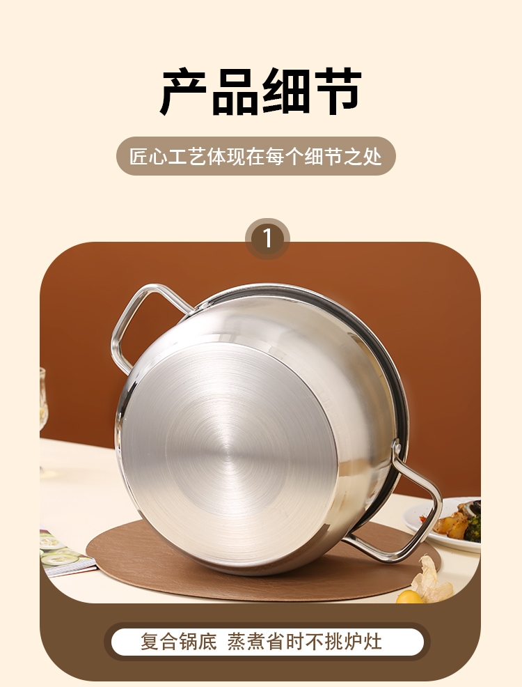 采用高品质不锈钢基材精工制作,质感厚重;当烟雾蒸腾,开锅即开运,好运一整年;兼容多种炉具,可用于燃气炉,电磁炉、电陶炉