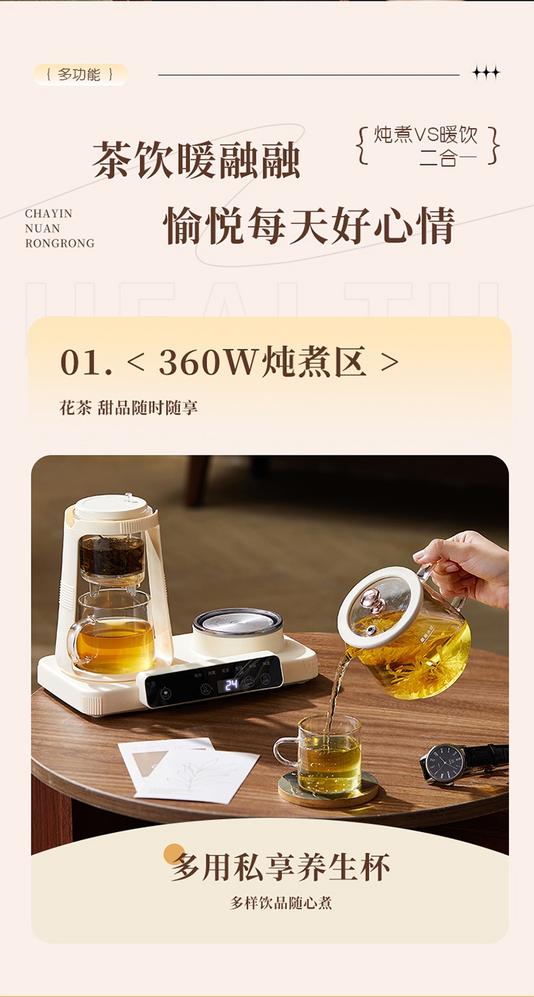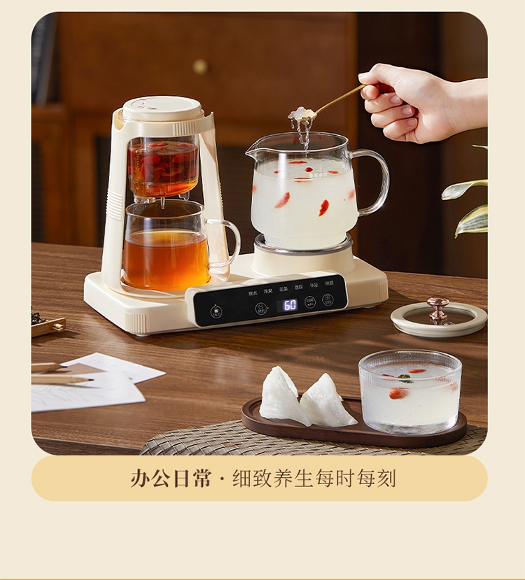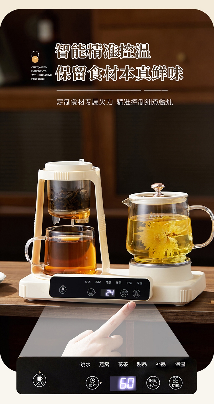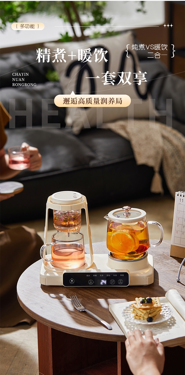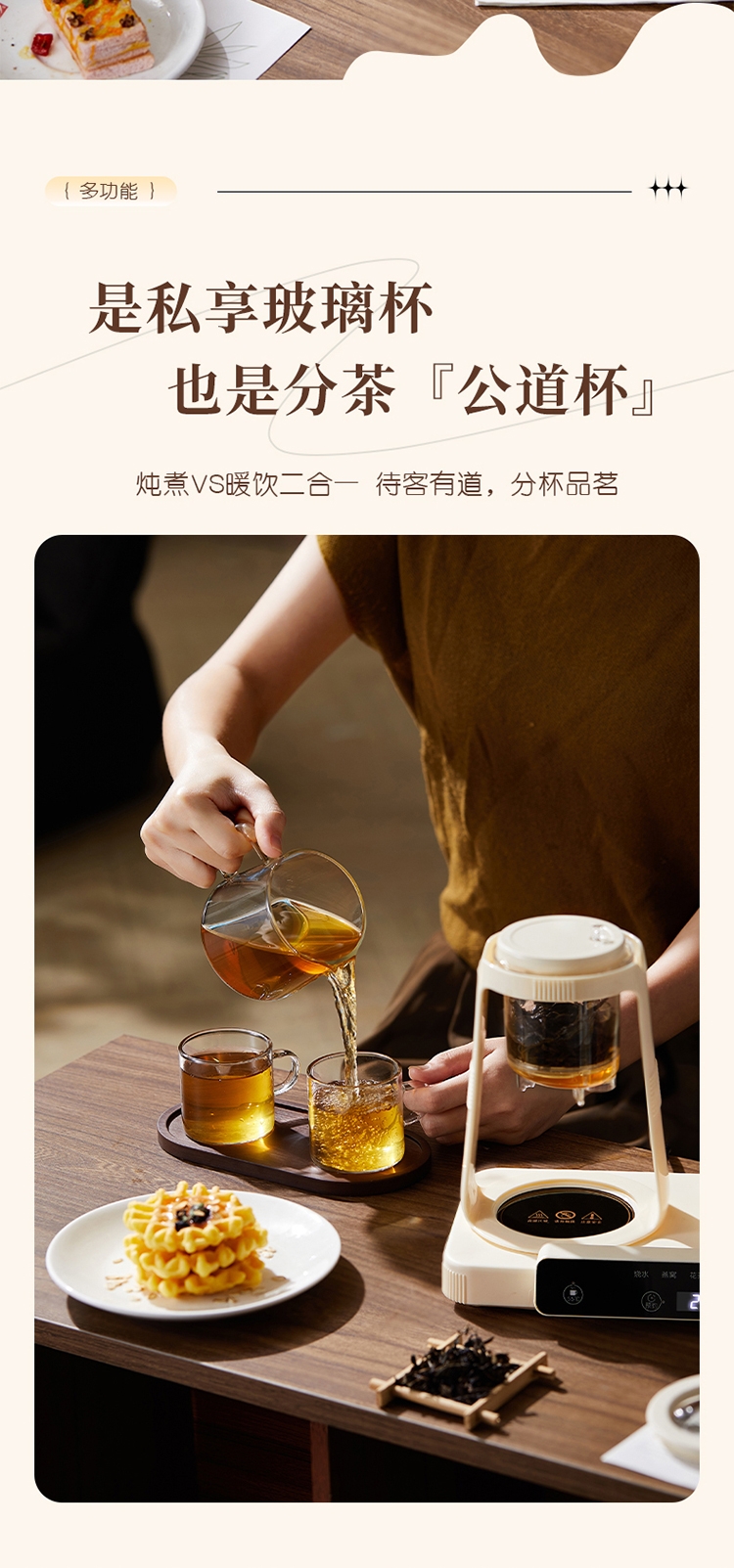 暖饮+炖煮二合一;双杯设计,自带茶水分离配置,提杯即可享受畅饮;智能操控面板,多种功能,轻松切换;可预约炖煮及保温,细煮慢炖精准控温