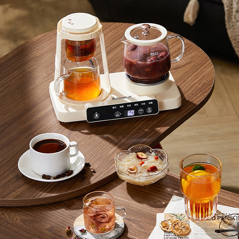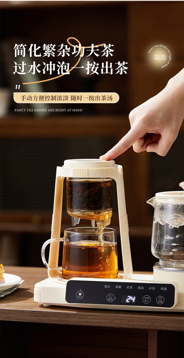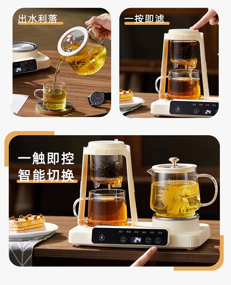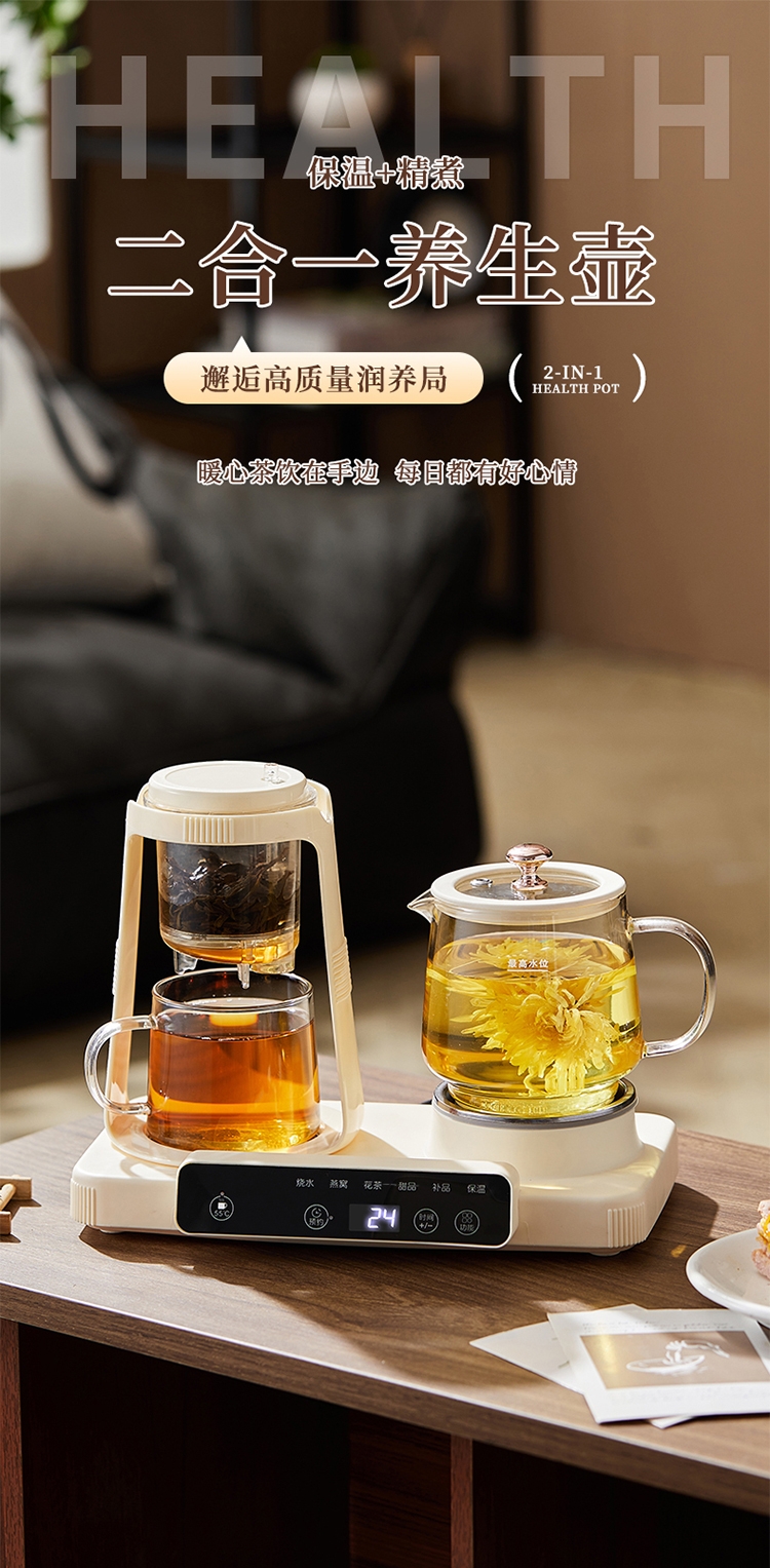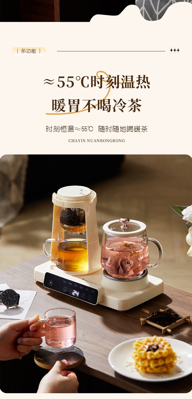 暖饮+炖煮二合一;双杯设计,自带茶水分离配置,提杯即可享受畅饮;智能操控面板,多种功能,轻松切换;可预约炖煮及保温,细煮慢炖精准控温