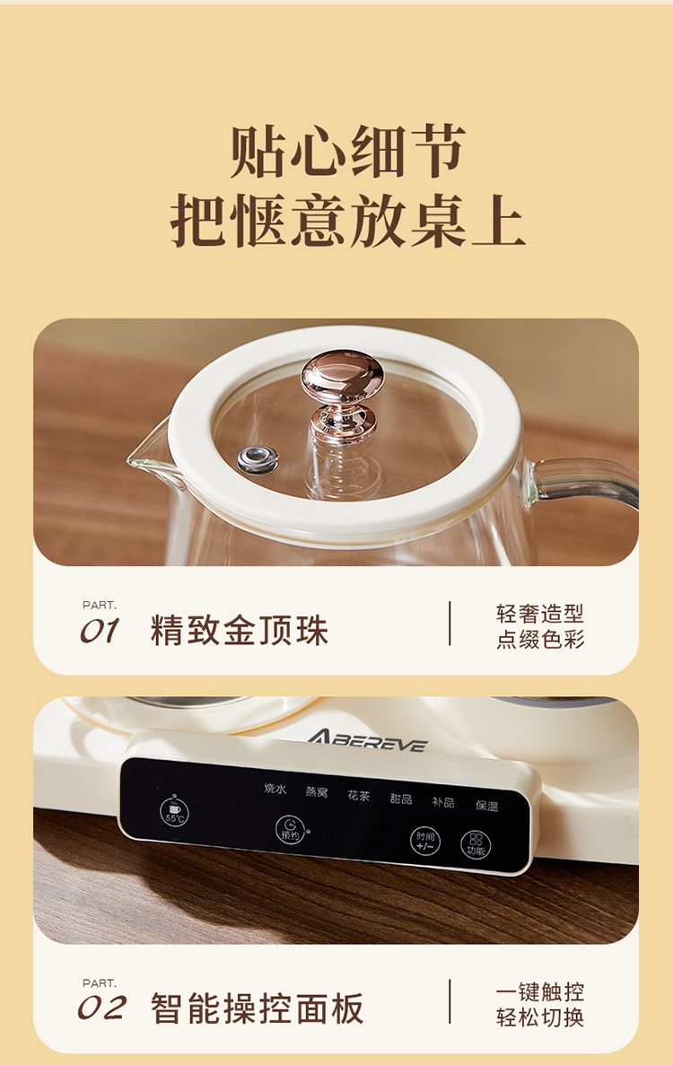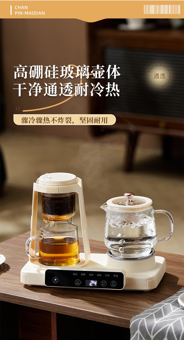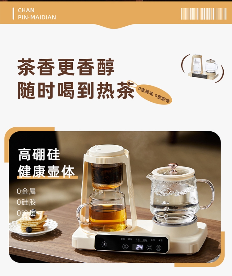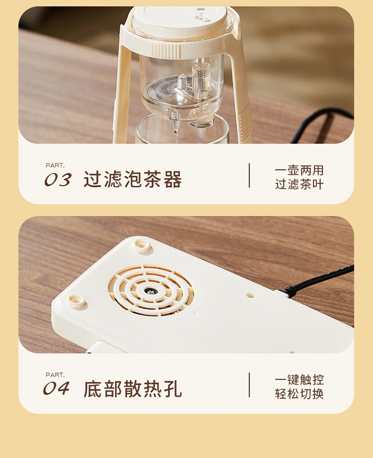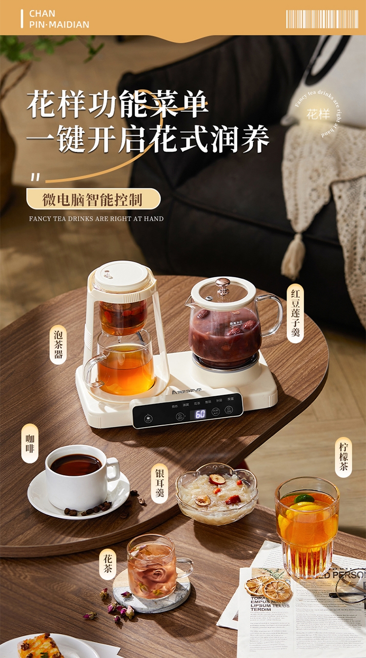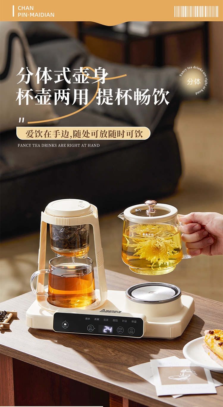 暖饮+炖煮二合一;双杯设计,自带茶水分离配置,提杯即可享受畅饮;智能操控面板,多种功能,轻松切换;可预约炖煮及保温,细煮慢炖精准控温