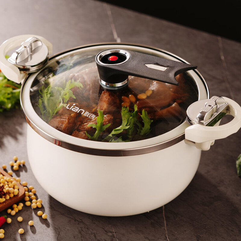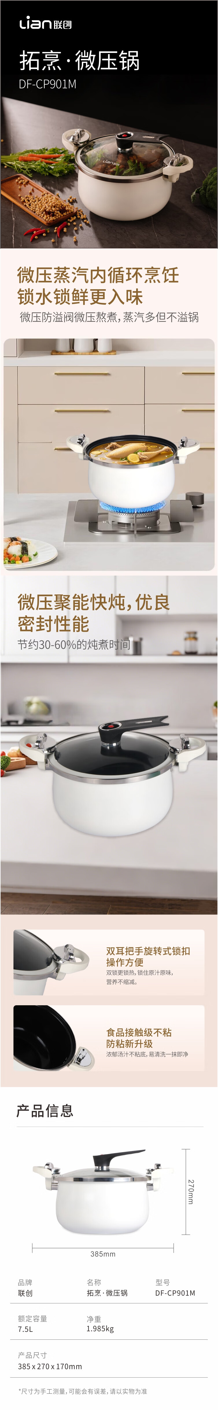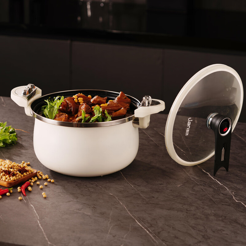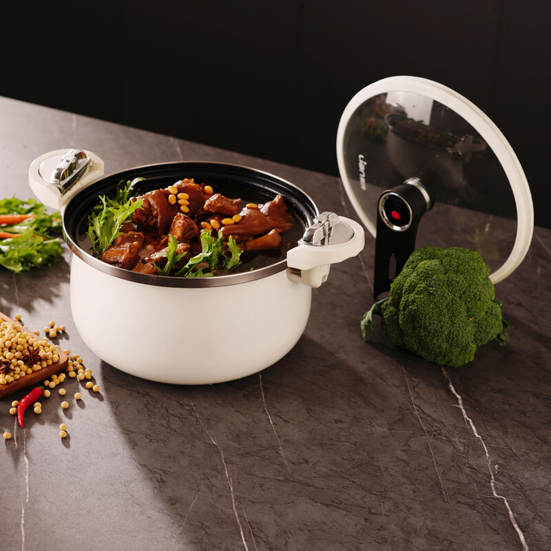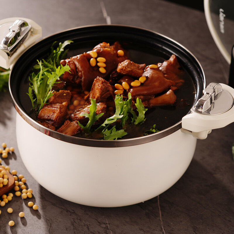 微压蒸汽内循环烹饪,锁水锁鲜更入味;微压防溢阀微压熬煮,蒸汽多但不溢锅;食品接触级不粘,防粘新升级浓郁汤汁不粘底,易清洗