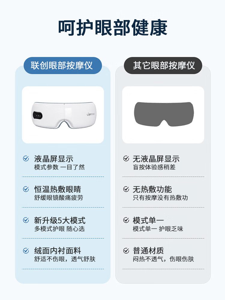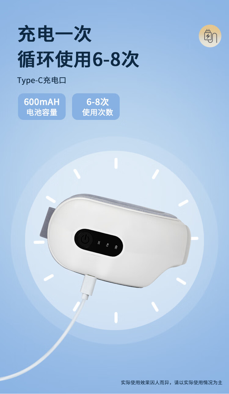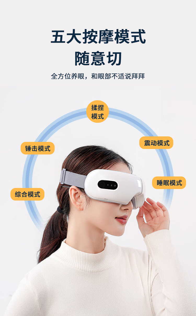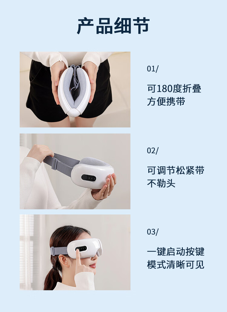 液晶屏显示,模式参数,一目了然;;恒温热敷眼睛,舒缓眼睛酸痛疲劳干涩;安全柔软的羊津绒材质;一键启动,操作简单;可180度折叠设计,携带更方便