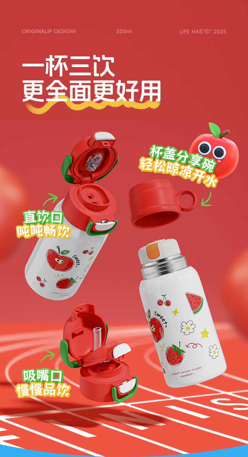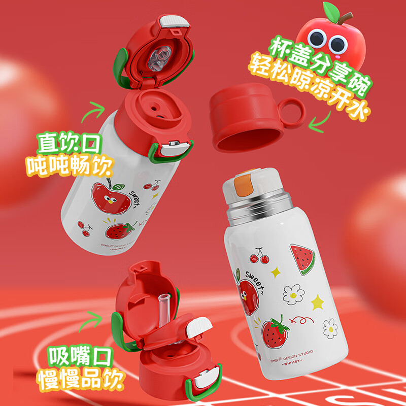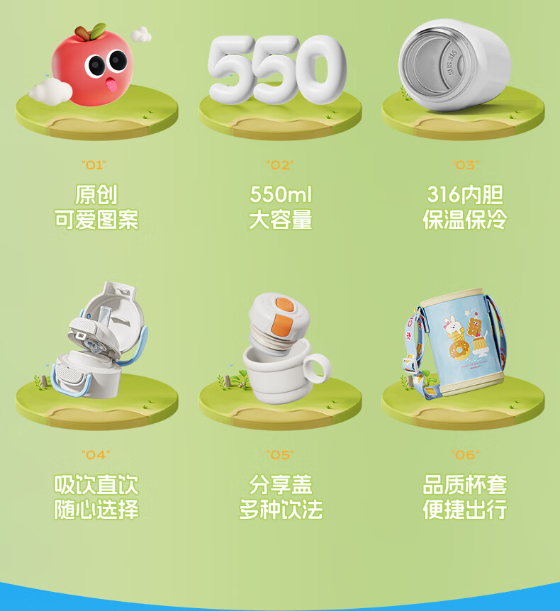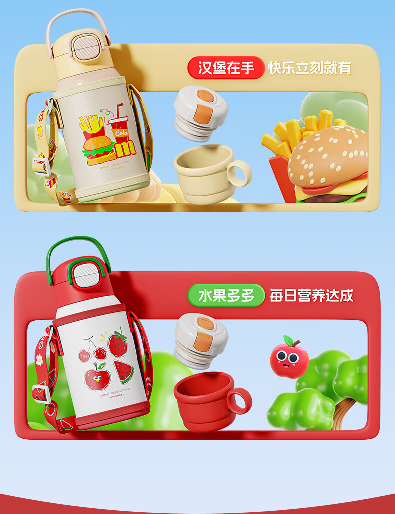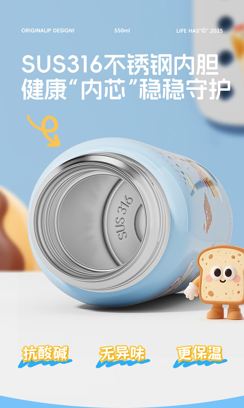 甄选316钢材 耐腐蚀更保温;碗盖&双饮盖 饮水多花样;可爱甜美杯套 防摔保护