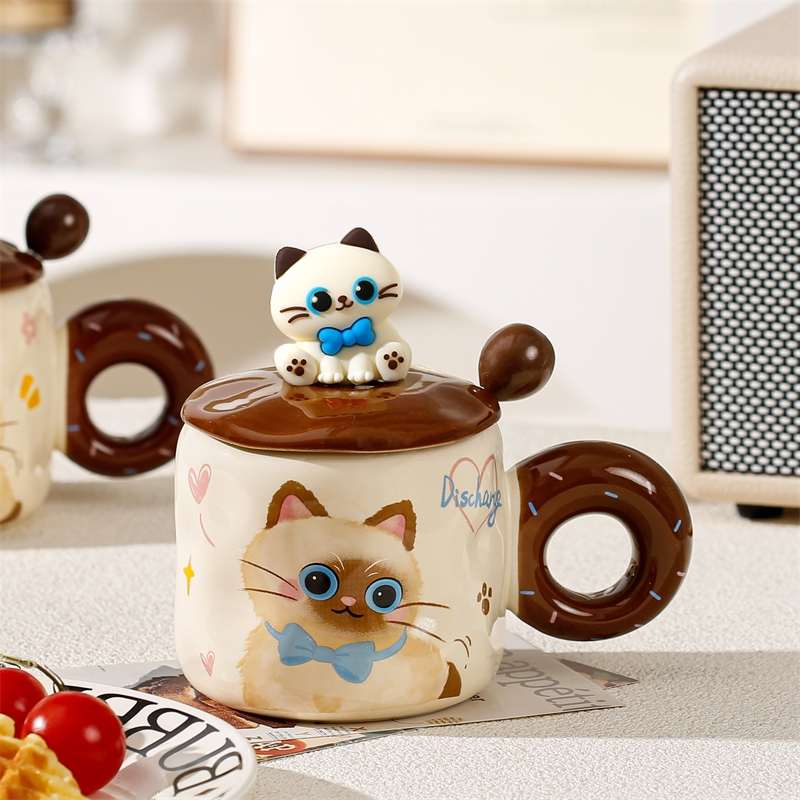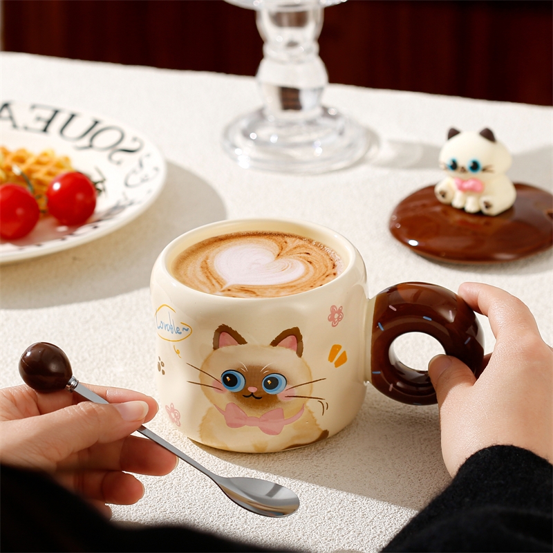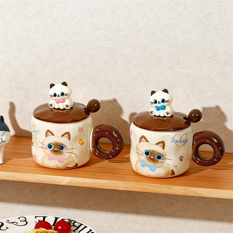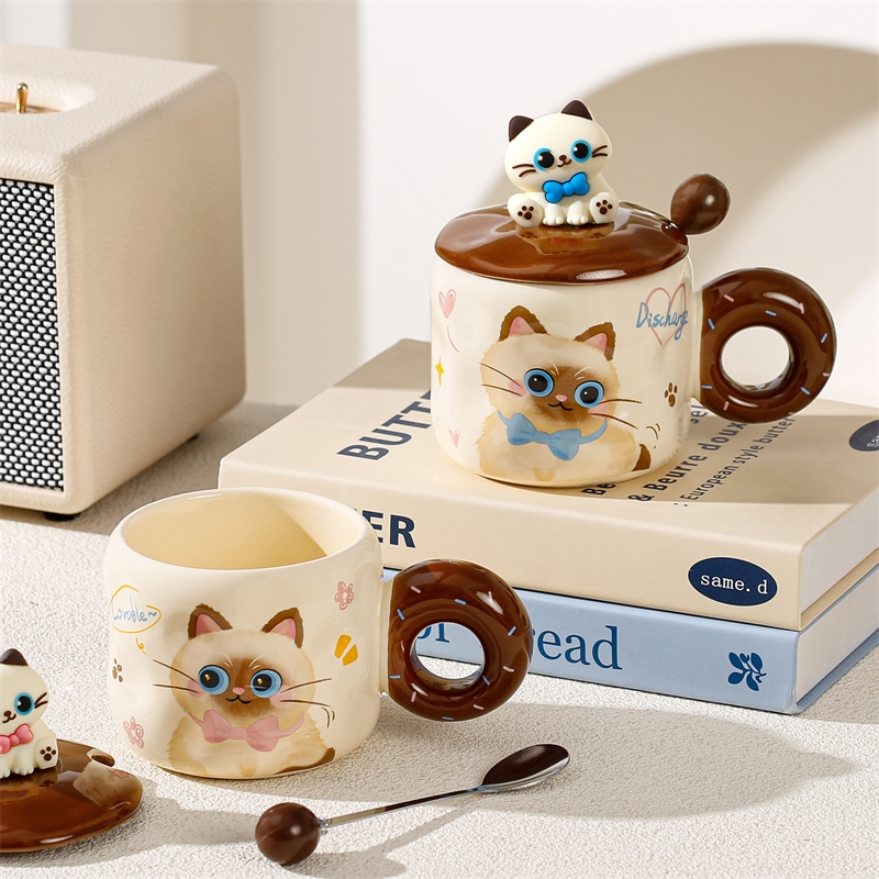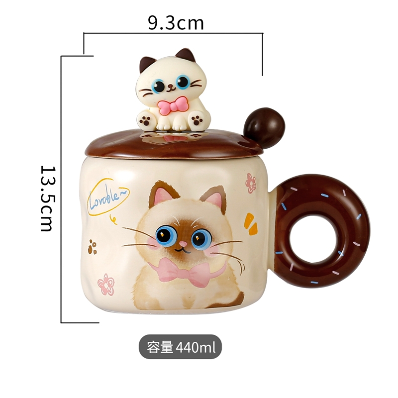 卡通萌趣猫咪形象;大容量水杯,甜甜圈手柄;含盖勺
