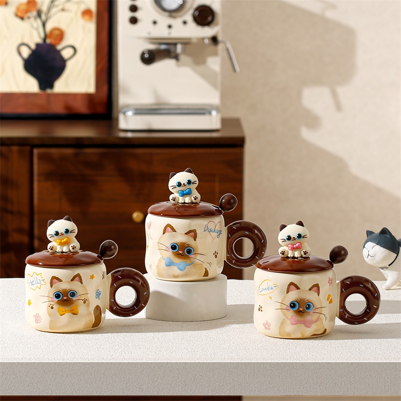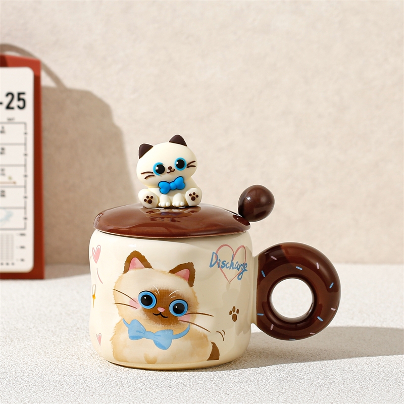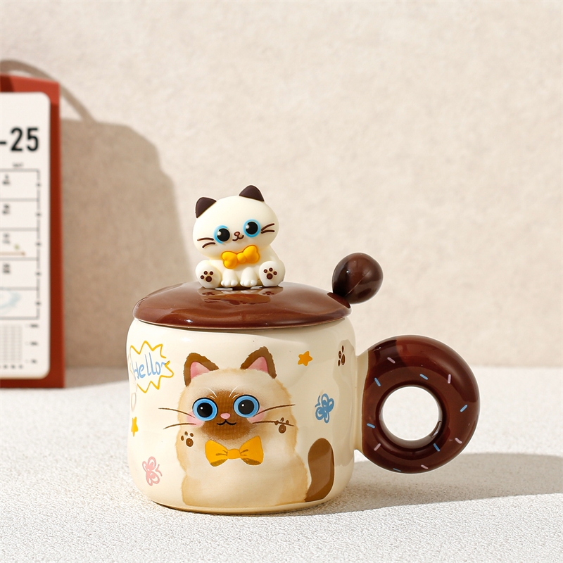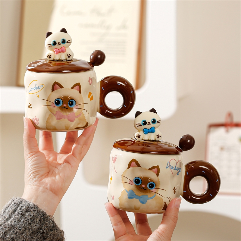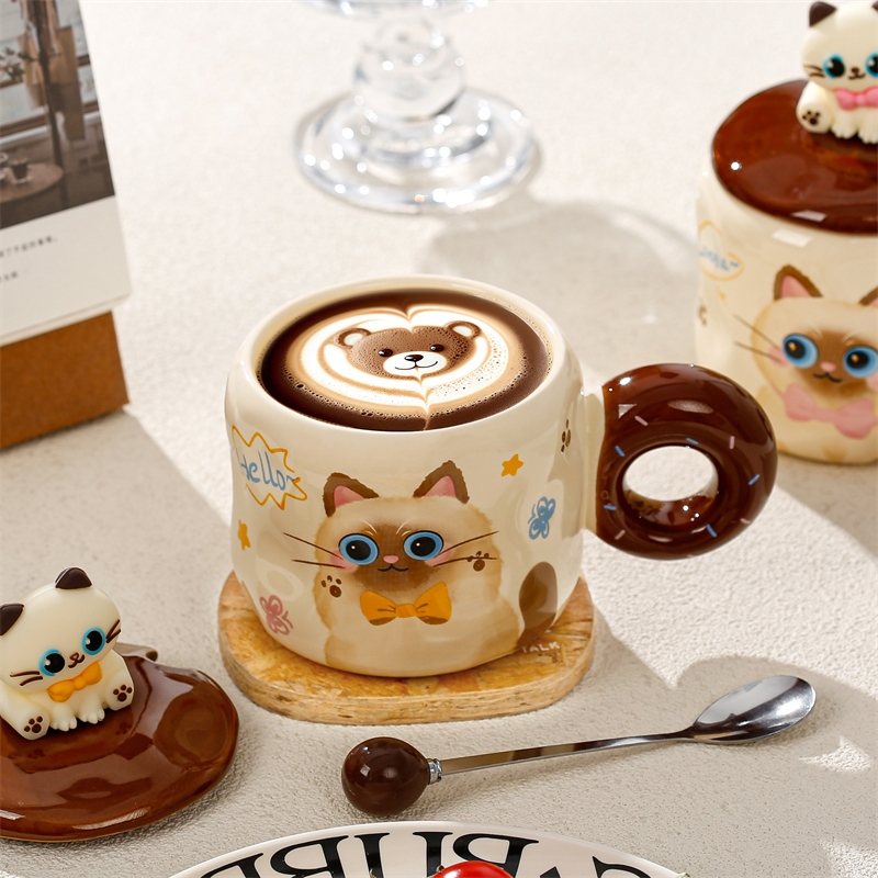 卡通萌趣猫咪形象;大容量水杯,甜甜圈手柄;含盖勺
