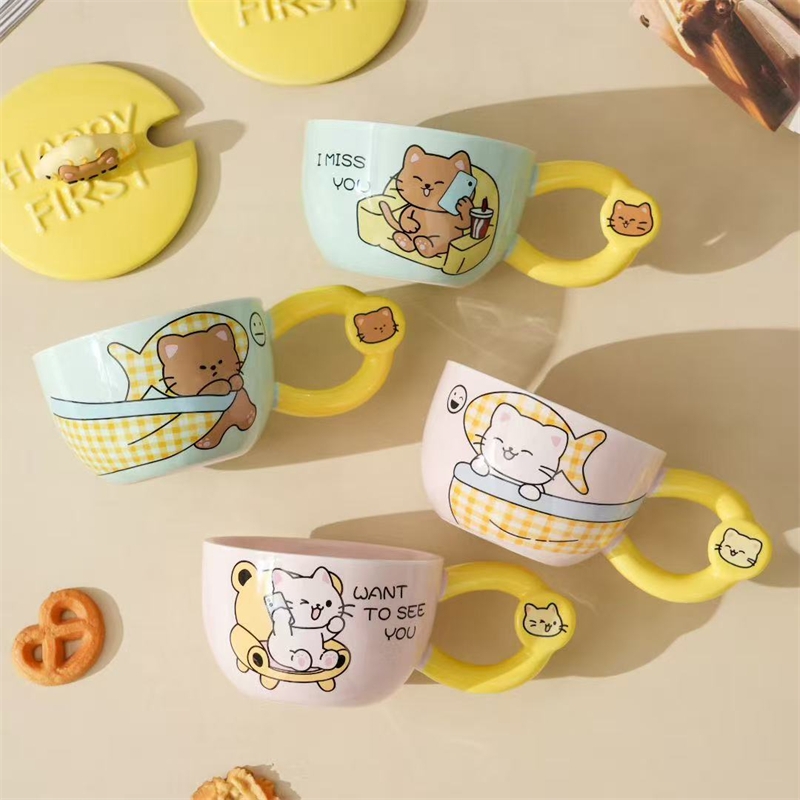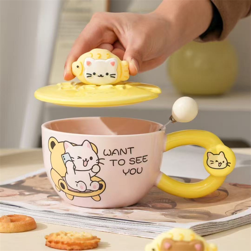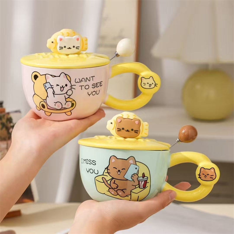卡通乐趣猫咪图案;哑光色釉杯;含盖勺