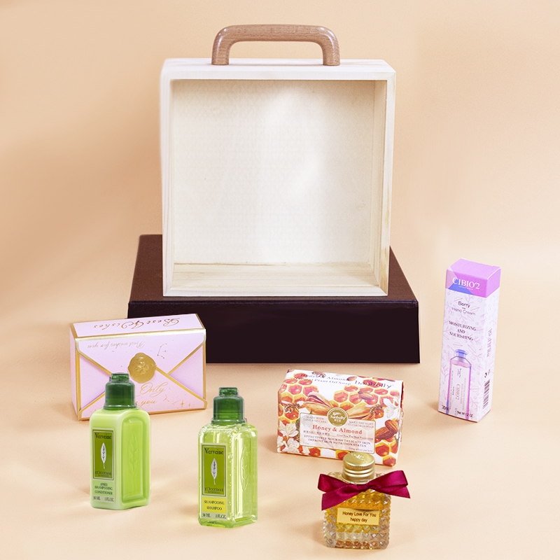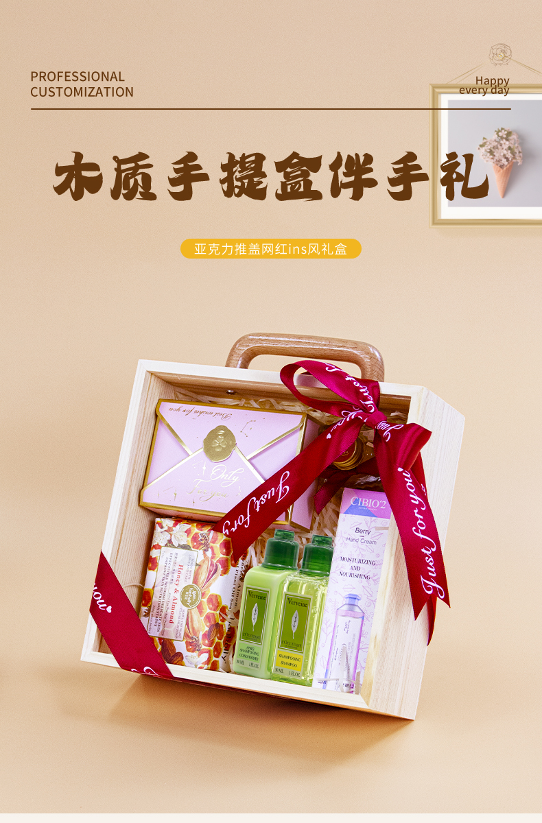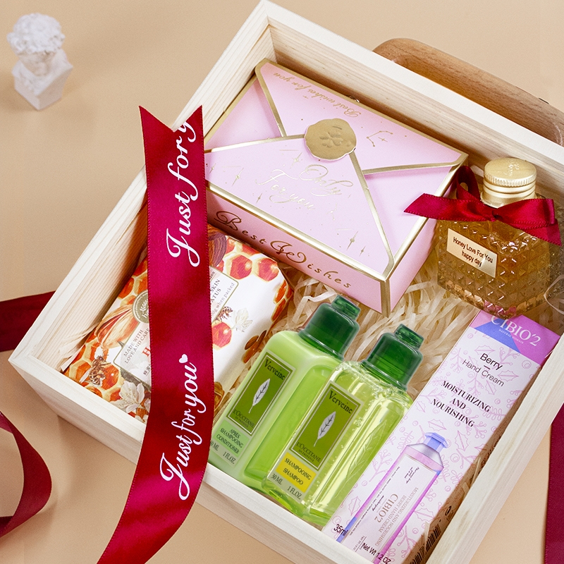 原木质感礼盒,欧舒丹洗护 + 蜂蜜,实用又暖心;糖果 + 香皂,甜韵满满,伴手礼首选;丝巾点缀,木质手提设计,精致有格调