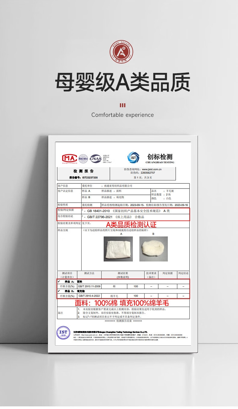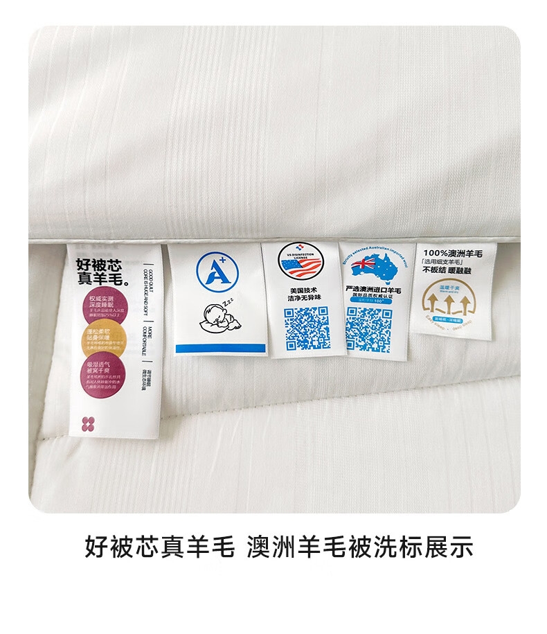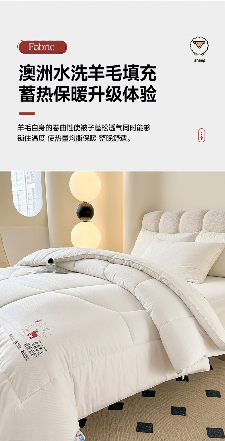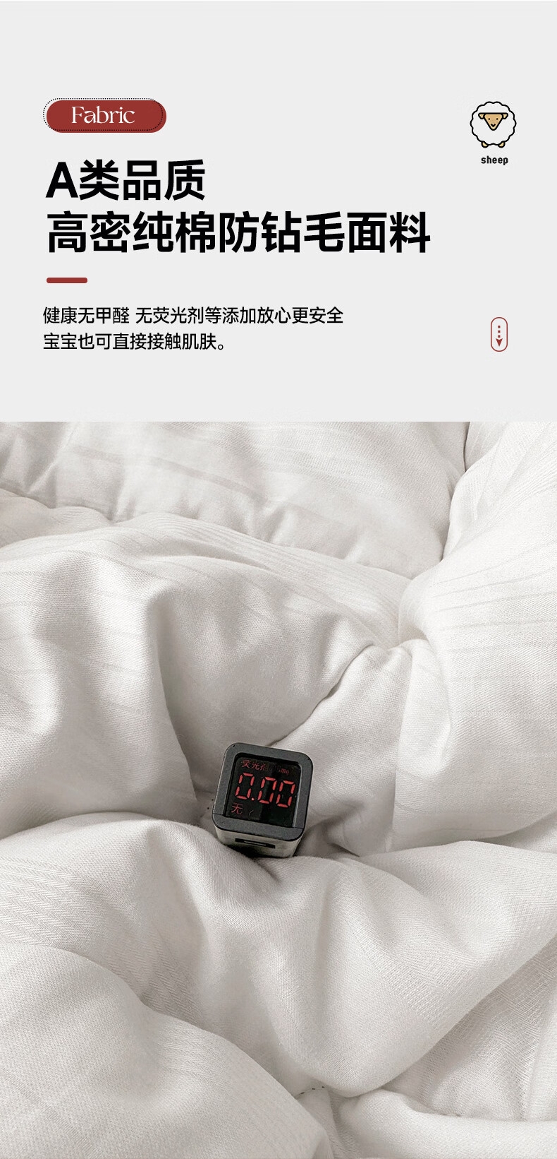 甄选高密纯棉防钻毛面料,A类品质,亲肤无添加剂;优选澳洲高品质水洗羊毛填充,蓄热保暖,整晚舒适睡眠;三明治分层设计,升级睡眠体验,锁住温度,柔软防钻毛