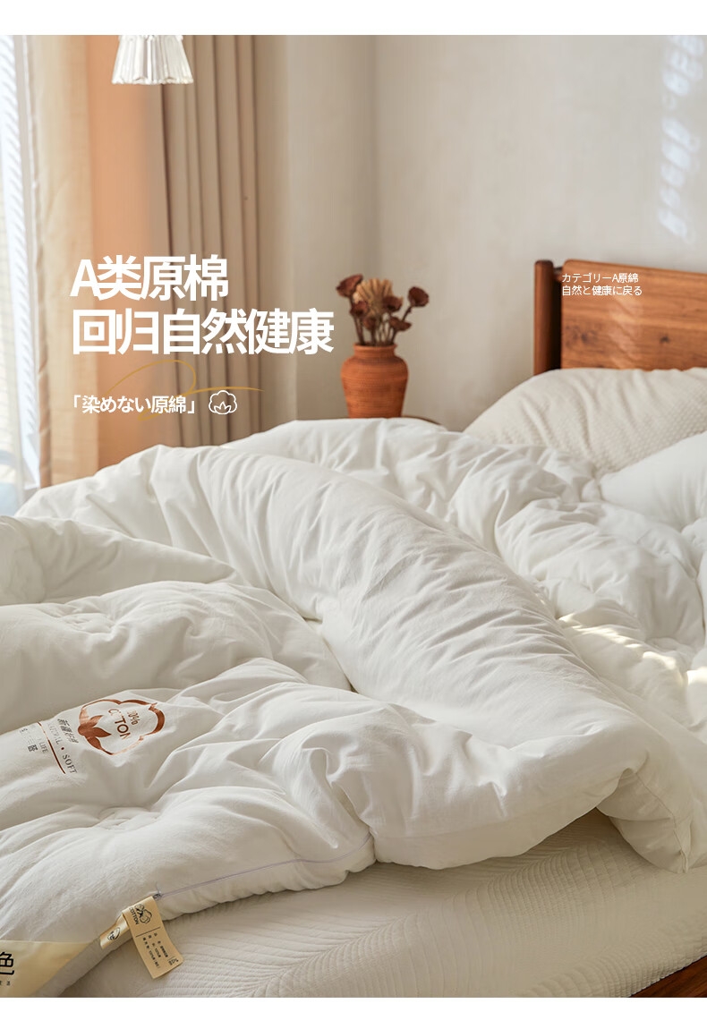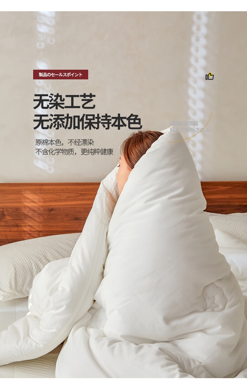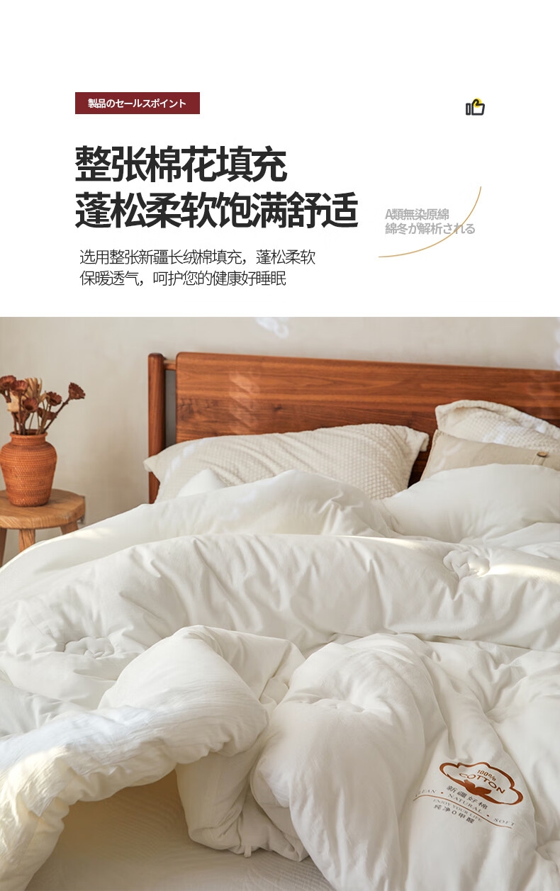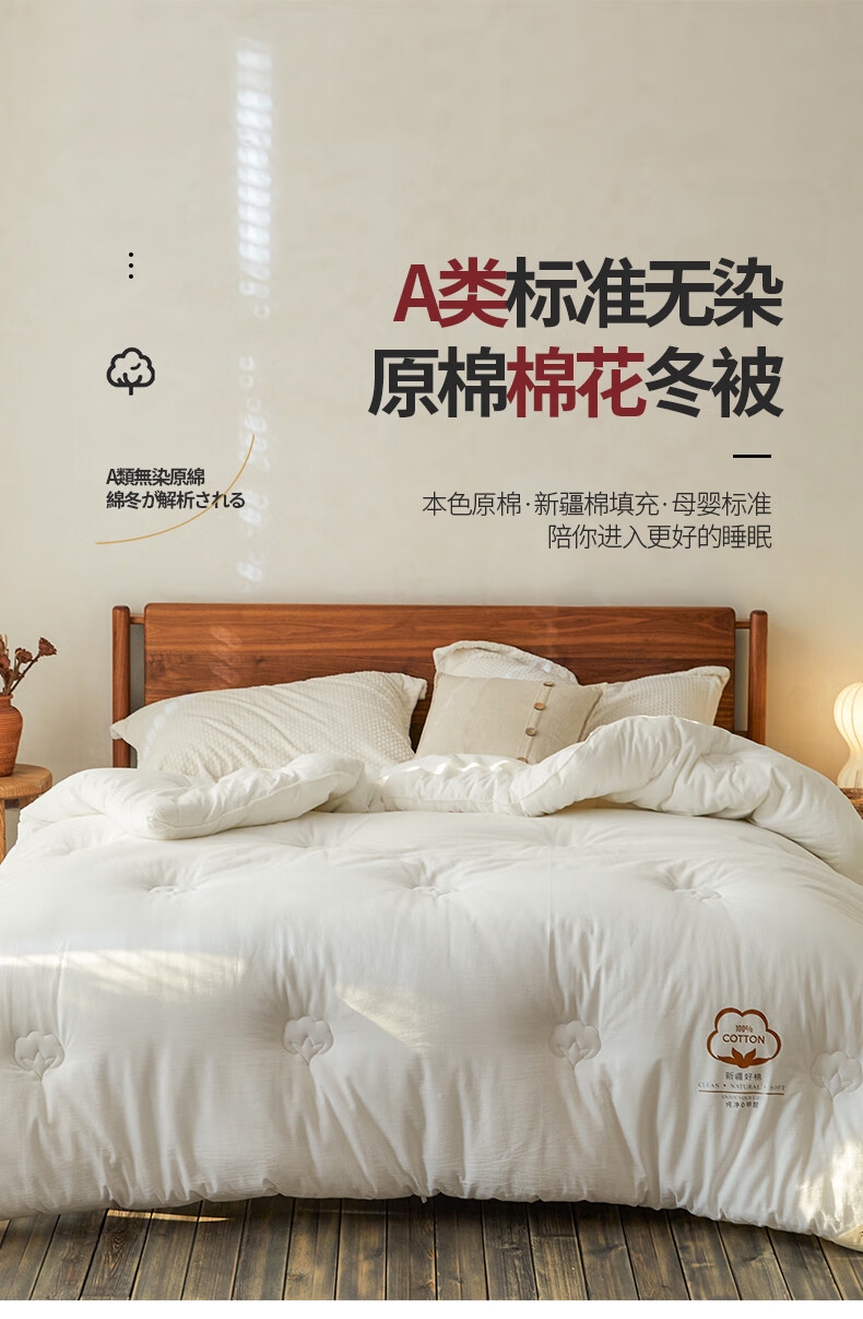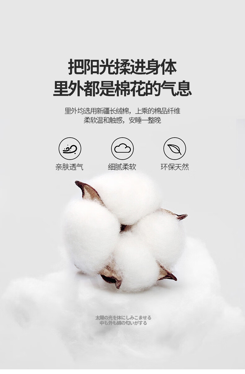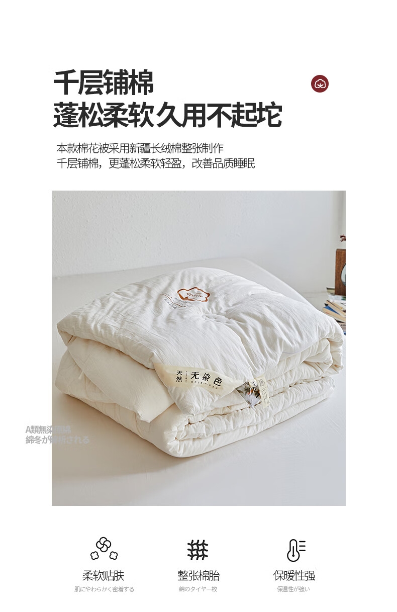 甄选A类原棉棉花面料,无经漂染,肌理柔感,触感柔软;内芯采用整张新疆长绒棉填充,千层铺棉,更蓬松柔软;采用定点绗缝工艺,锁住填充,不易变形,不易板结