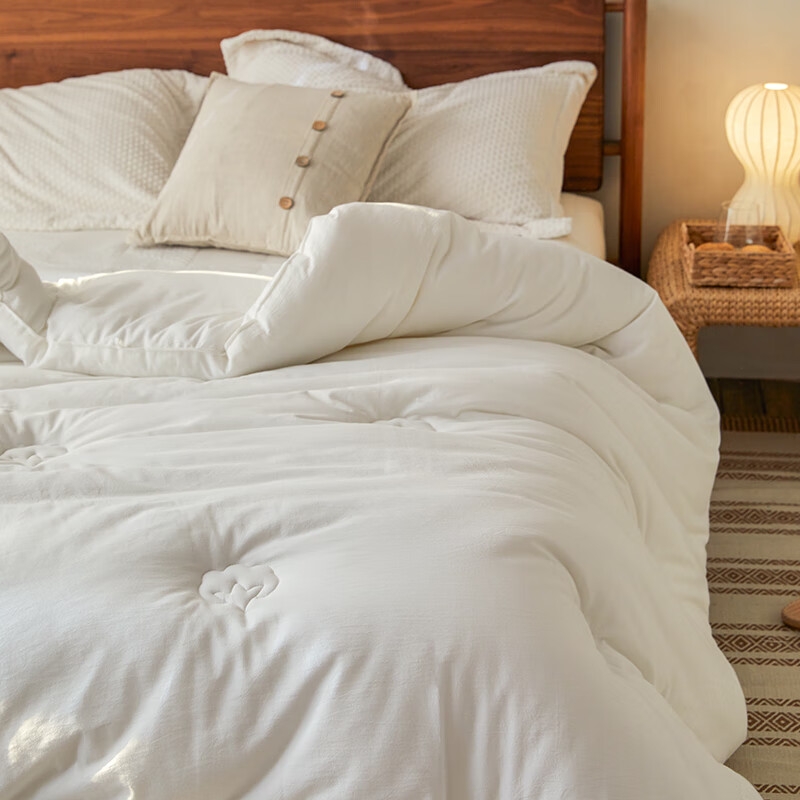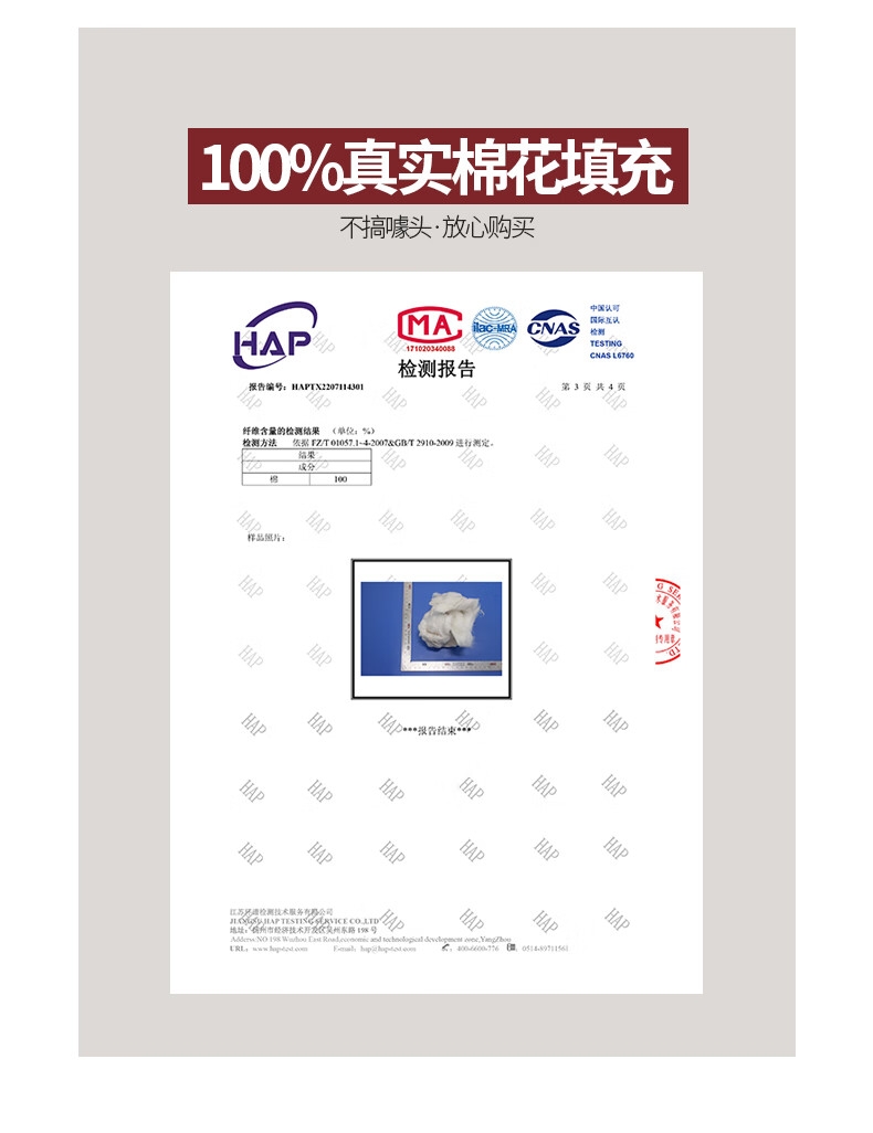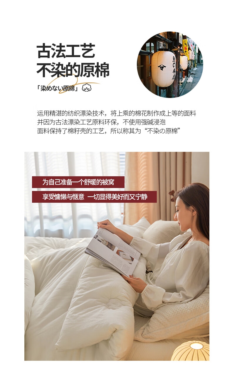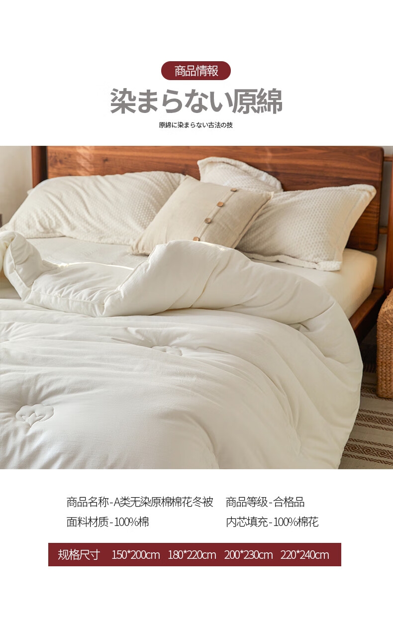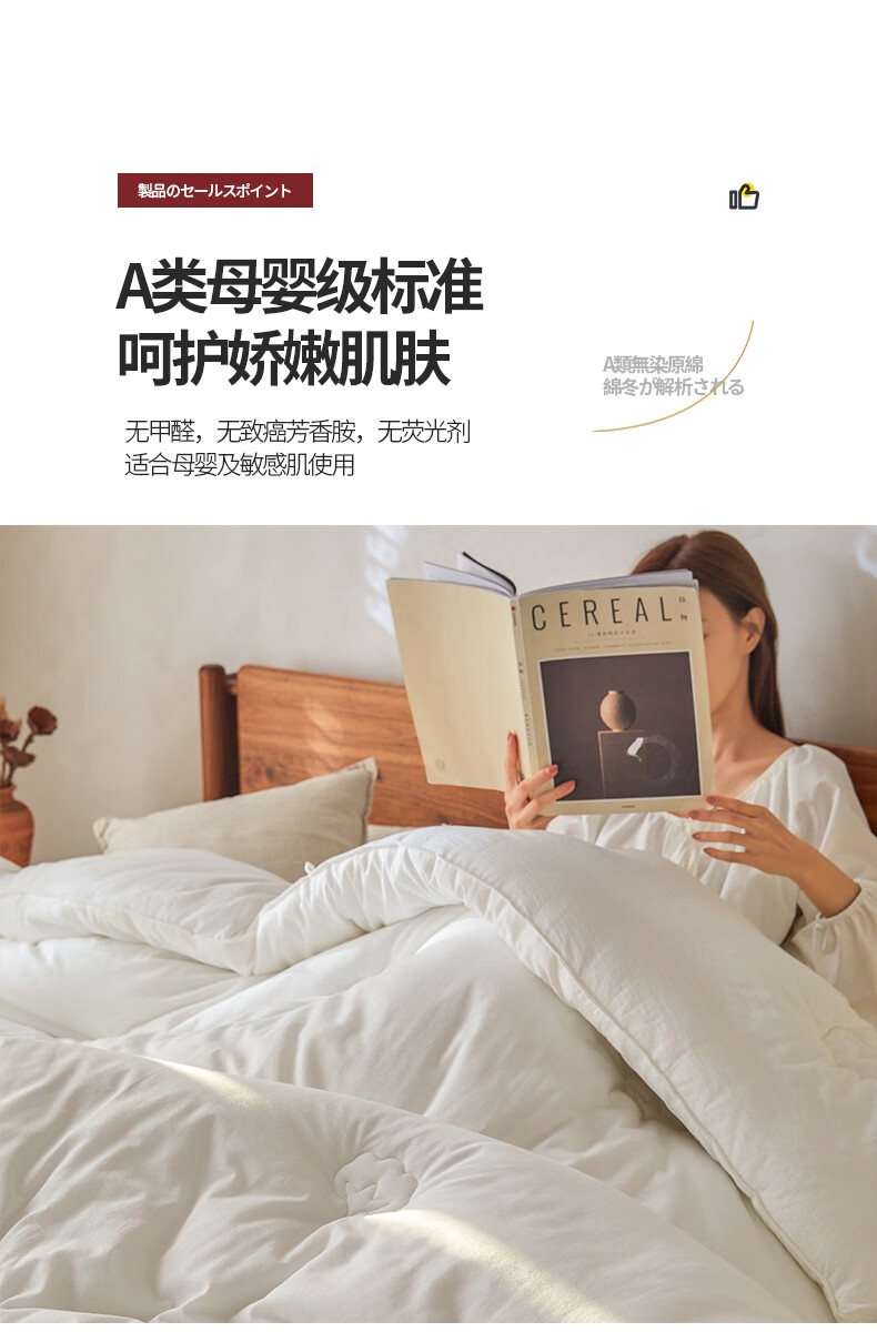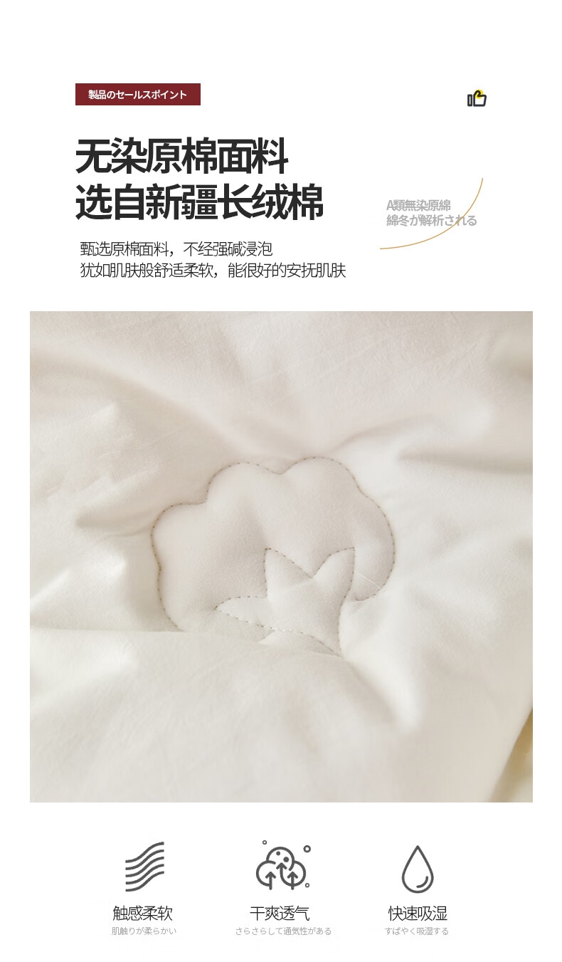 甄选A类原棉棉花面料,无经漂染,肌理柔感,触感柔软;内芯采用整张新疆长绒棉填充,千层铺棉,更蓬松柔软;采用定点绗缝工艺,锁住填充,不易变形,不易板结