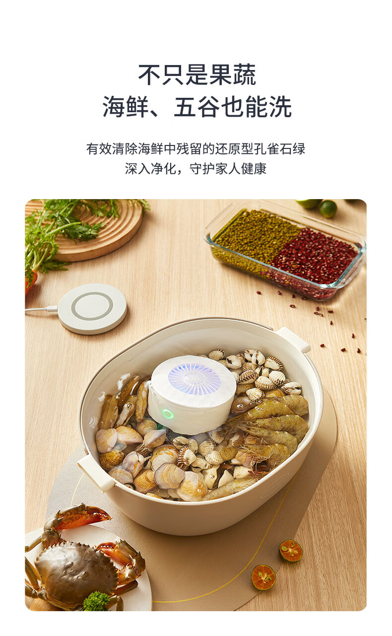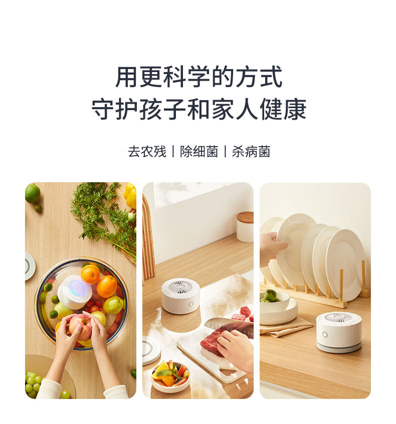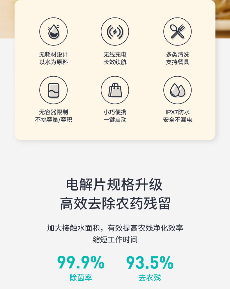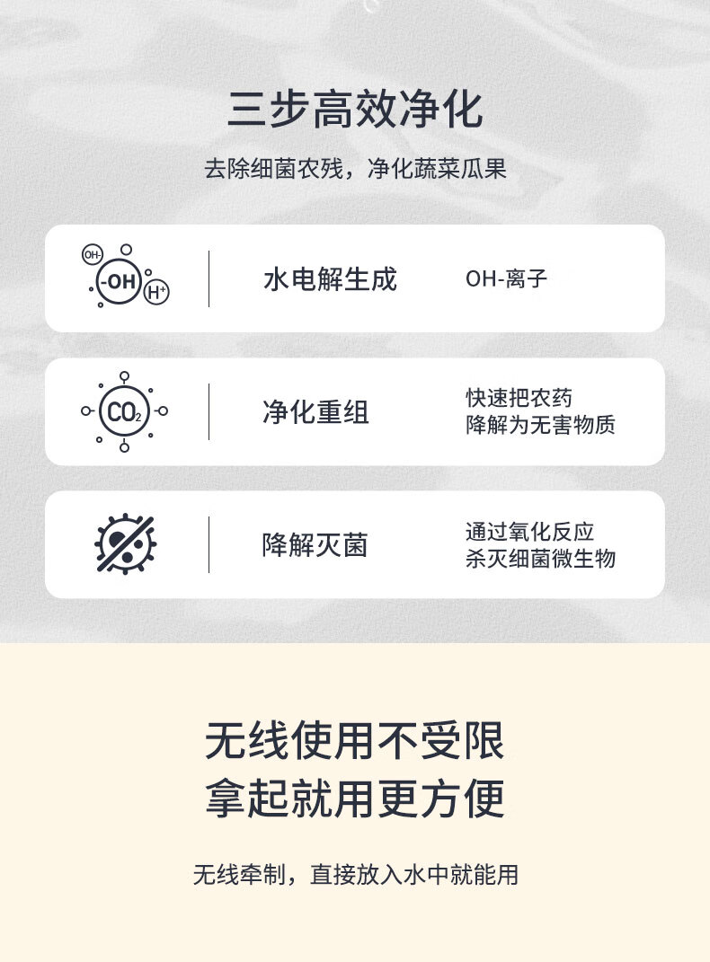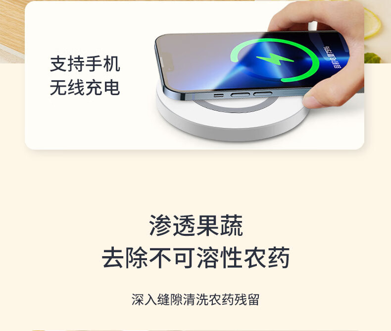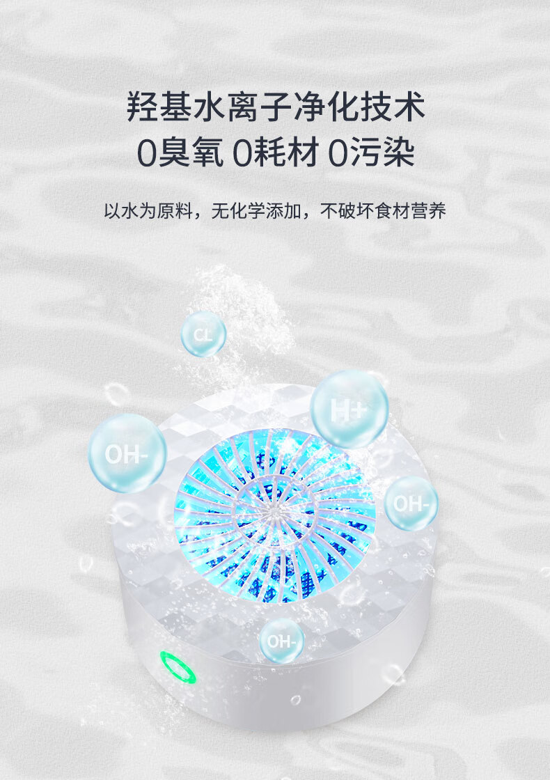 无耗材设计以水为原料,无化学添加,不破坏食材营养;杀菌去农残,智享健康净生活;无线感应充电、持久续航