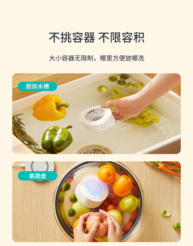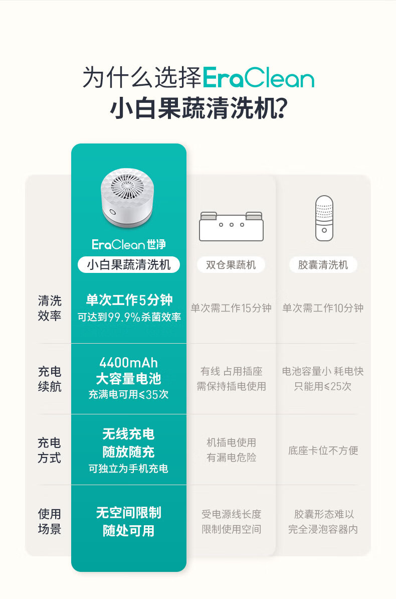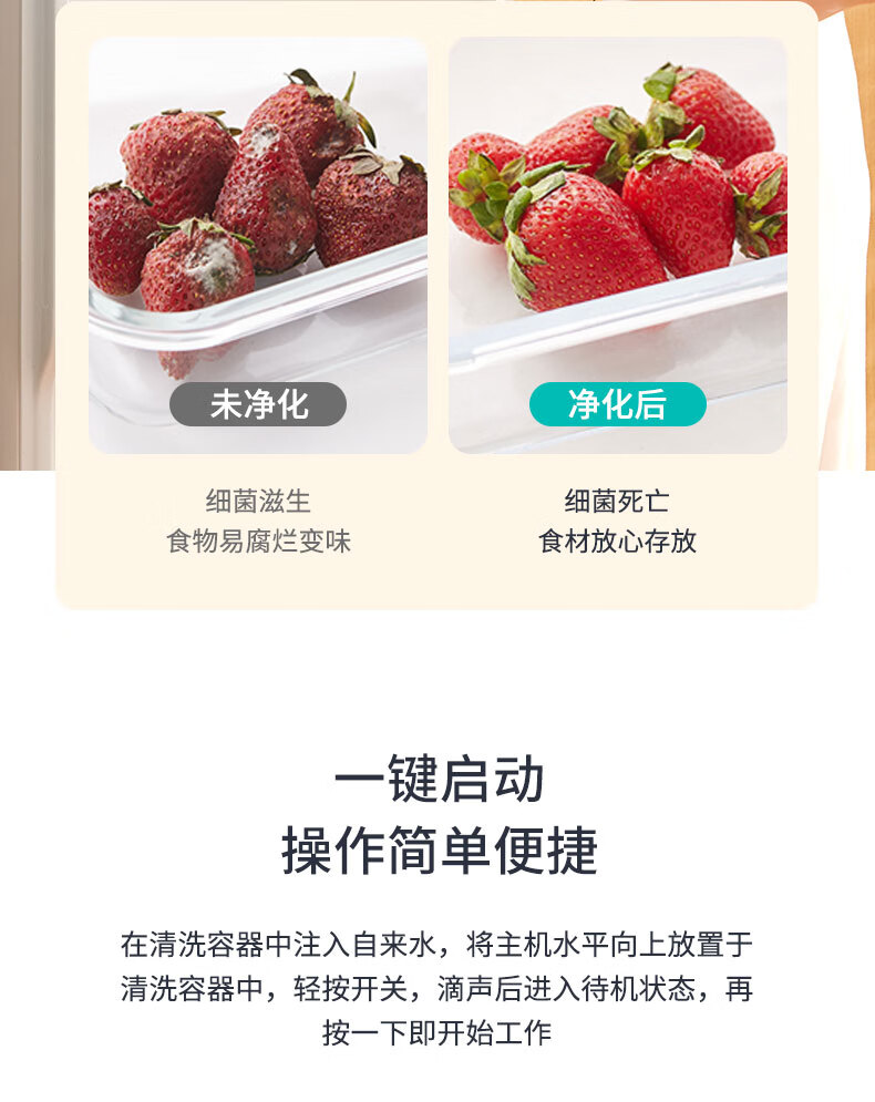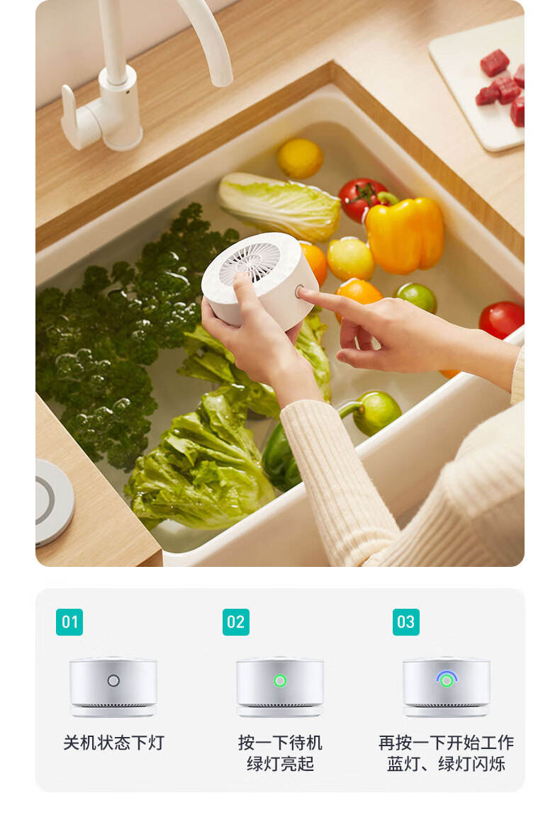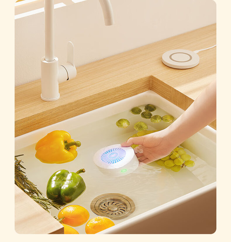 无耗材设计以水为原料,无化学添加,不破坏食材营养;杀菌去农残,智享健康净生活;无线感应充电、持久续航