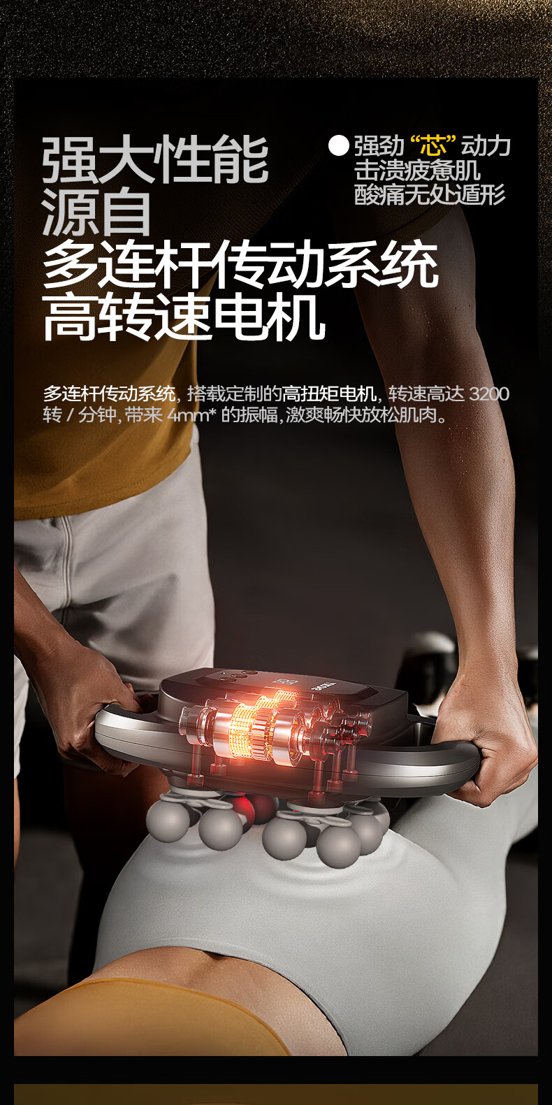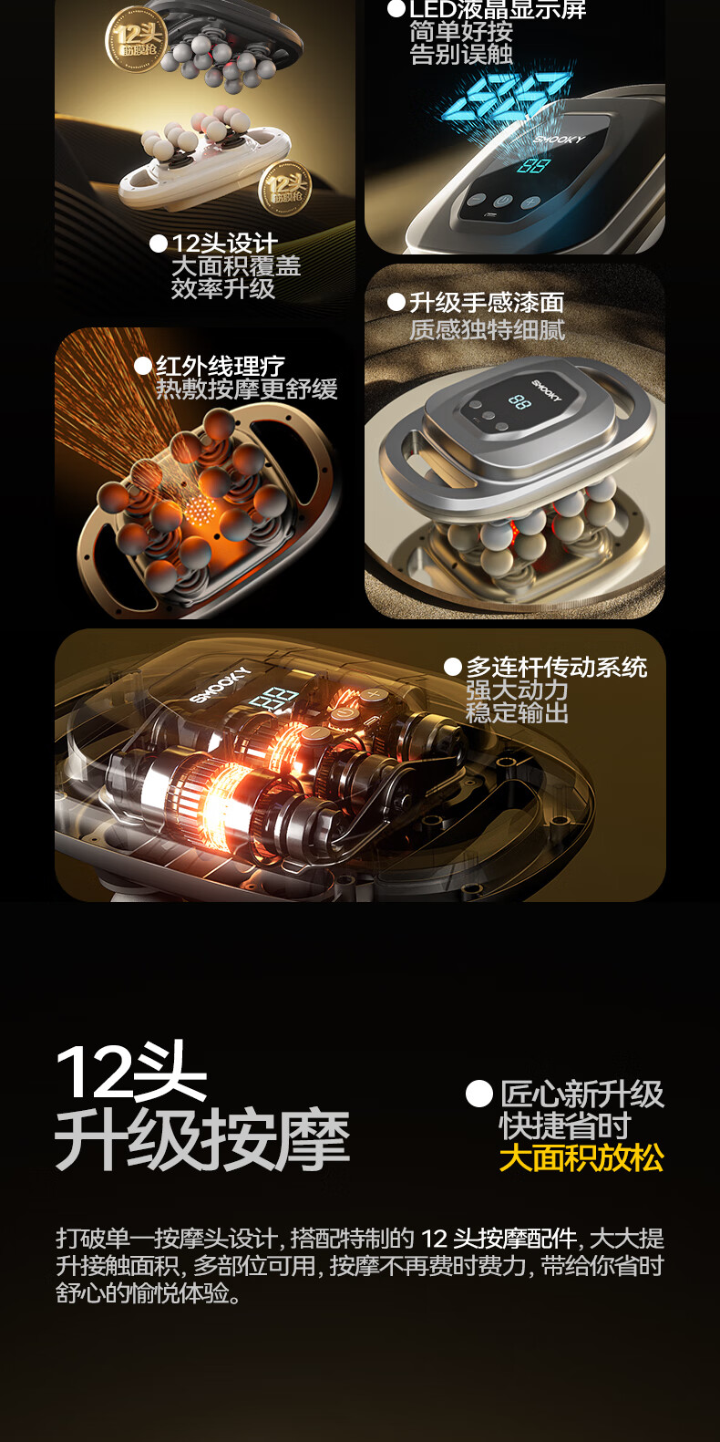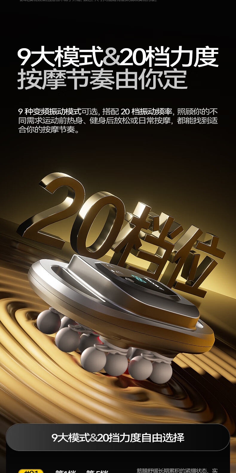 新升级12个头按摩,解放双手,大面积按摩;12个头同时高频震动,面积更大,效率更高;9组模式,20档力度,专业手法,轻快调节