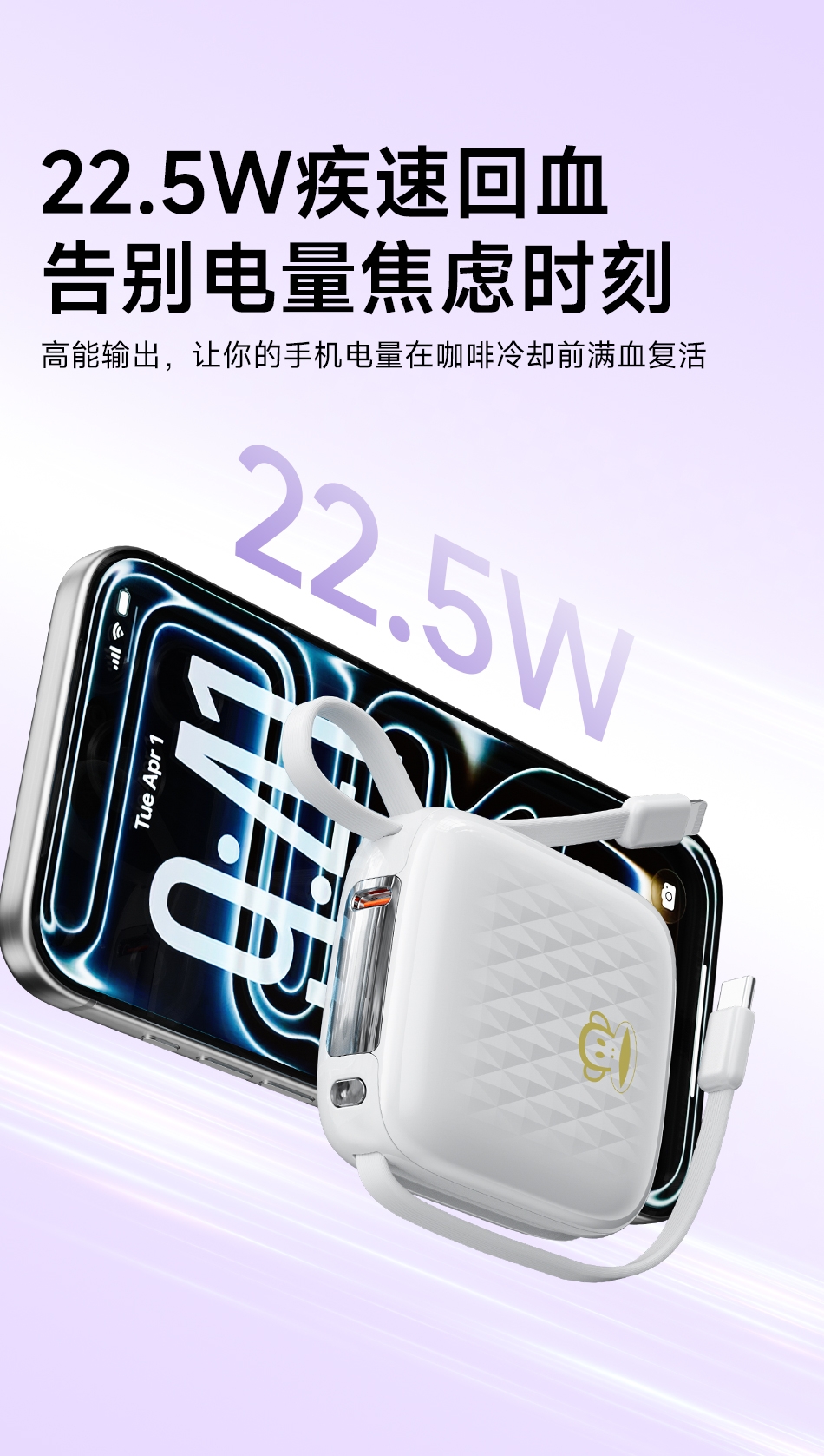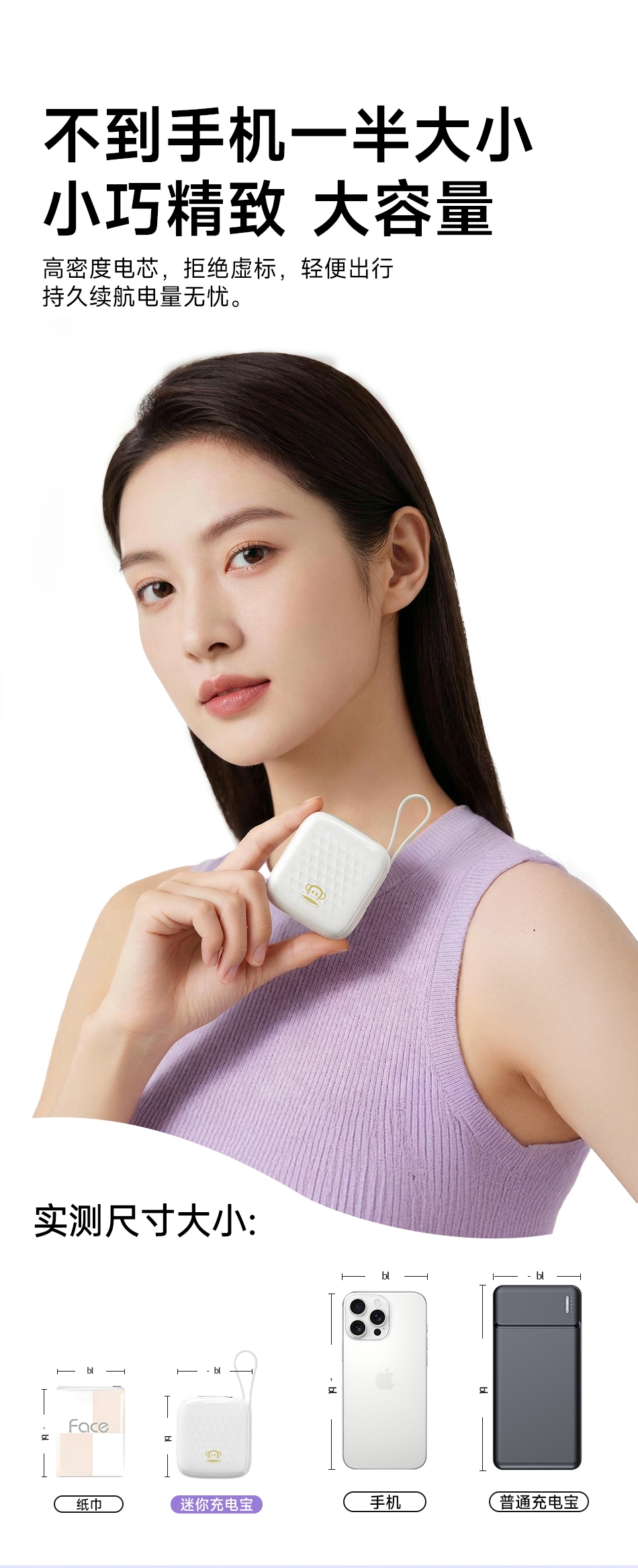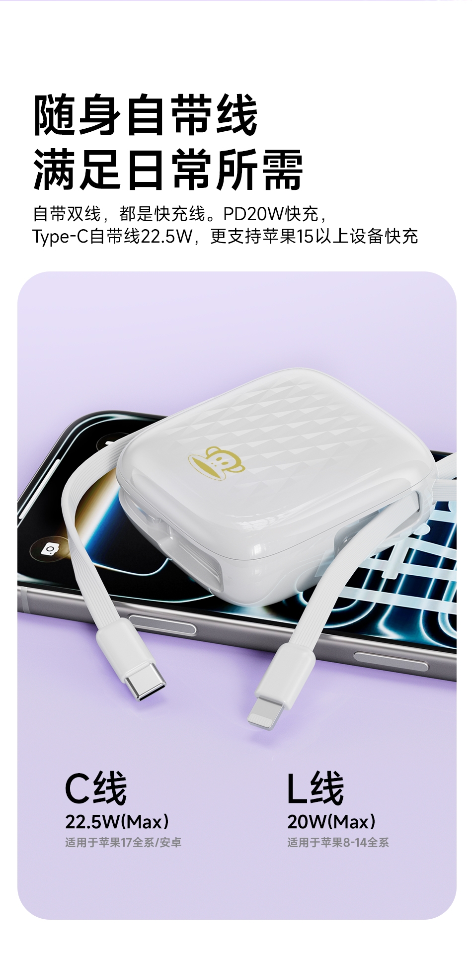 多彩配色,超迷你轻巧设计,轻松出行;自带双线快充,告别忘带线;高性能电芯,安全稳定,智能数显,看得见的电量更安心;支持苹果8-17全系列快充;TYPE-C线支持双向快充