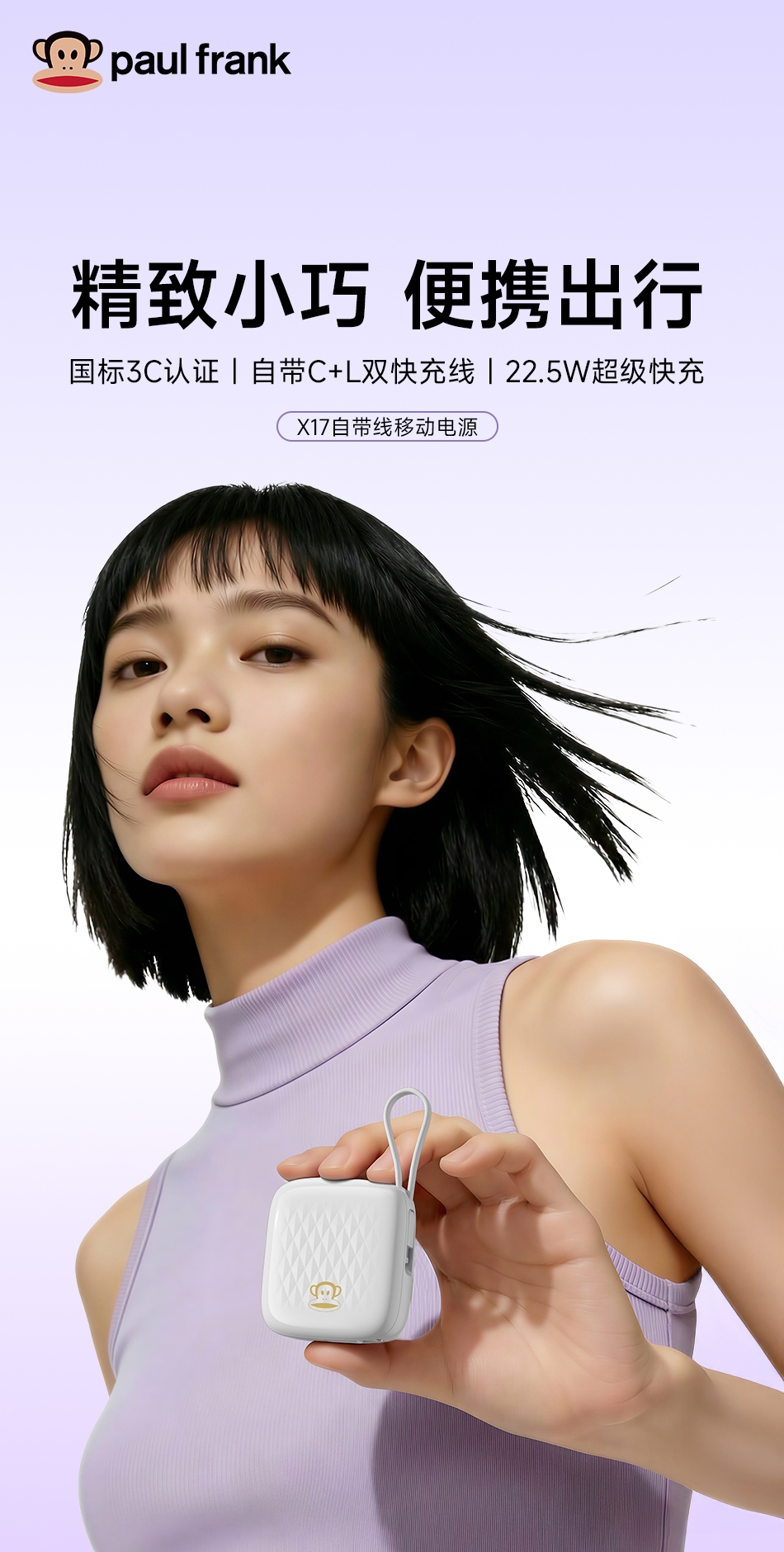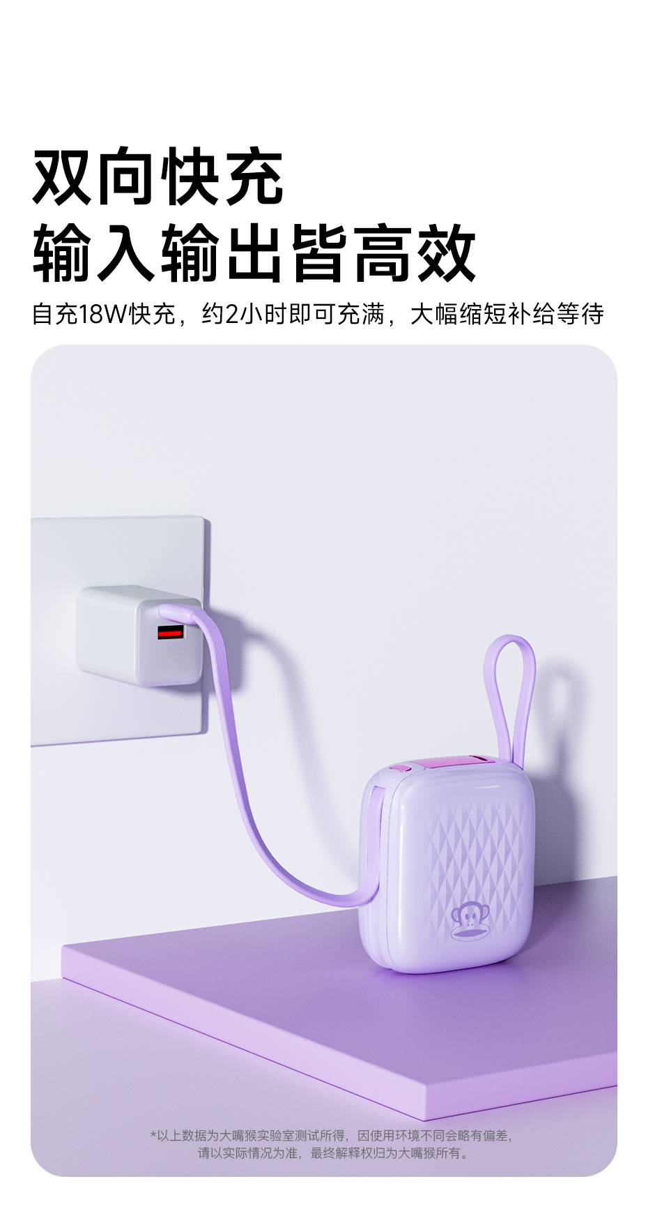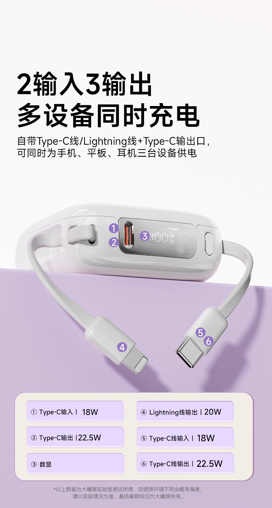 多彩配色,超迷你轻巧设计,轻松出行;自带双线快充,告别忘带线;高性能电芯,安全稳定,智能数显,看得见的电量更安心;支持苹果8-17全系列快充;TYPE-C线支持双向快充