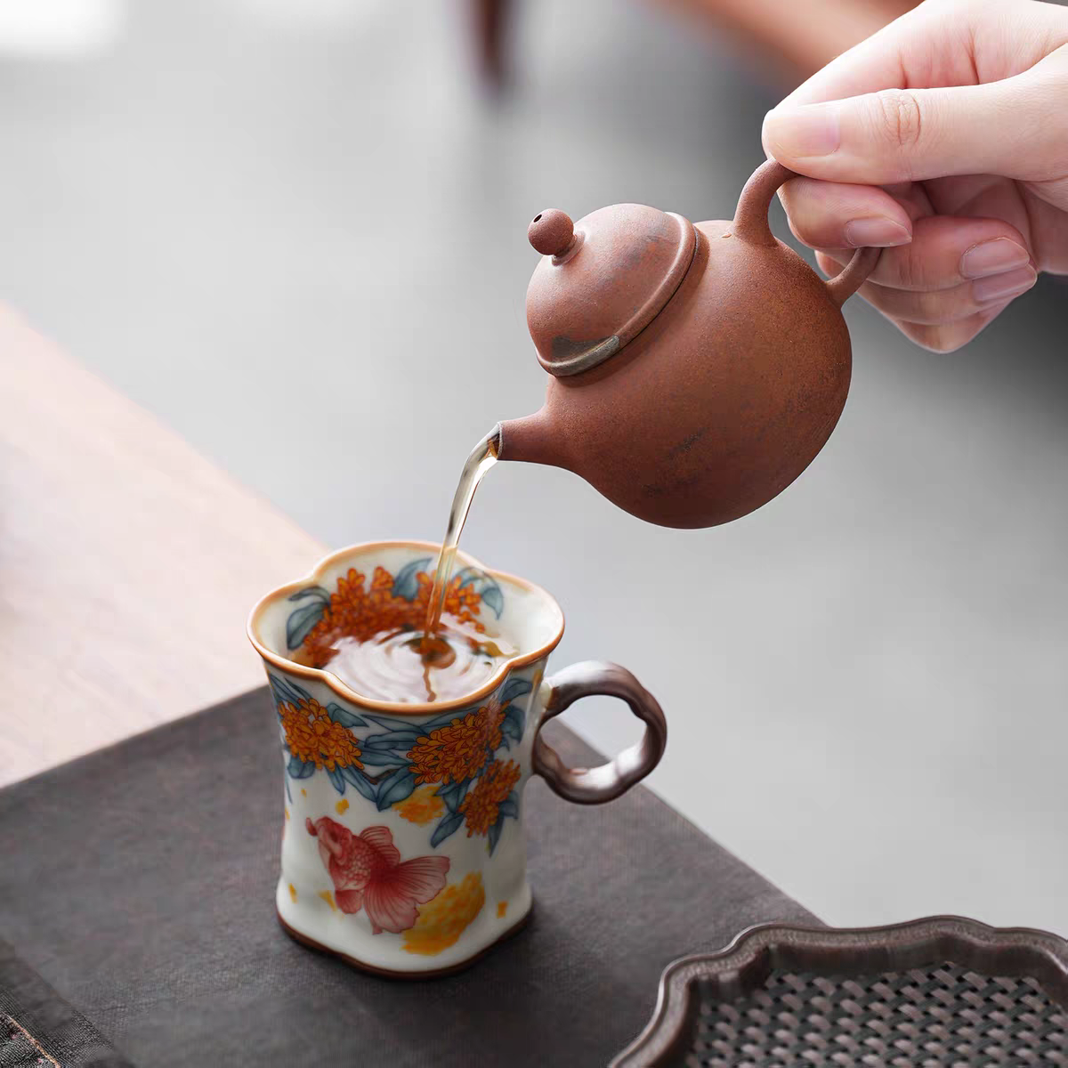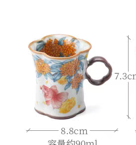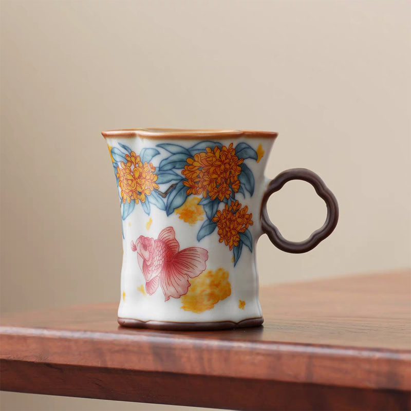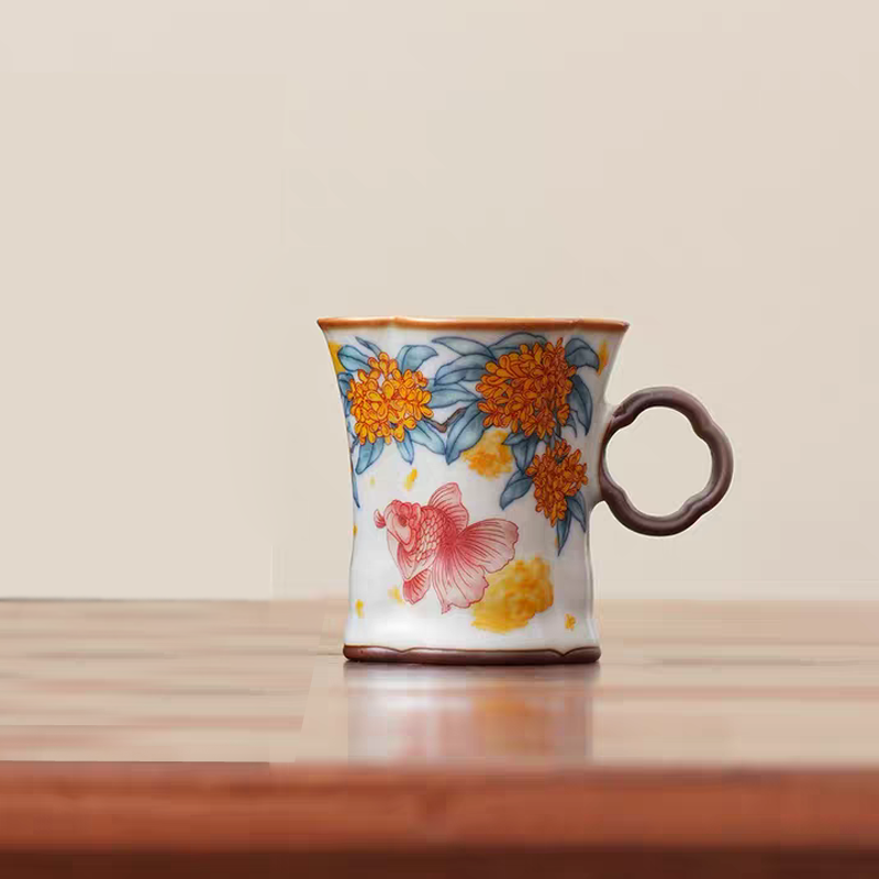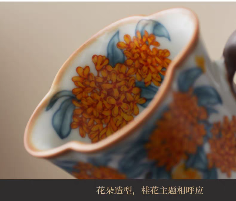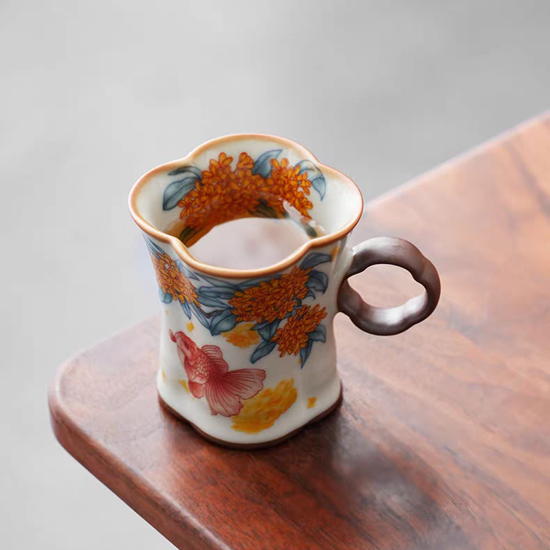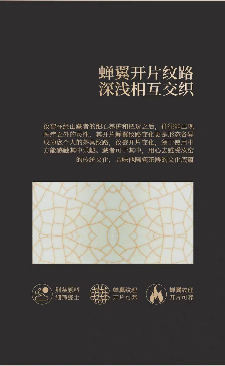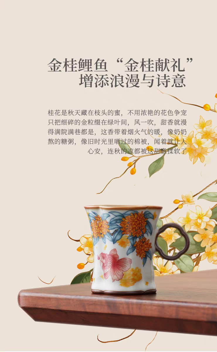 金鲤桂花,寓意金贵,连年有鱼。杯内外皆有画面。;玛瑙入釉,蝉翼开片,家有千财万贯,不如汝窑一片;亚黄汝瓷,独家专利技术新品,采用高价优质瓷土,紫口