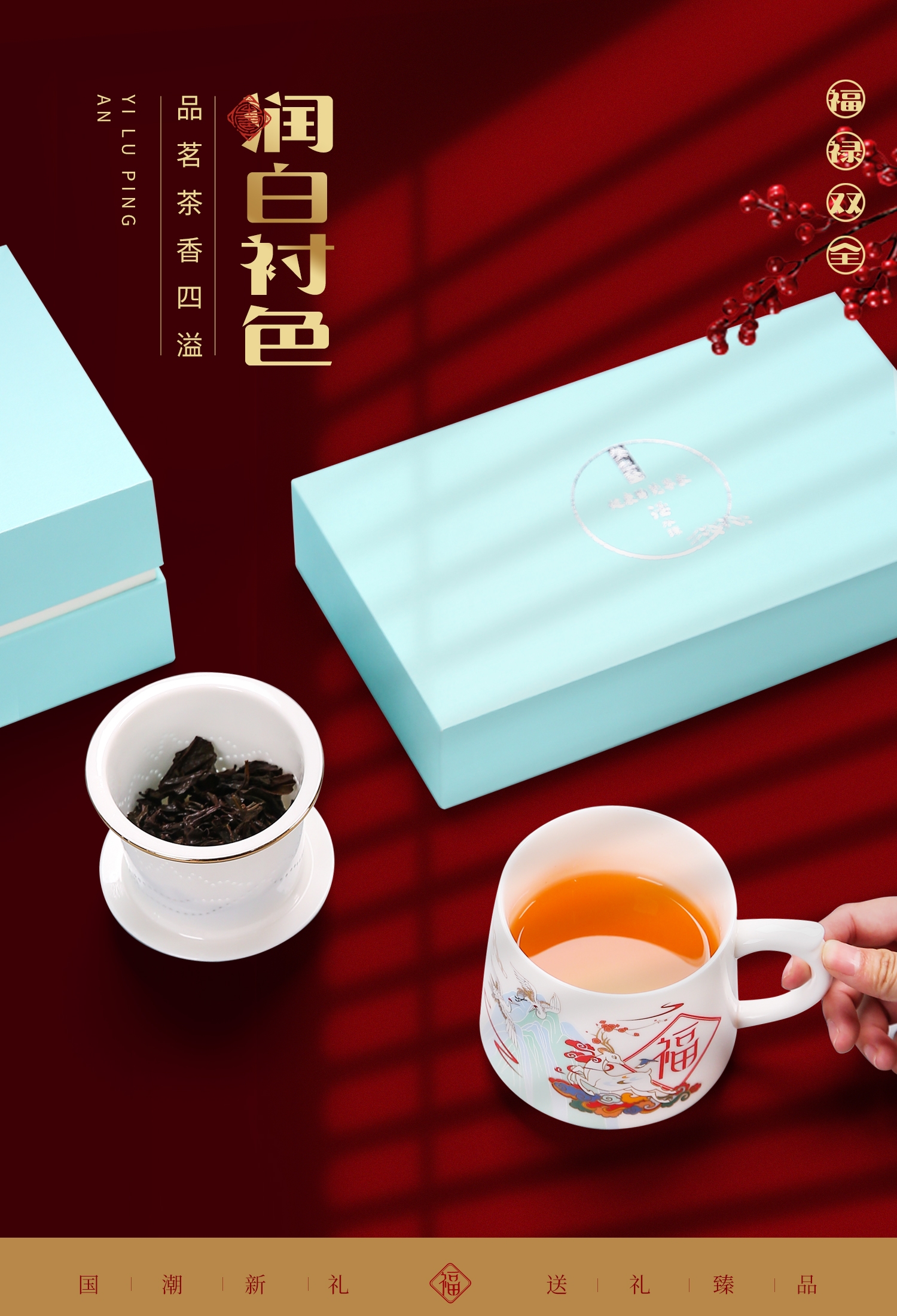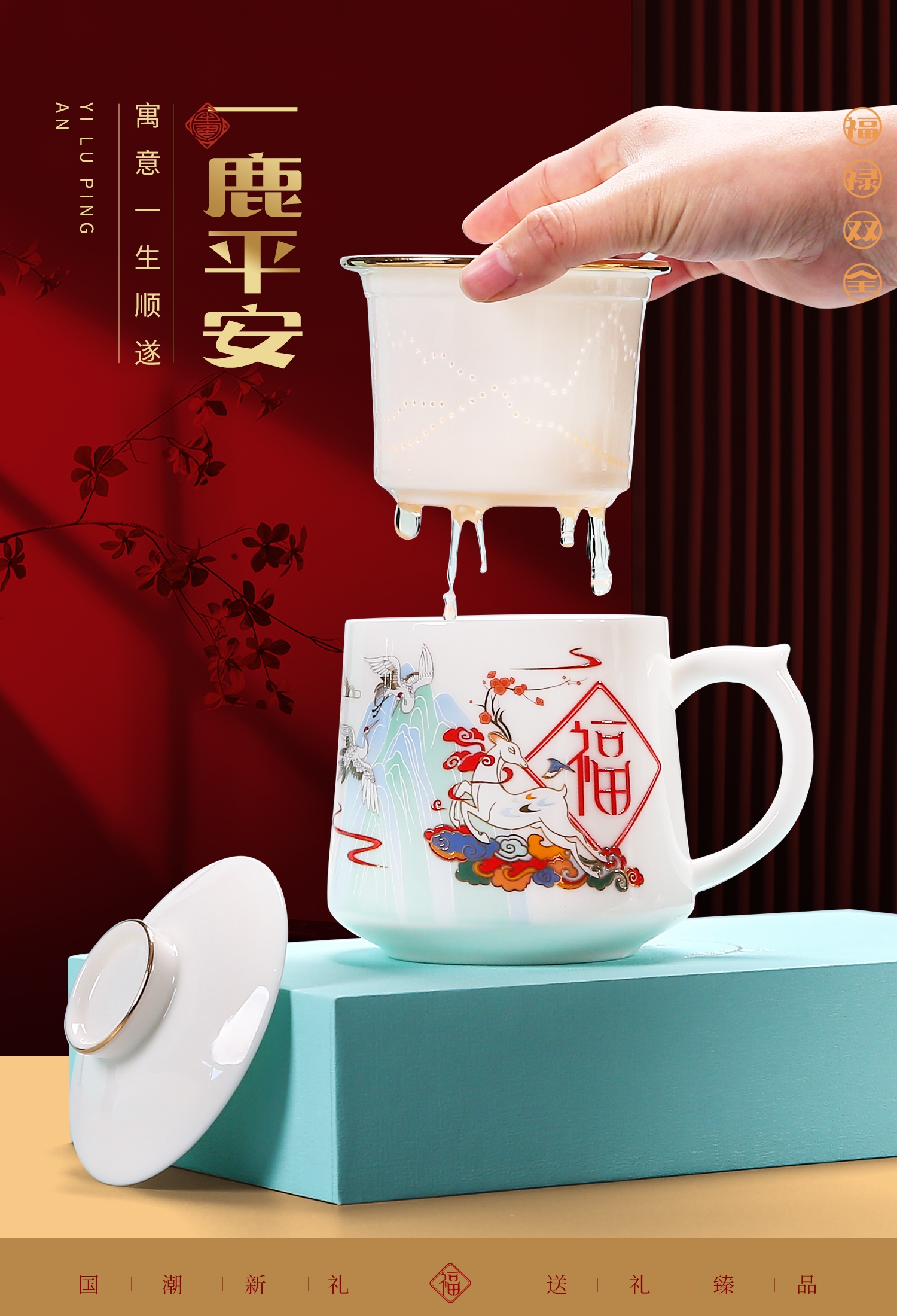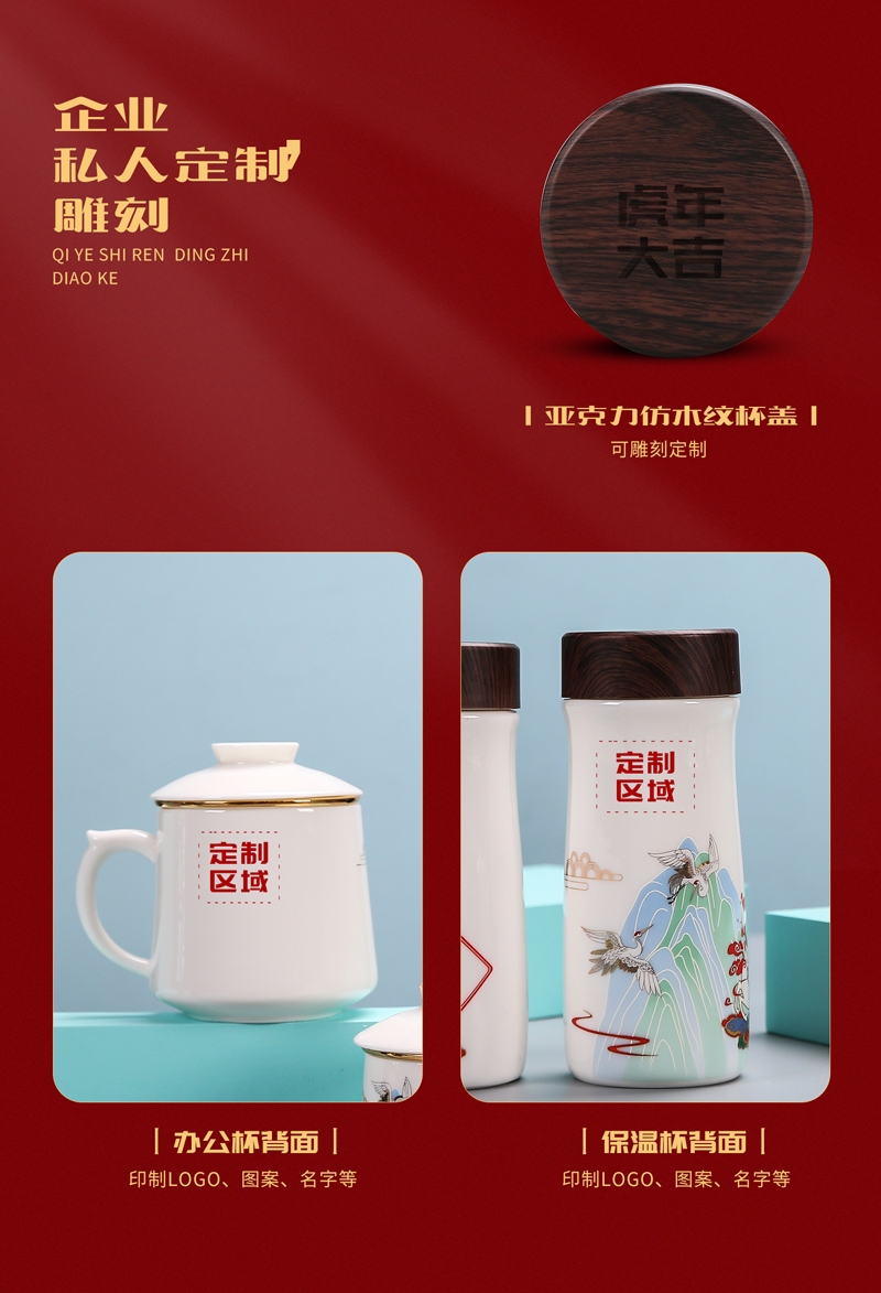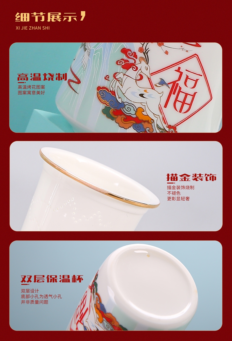 奢华羊脂玉瓷茶具,描金装饰,做工精致,品质高档非凡;仙鹿与福同行,寓意福禄吉祥。杯身可定制图案LOGO;保温杯盖顶可激光雕刻。