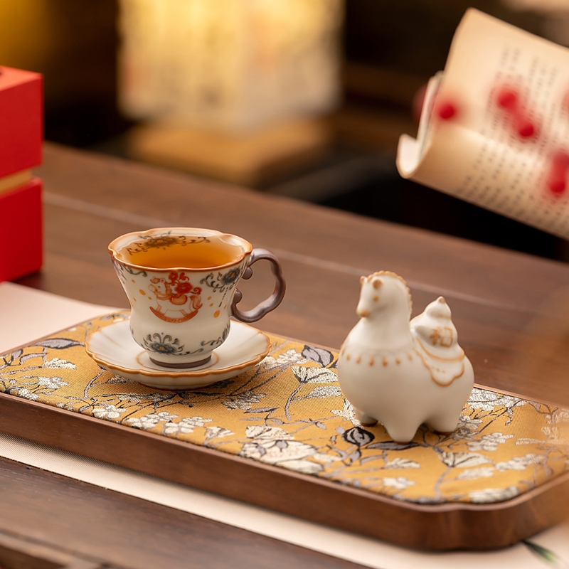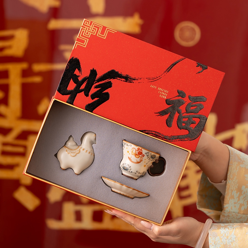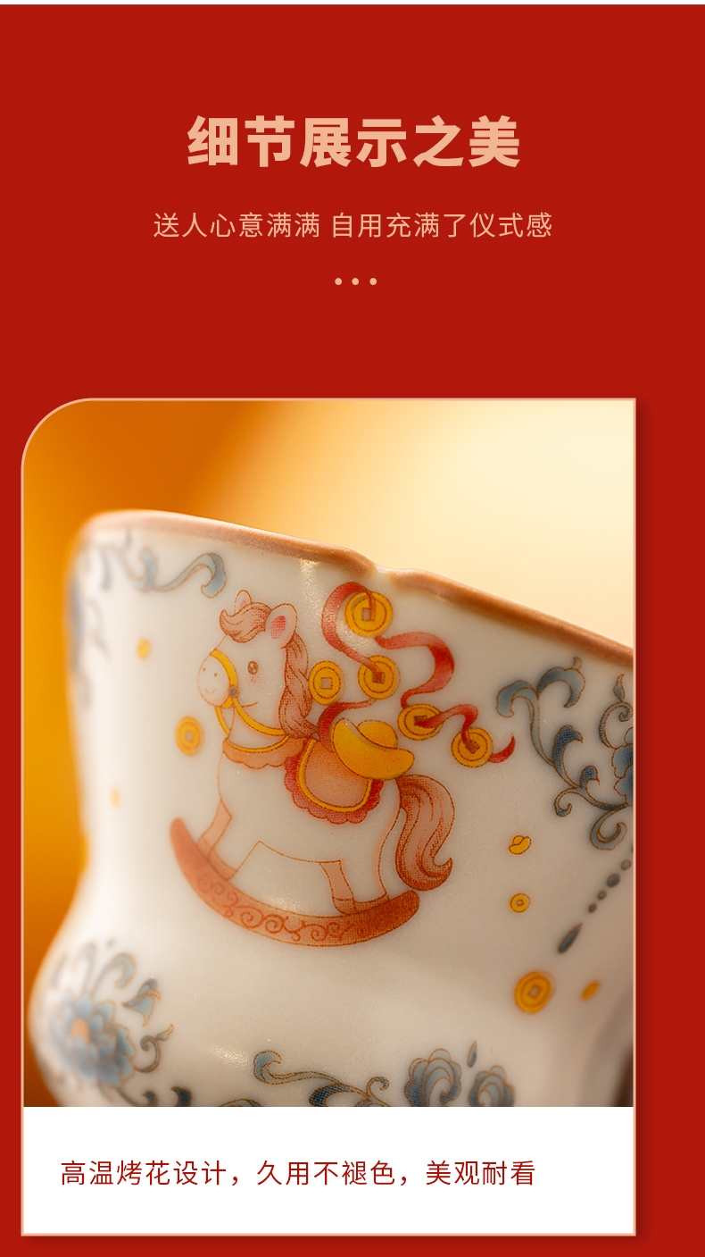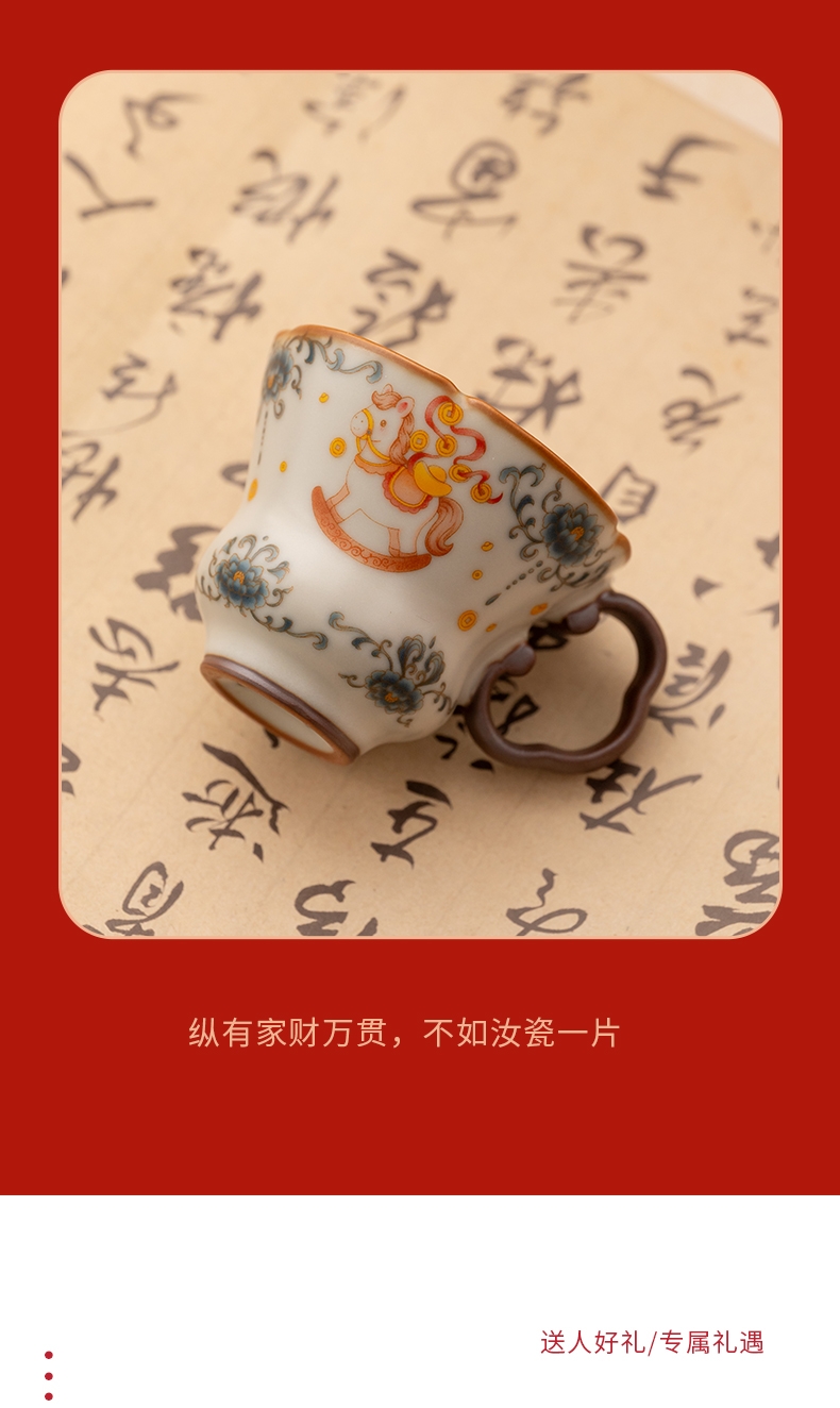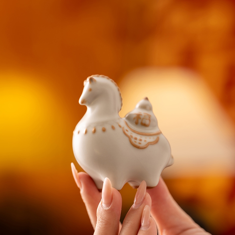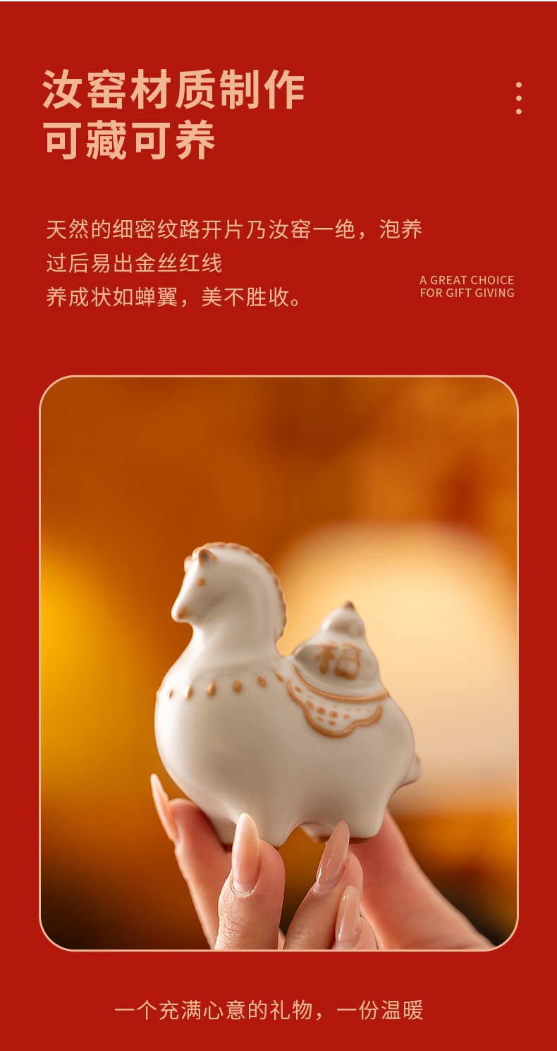 马年开门红礼品,马上有钱,马到成功杯子摆件套装,;马背上葫芦造型,寓意福禄。亚黄汝瓷,玛瑙入釉;蝉翼开片,内外皆有花面,家有千财万贯,不如汝窑一片