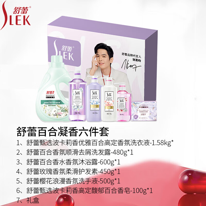 配置:1、舒蕾甄选波卡莉香优雅百合高定香氛洗衣液-1.58kg* 2、舒蕾百合香氛顺滑去屑洗发露-480g*1 3、舒蕾百合香水香氛沐浴露-600g*1 4、舒蕾玫瑰香氛柔滑护发素-450g*1 5、舒蕾樱花浪漫香氛洗手液-500g*1 6、舒蕾甄选波卡莉香高定馥郁百合香皂-100g*1 7、礼盒