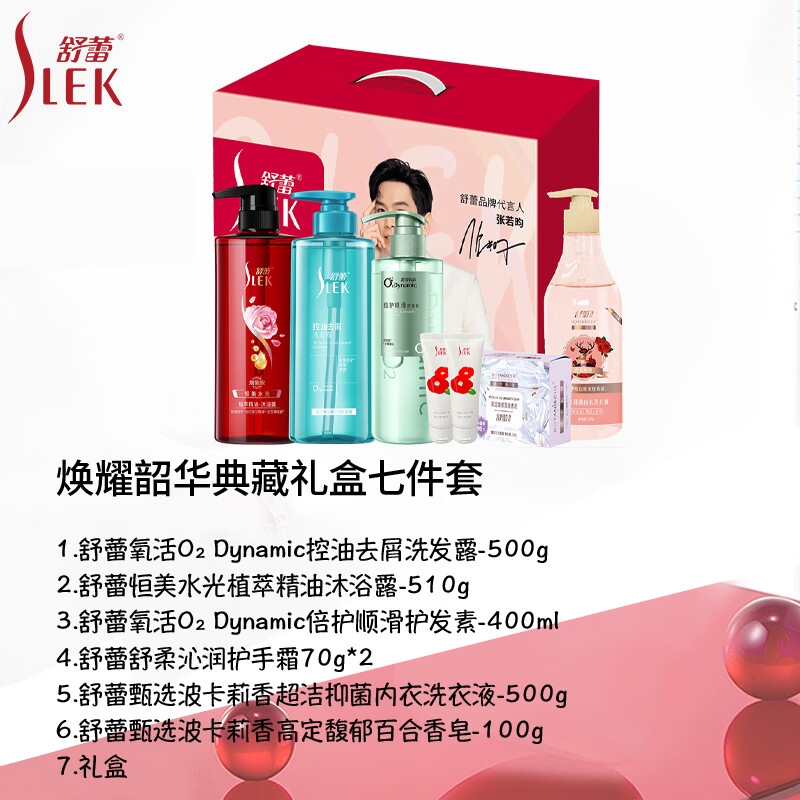 配置:1、舒蕾氧活O₂ Dynamic控油去屑洗发露-500g 2、舒蕾恒美水光植萃精油沐浴露-510g 3、舒蕾氧活O₂ Dynamic倍护顺滑护发素-400ml 4、舒蕾舒柔沁润护手霜70g*2 5、舒蕾甄选波卡莉香超洁抑菌内衣洗衣液-500g 6、舒蕾甄选波卡莉香高定馥郁百合香皂-100g 7、礼盒