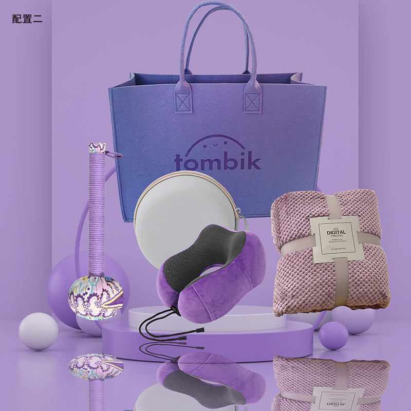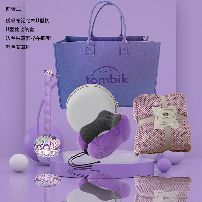 配置二:磁吸布记忆棉U型枕 U型枕收纳盒 法兰绒菠萝格午睡毯 紫色艾草锤
