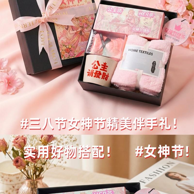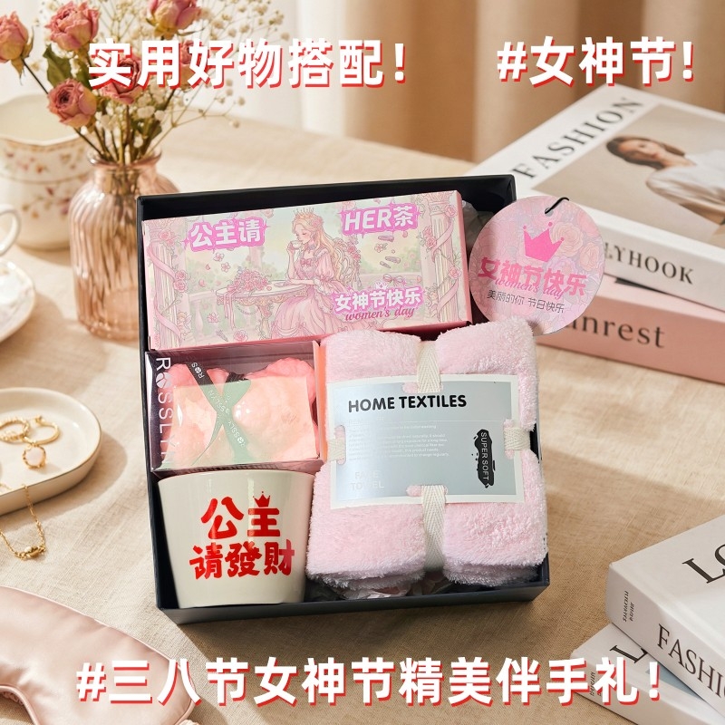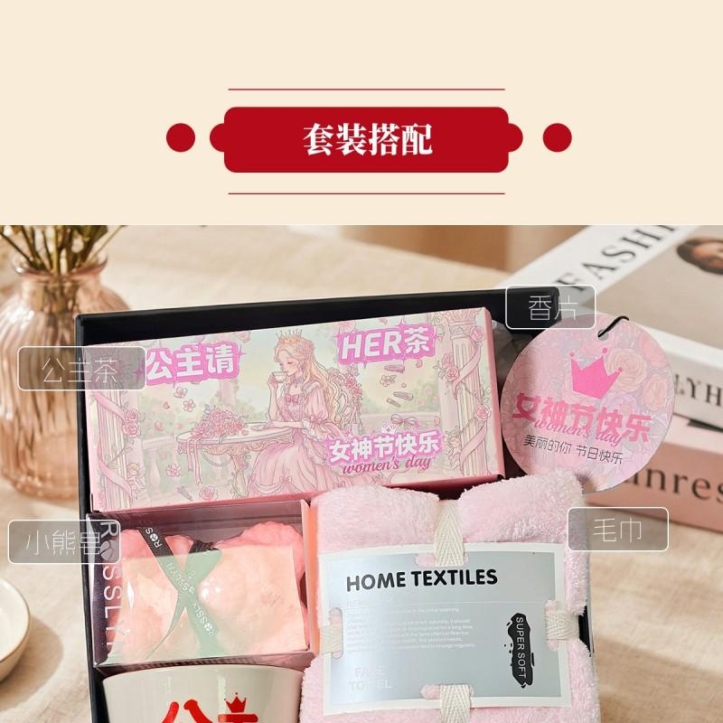 组合:公主请喝茶8g*2袋、公主请发财陶瓷主人杯*1、女神节香片香挂*1、小熊玫瑰香氛皂100g*1、公主粉色珊瑚绒毛巾75*34CM*1