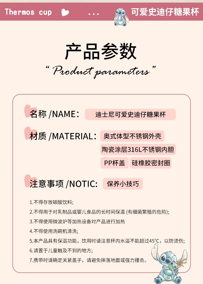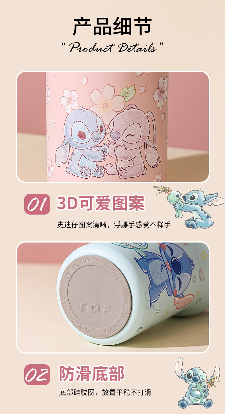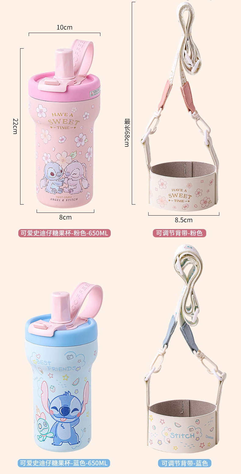 配置清单:保温杯两款形象,可爱史迪奇,樱花史迪奇,容量:650ml,彩盒装