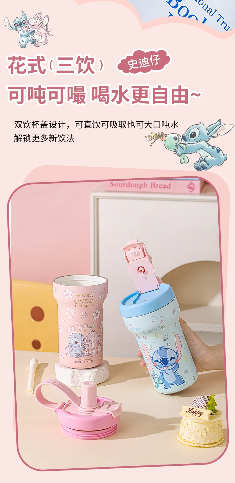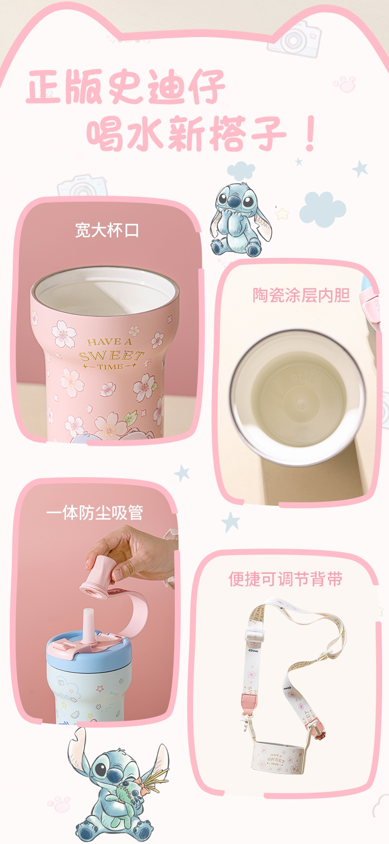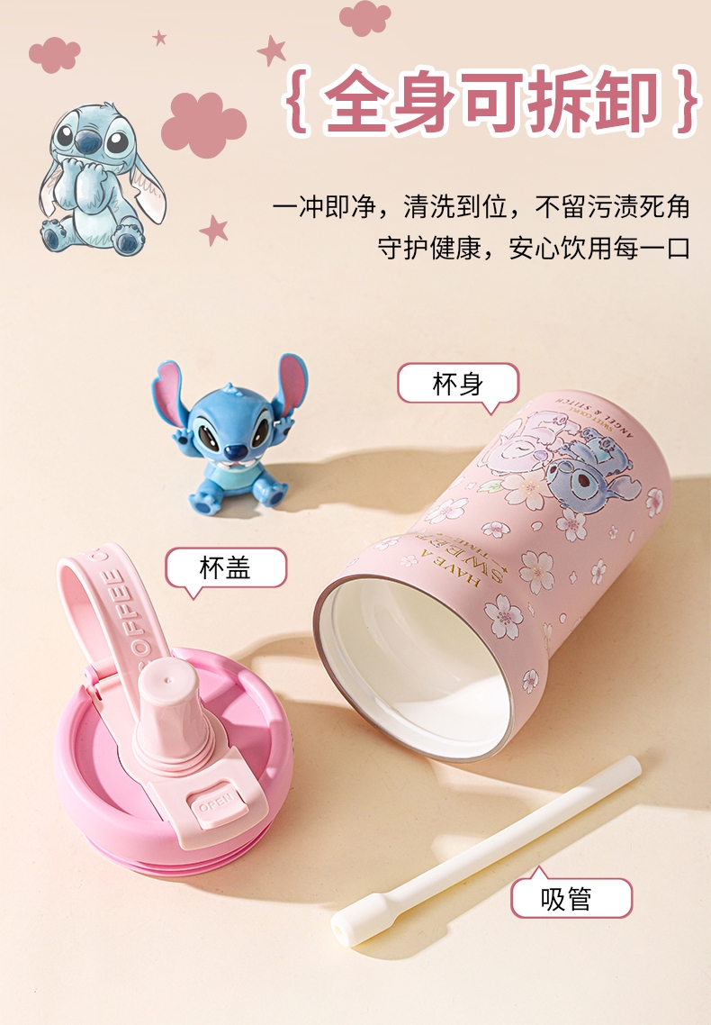 配置清单:保温杯两款形象,可爱史迪奇,樱花史迪奇,容量:650ml,彩盒装