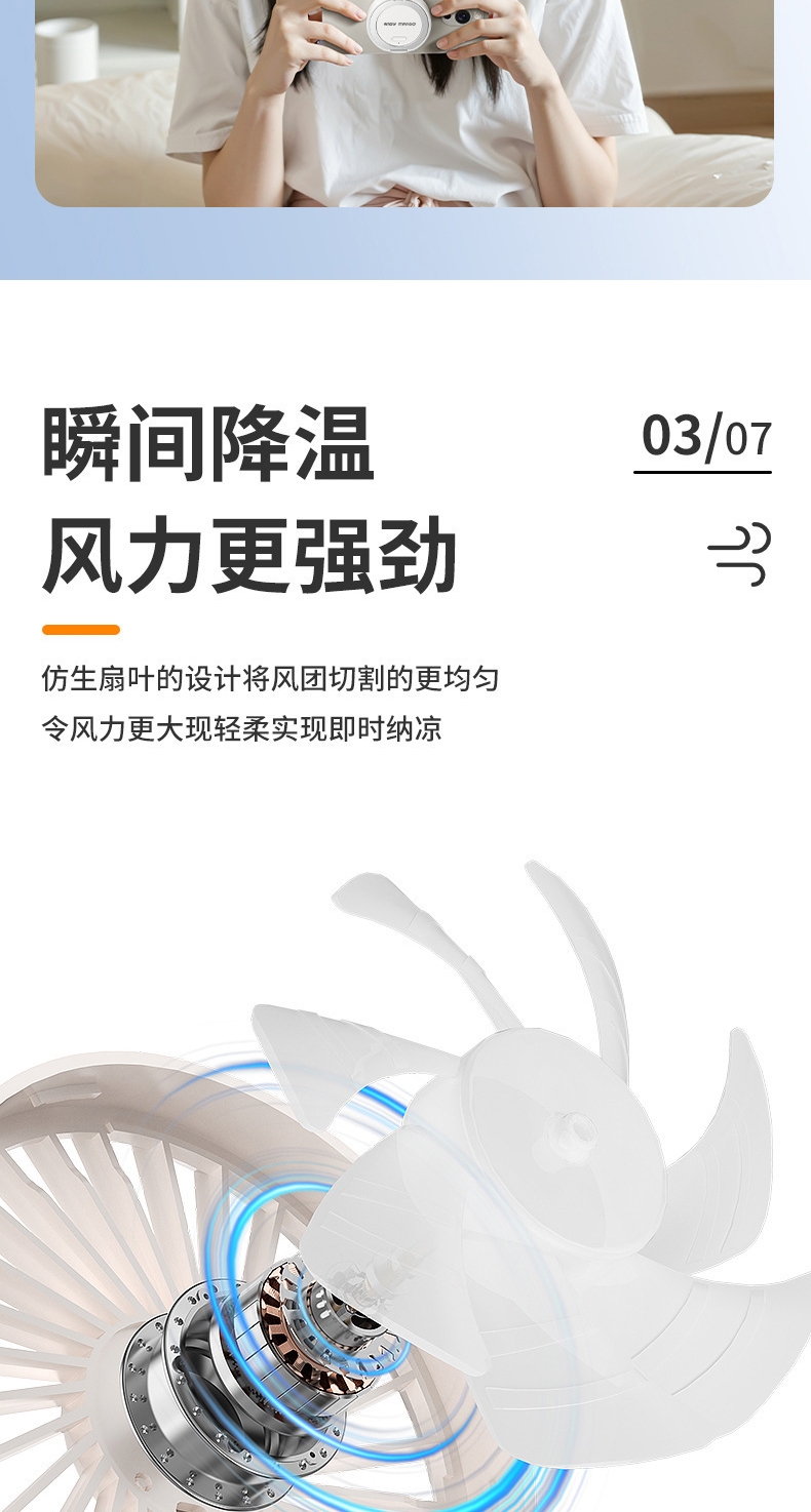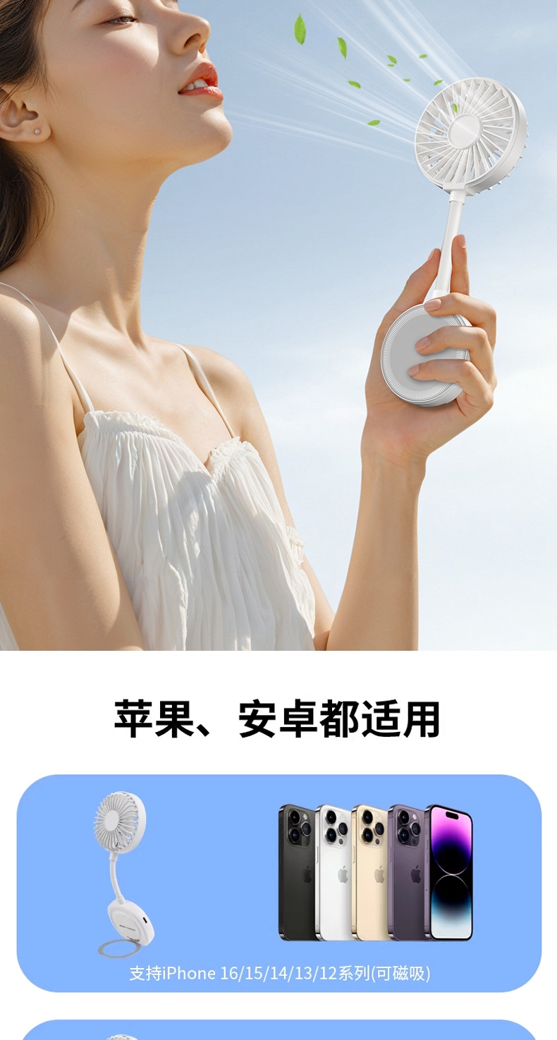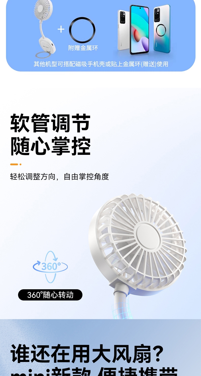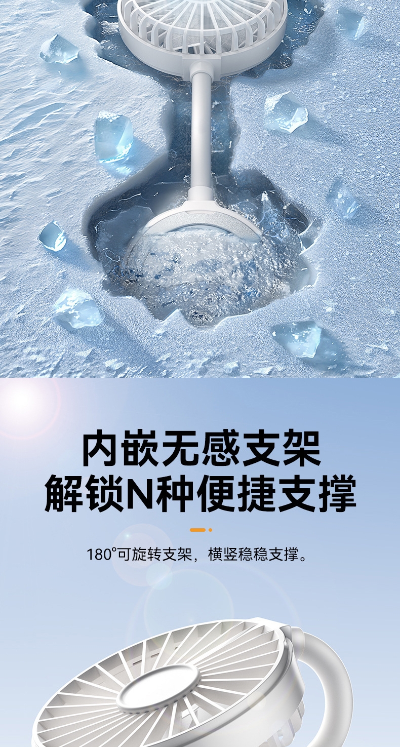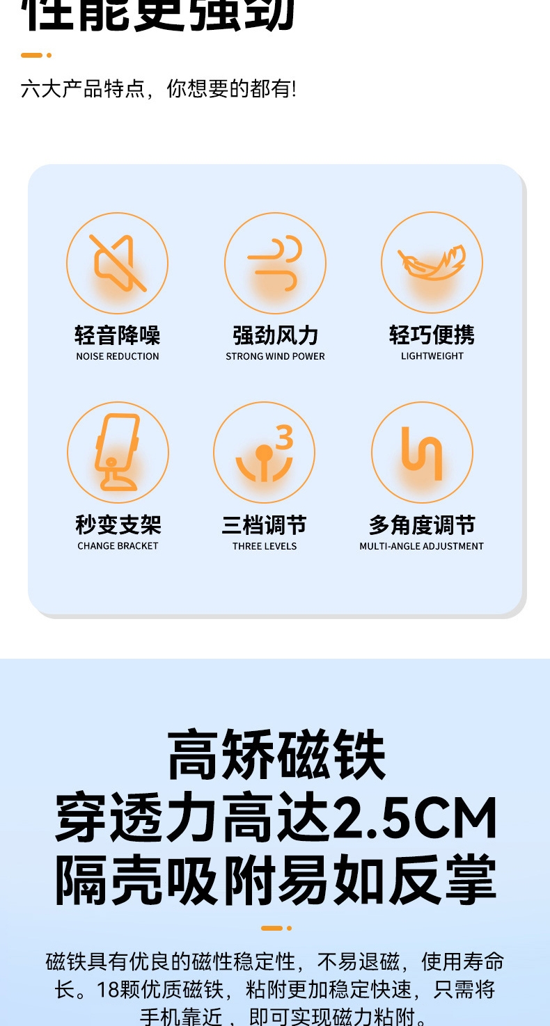 高矫磁铁,隔壳吸附易如反掌,解放双手;飓风循环风道,风力可达普通小风扇3-5倍;内嵌无感支架,解锁N种便捷支撑;捷支撑 软管调节,随心掌控方向