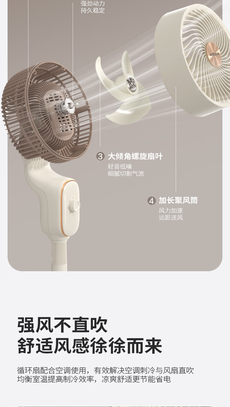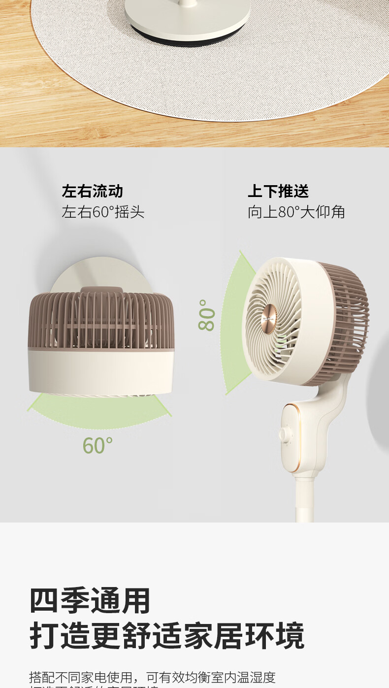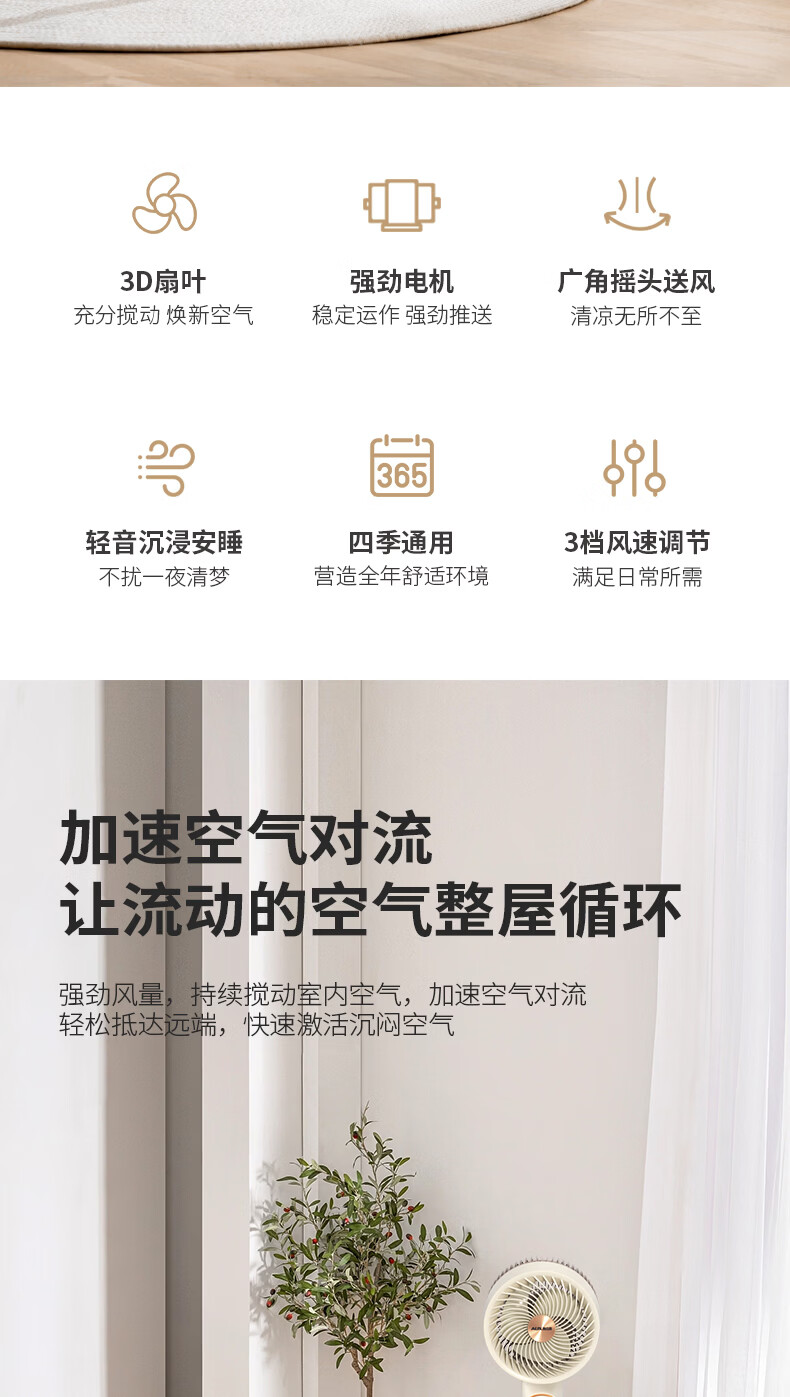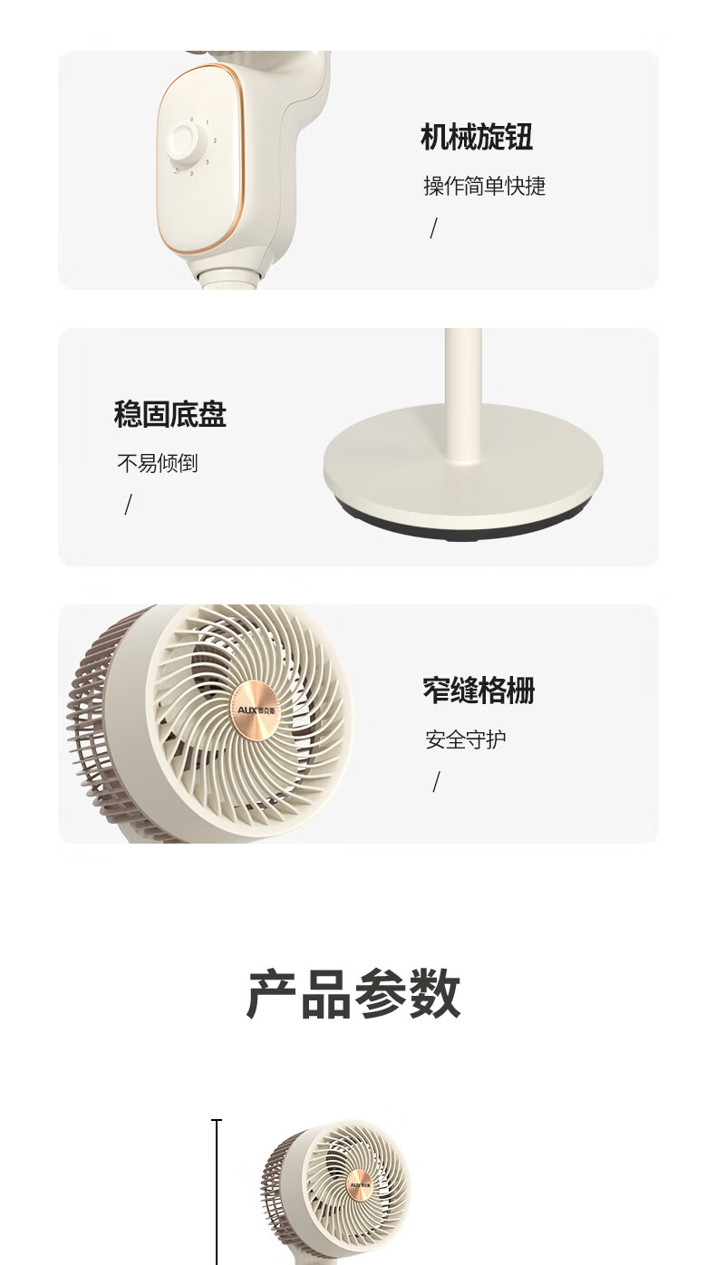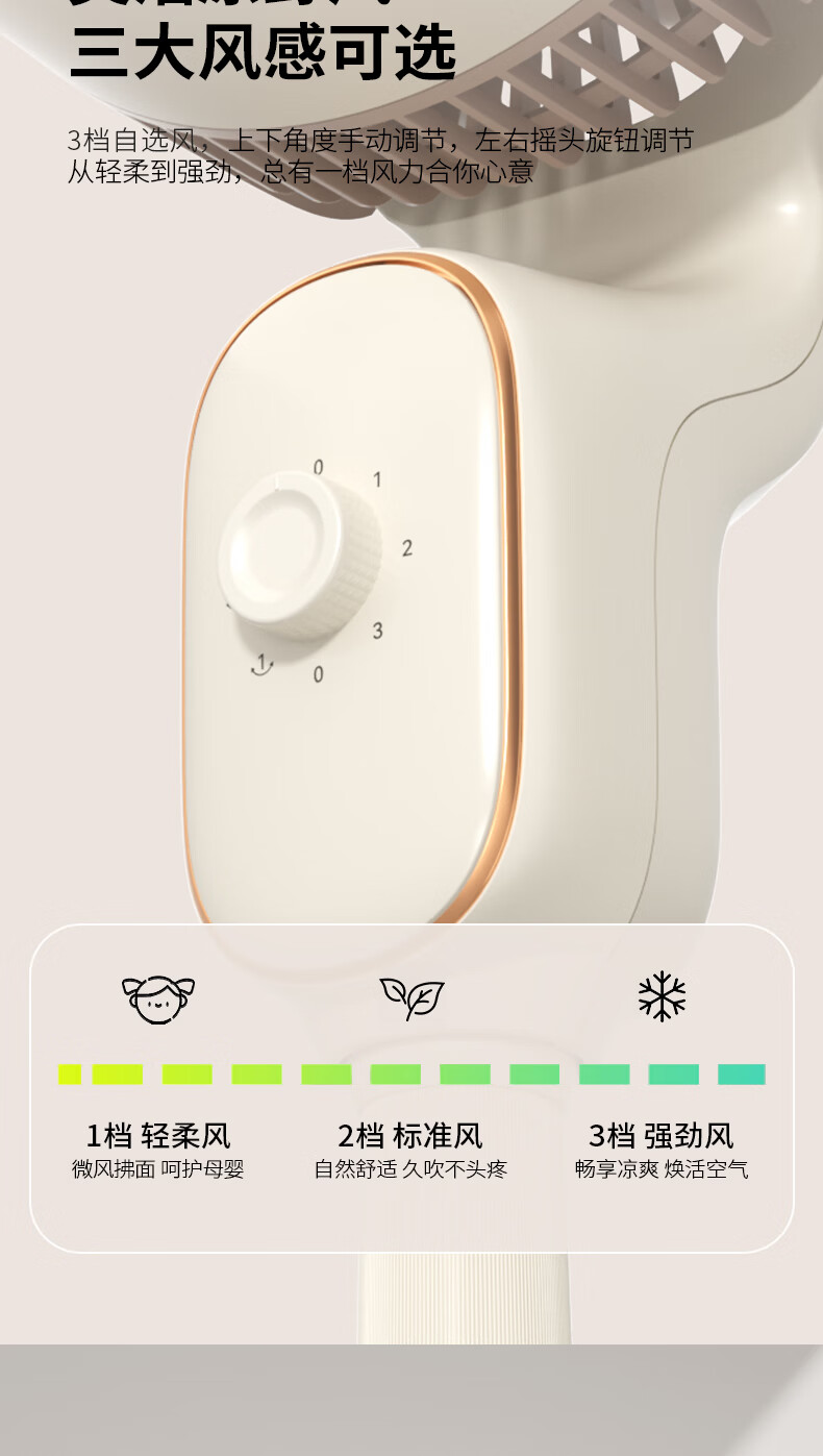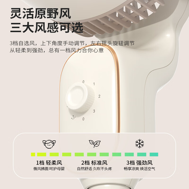 3档风速调节,机械旋钮,操作简单;台立两用,上下左右摇头;贴心设计香薰盒,可放置防蚊虫香薰,驱赶蚊虫