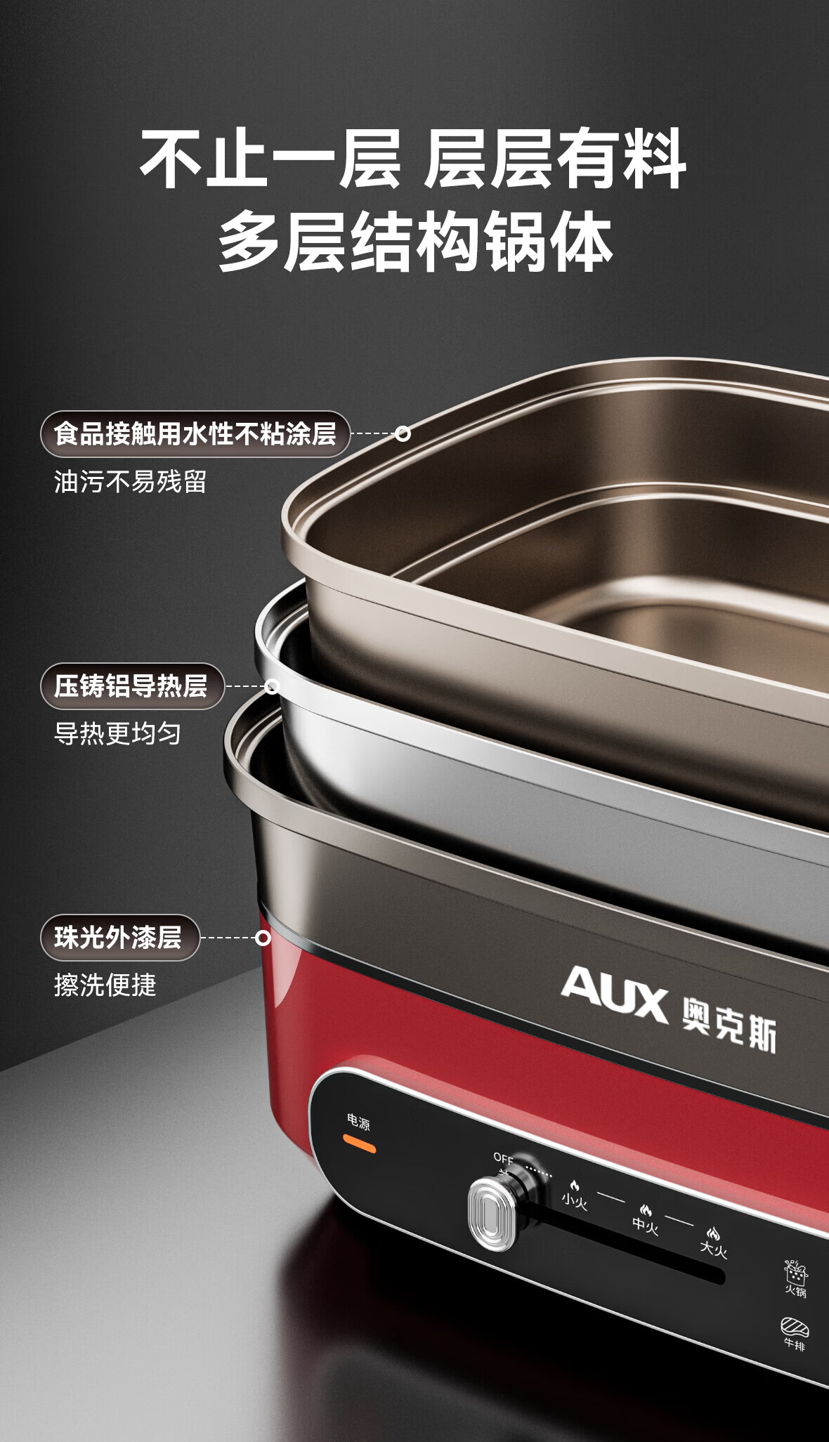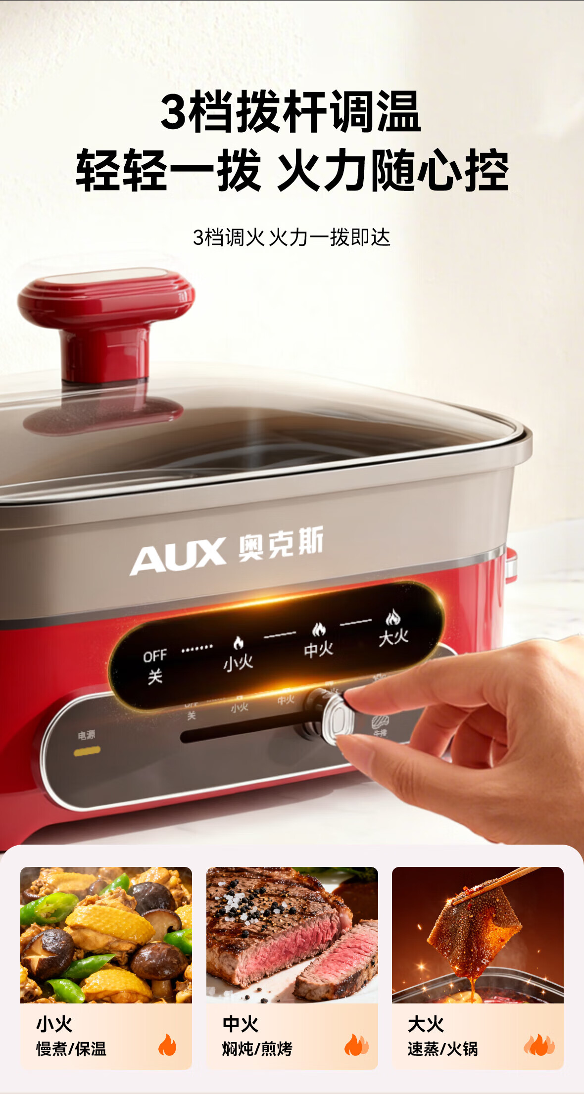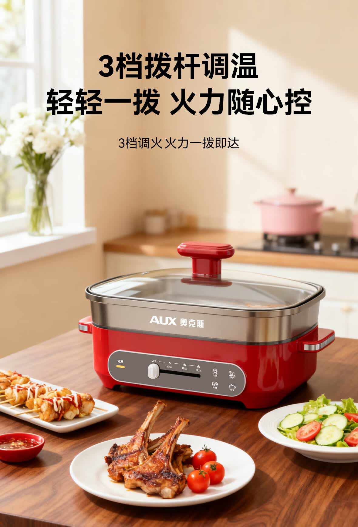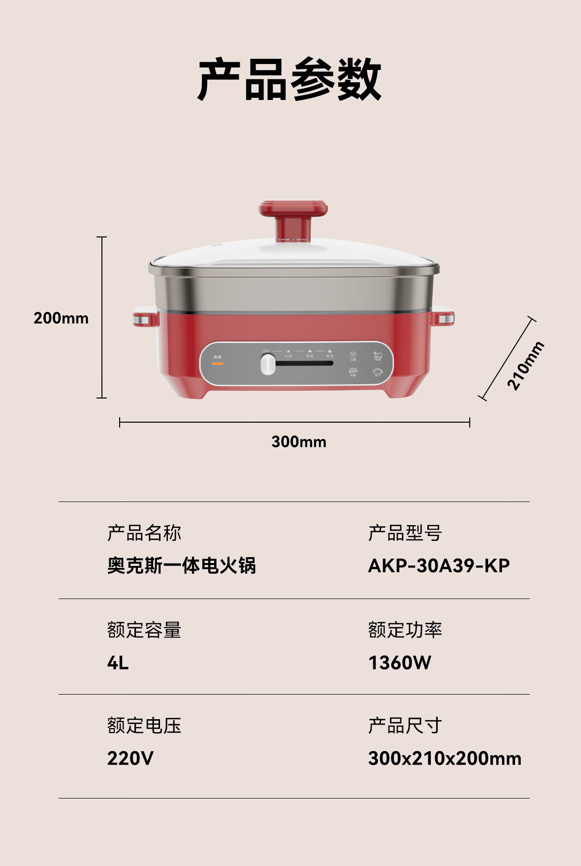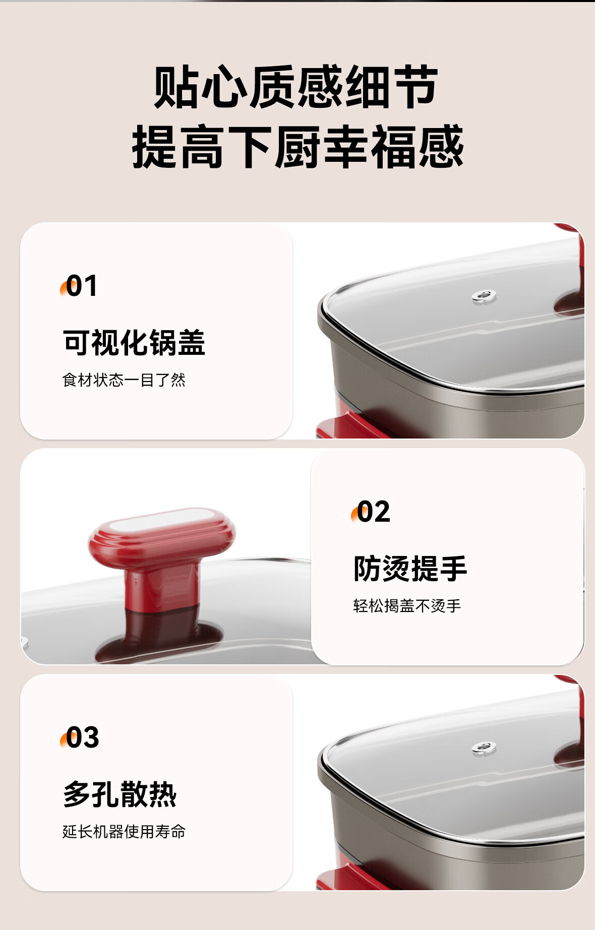 4L大容量,满足一家多口使用;三档拨杆调温,简单便捷,老人一教就会; 可视化玻璃盖,红色外观百搭家具不过时