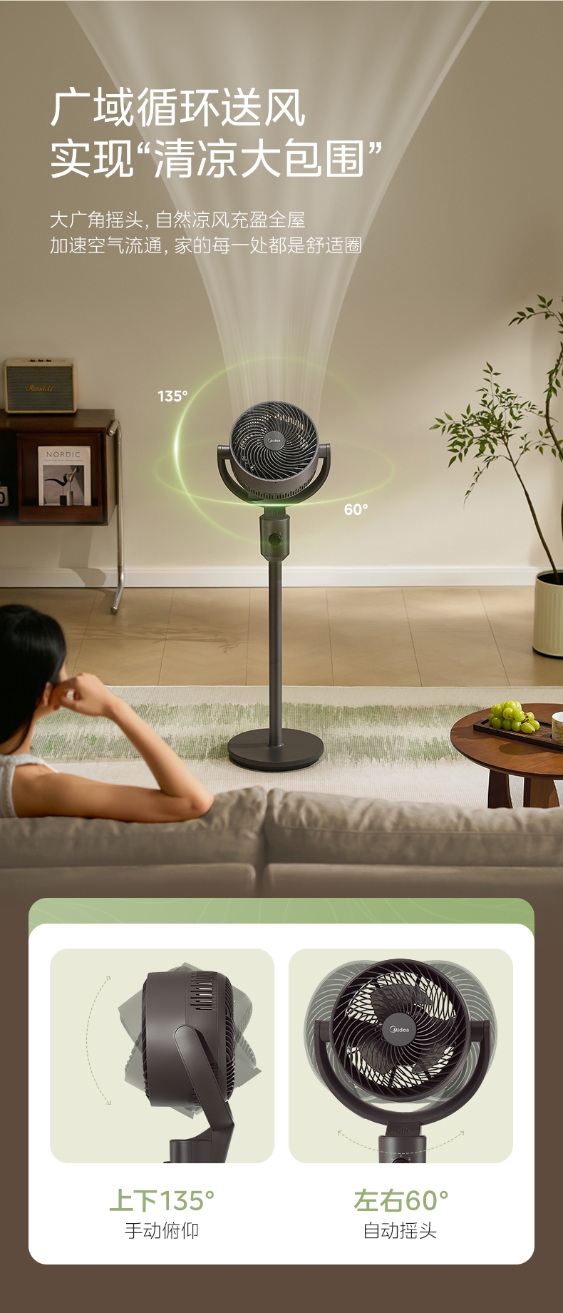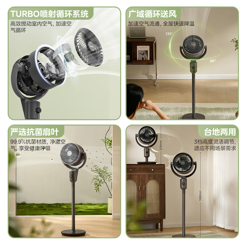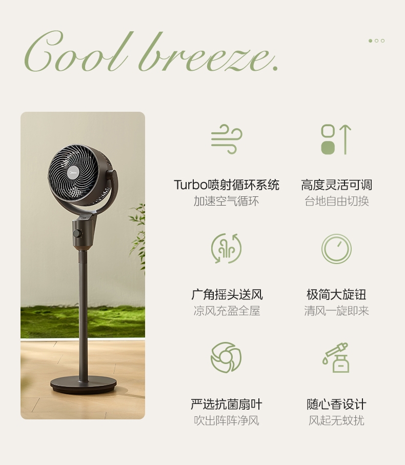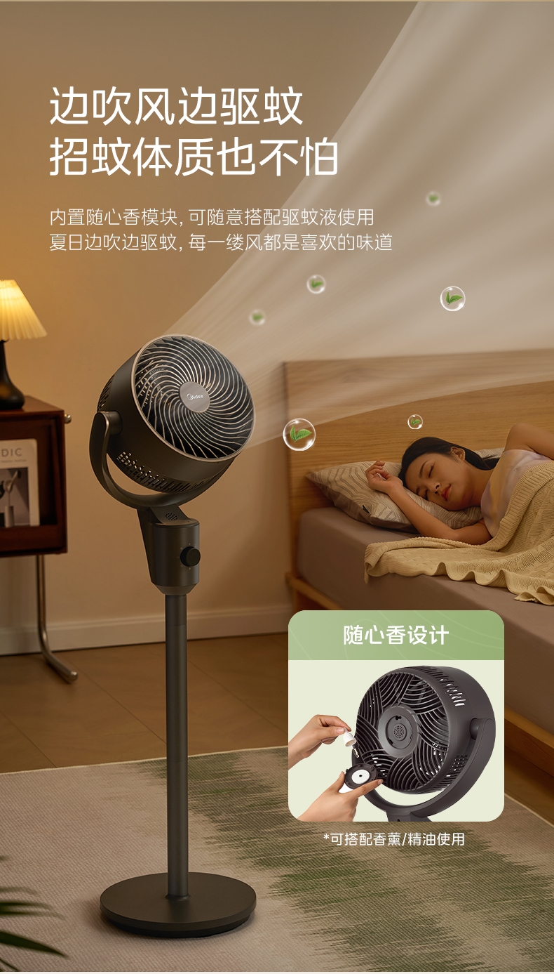 Turbo喷射循环系统,加速空气循环;严选抗菌扇叶 吹出阵阵净风;随心香设计,风起无蚊扰