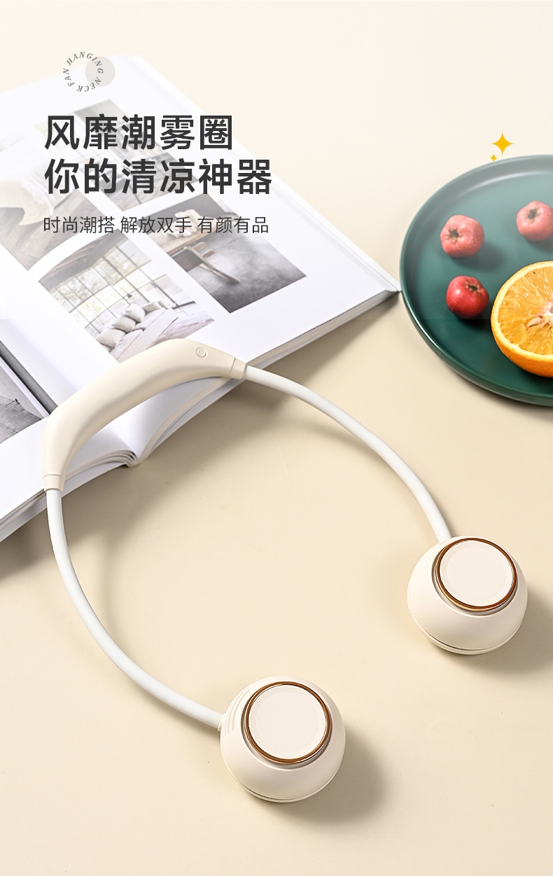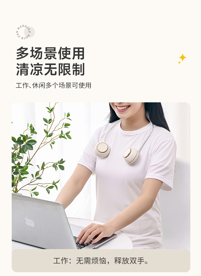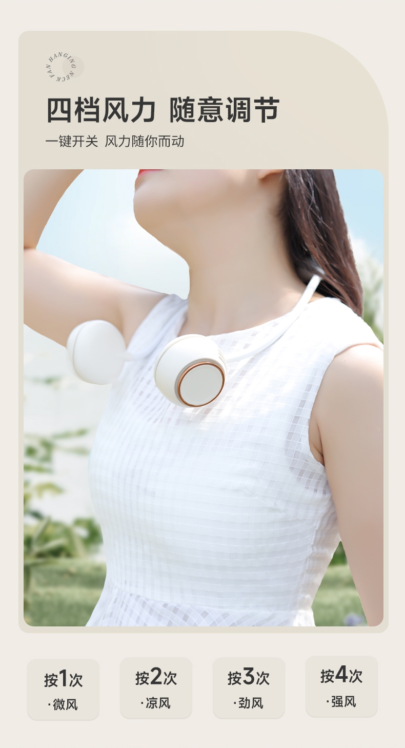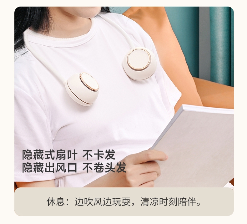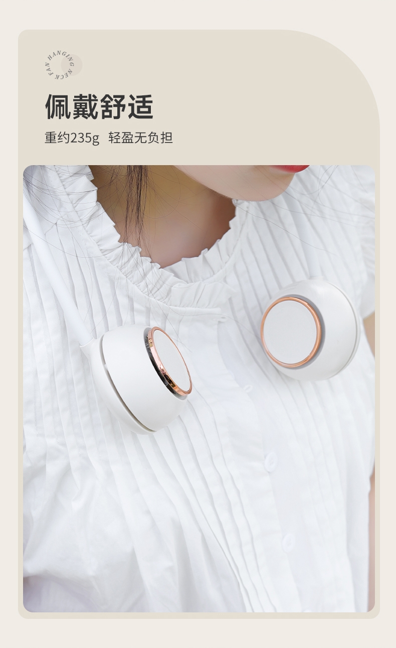 便携;挂脖风扇,四档风力,佩戴舒适;2000mAh大电池,风向随意调节