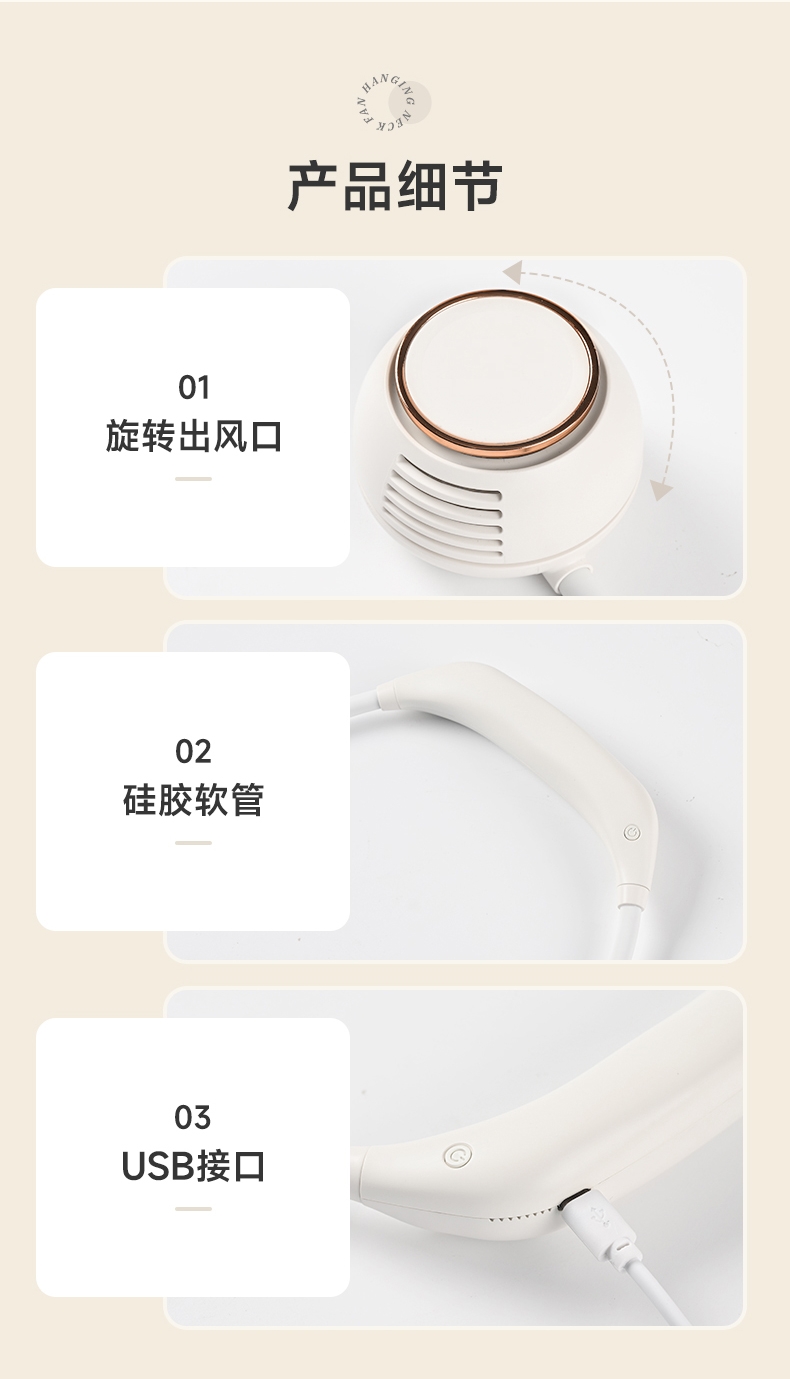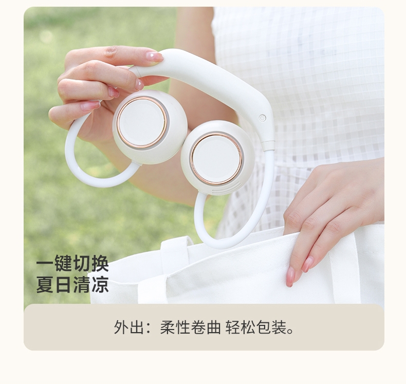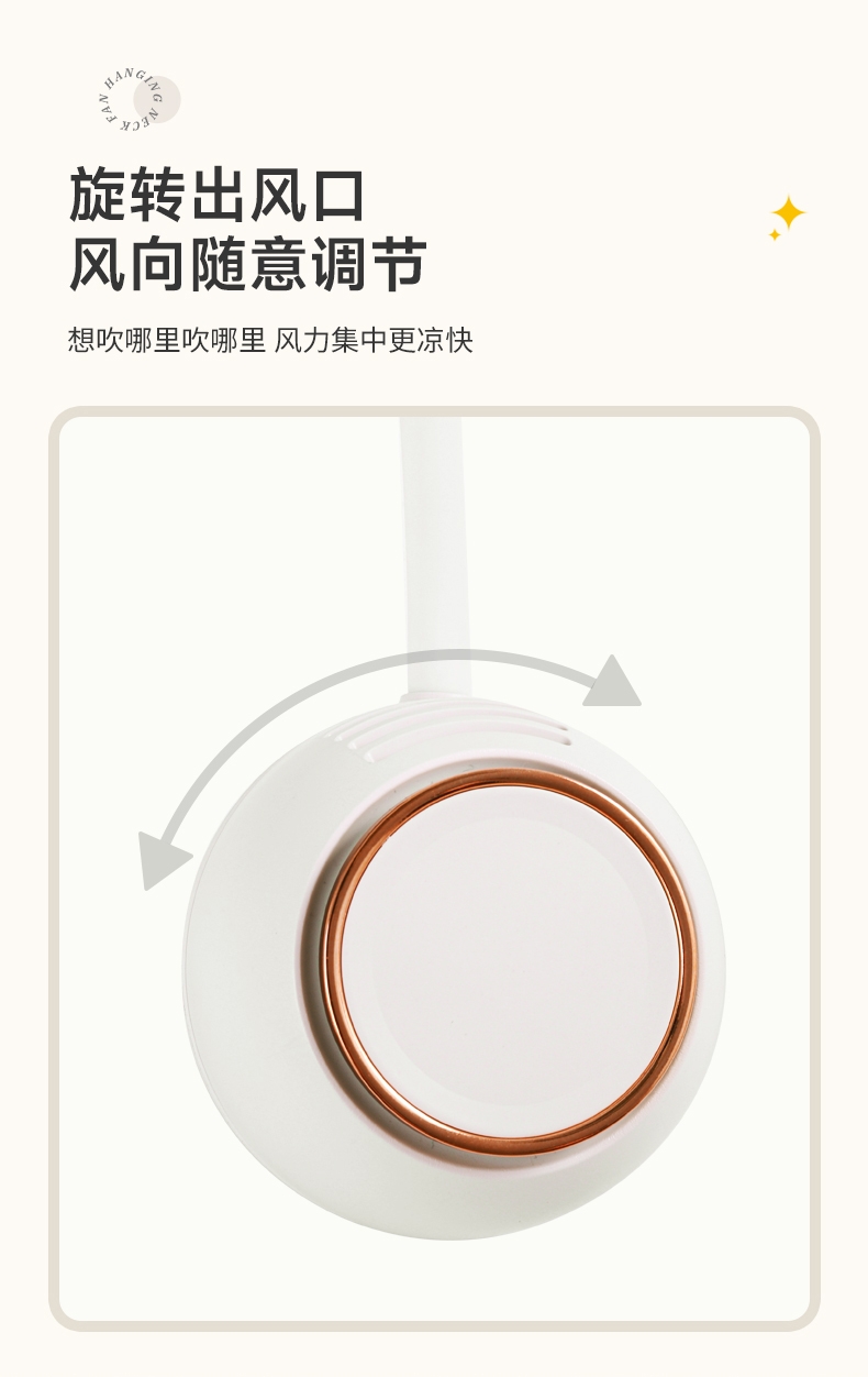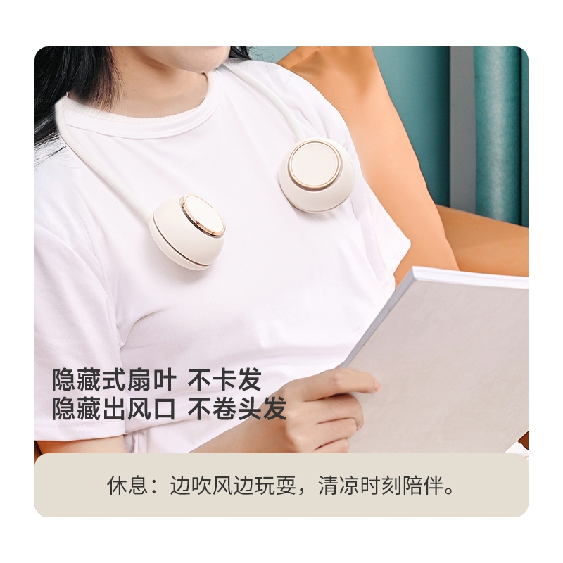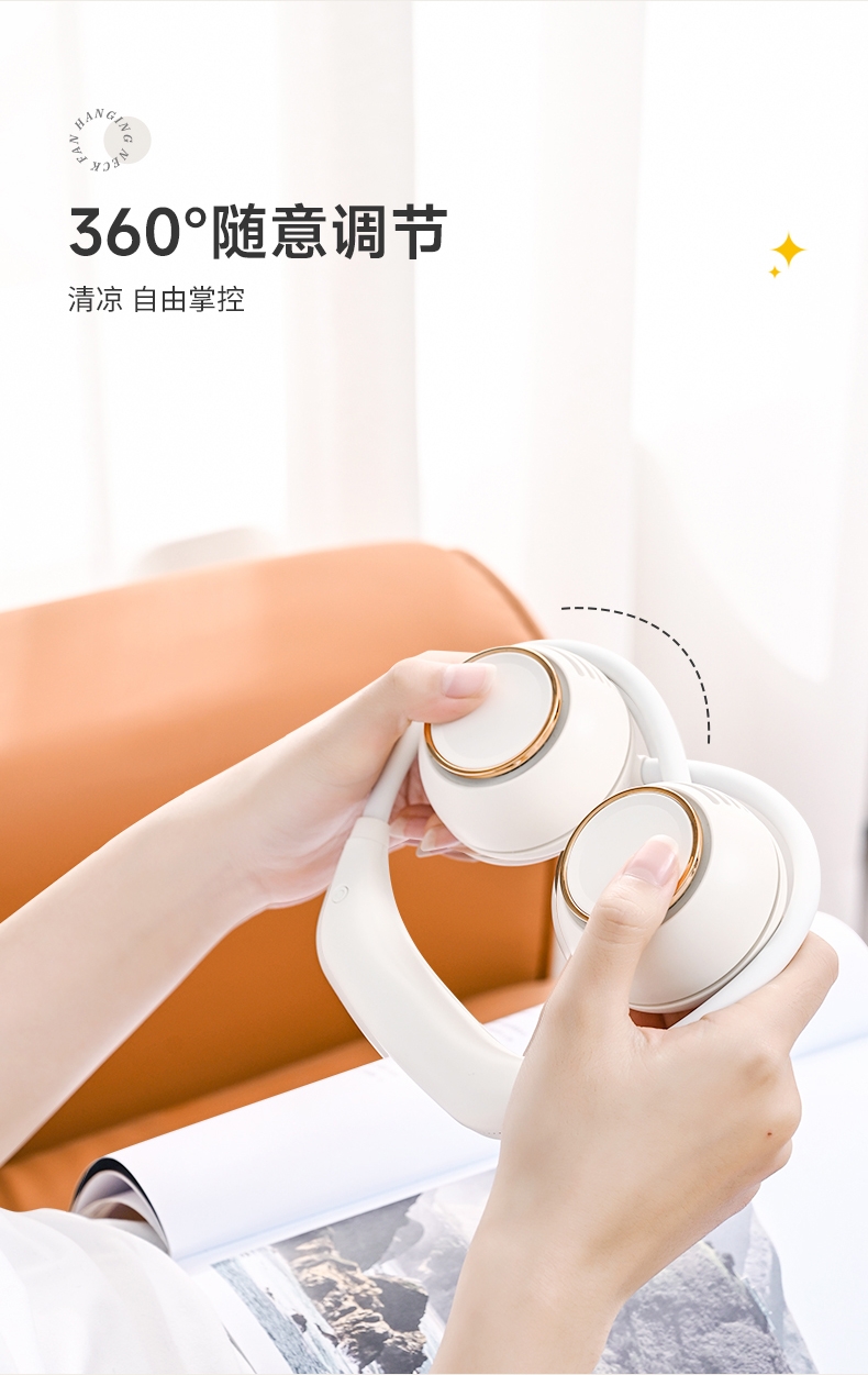 便携;挂脖风扇,四档风力,佩戴舒适;2000mAh大电池,风向随意调节