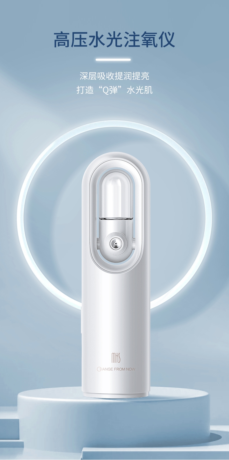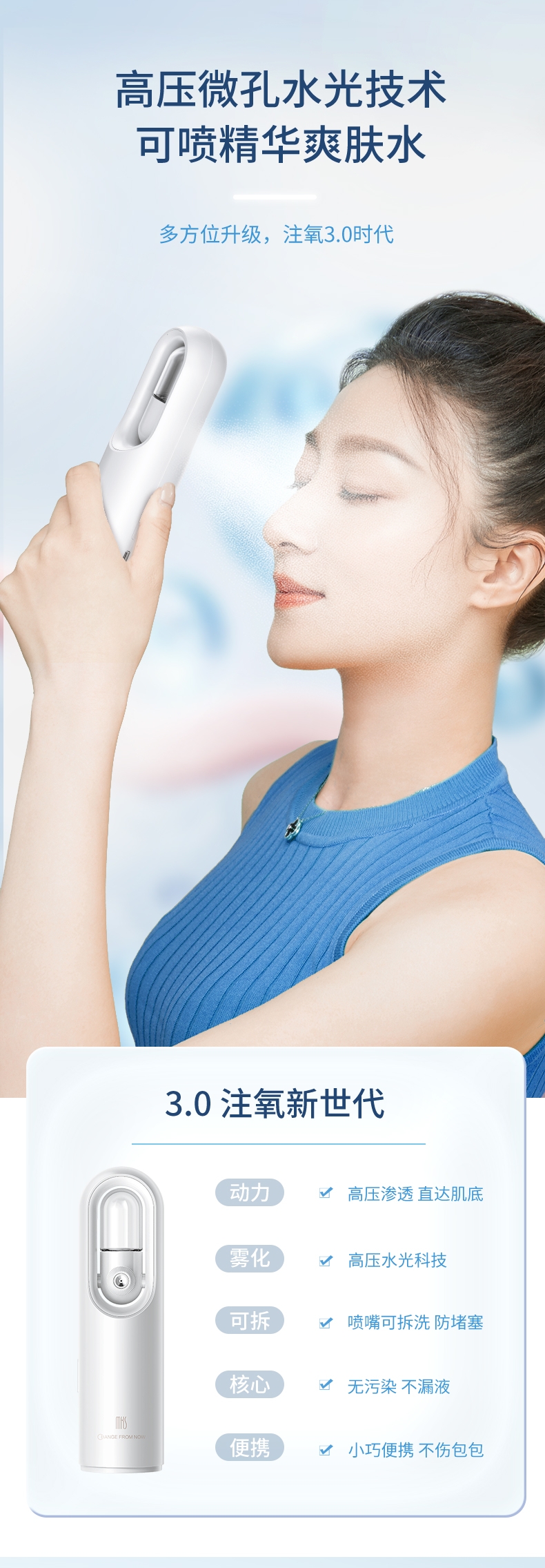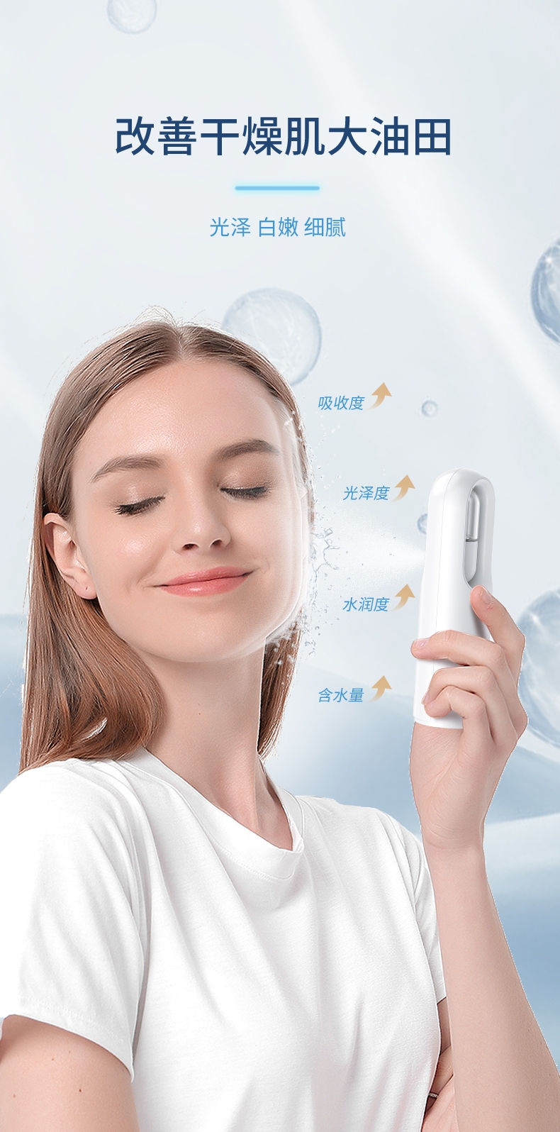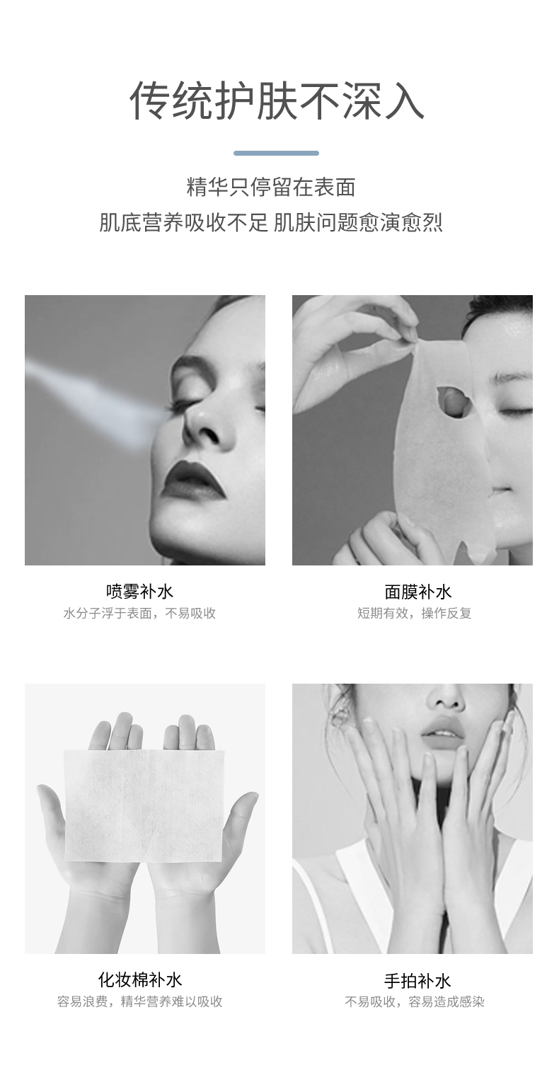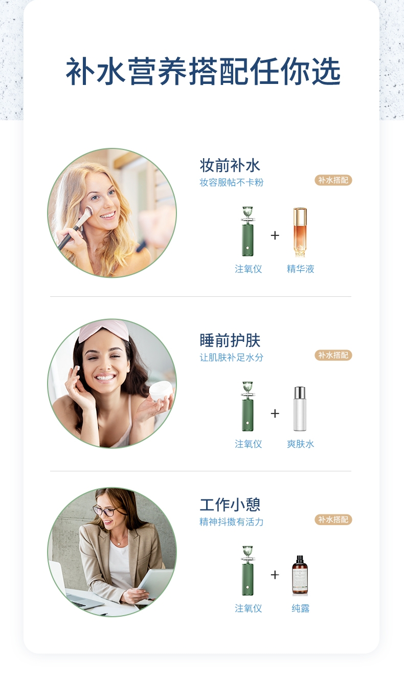 打造水光肌,改造干燥肌;高压雾化、注氧亮肤,补水锁水;纳米补水,打造肌肤舒适圈,促进护肤品吸收