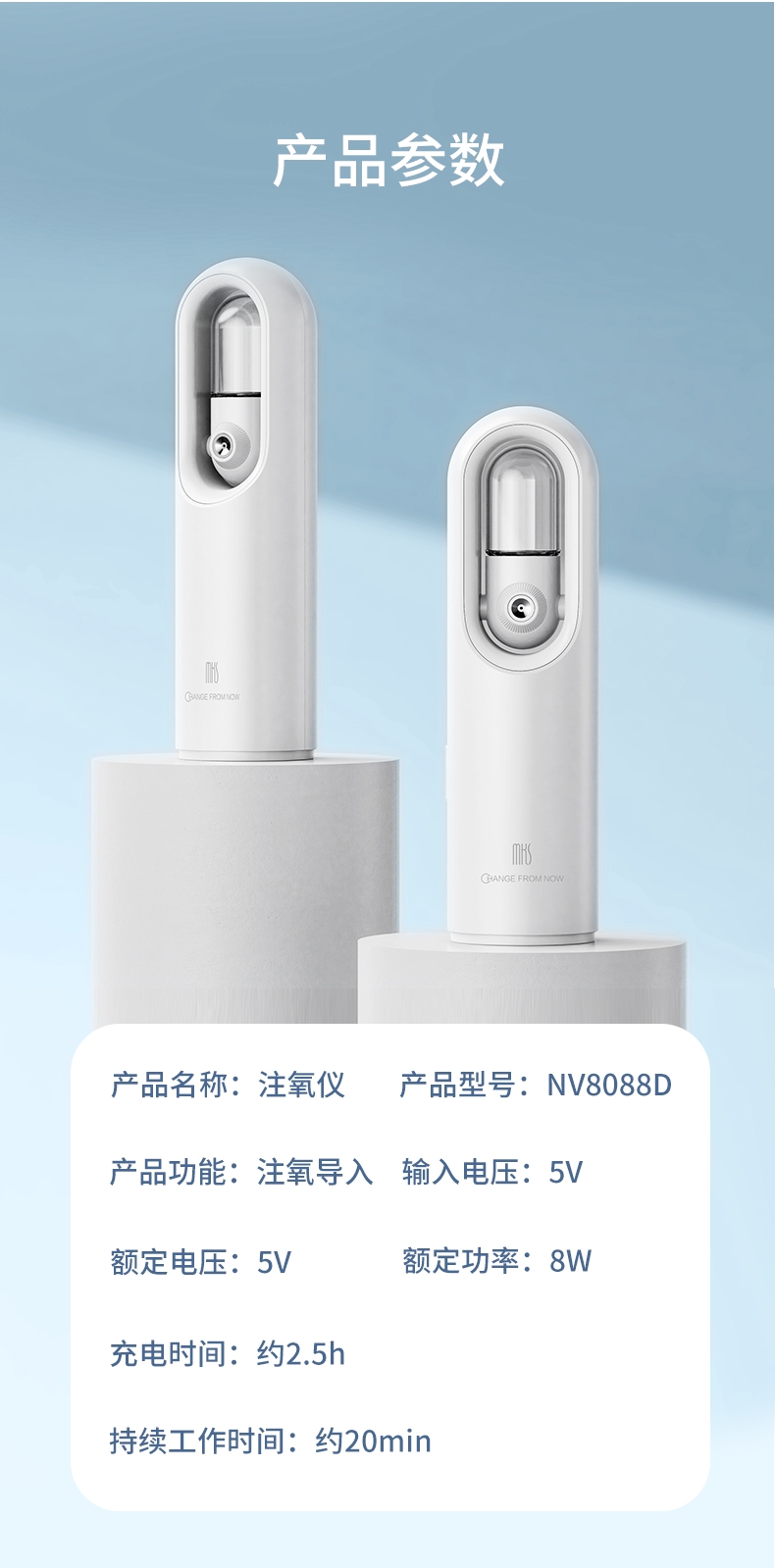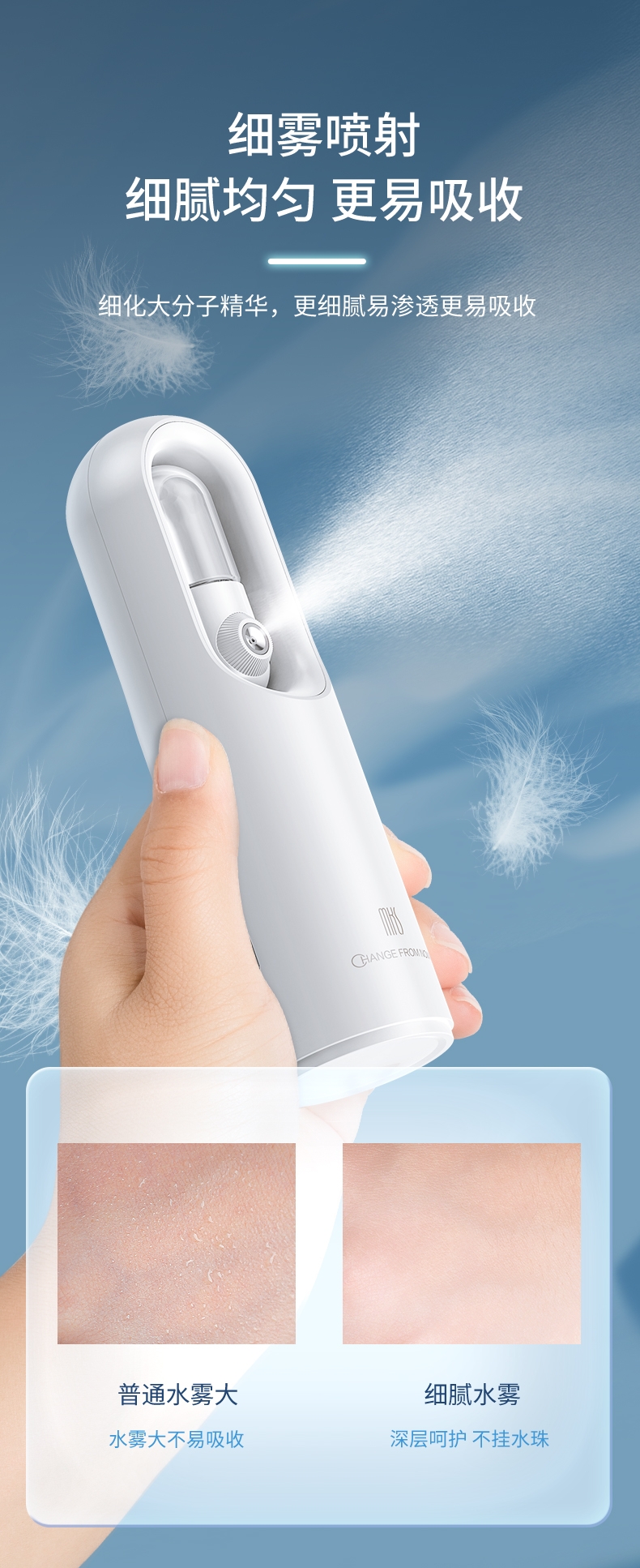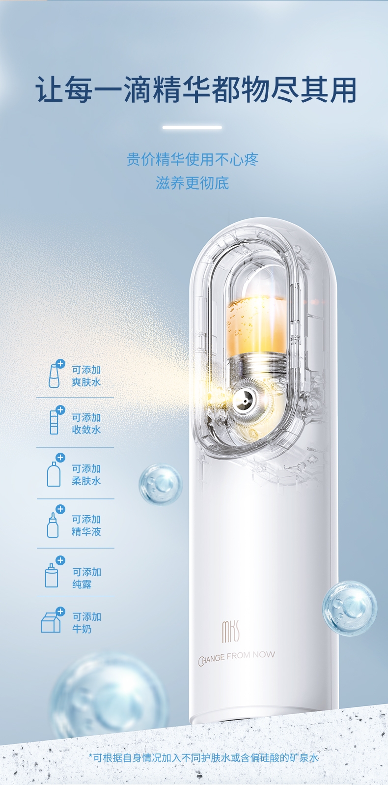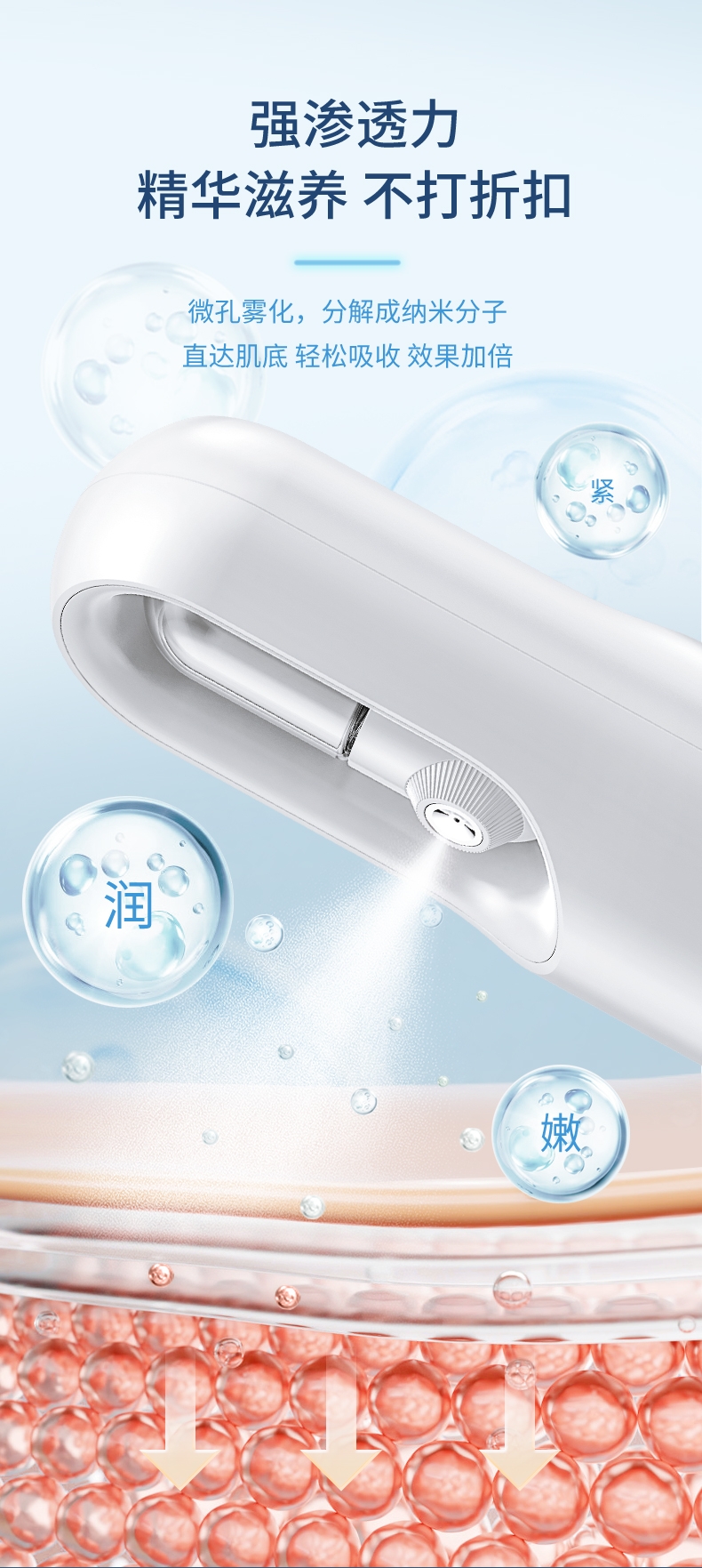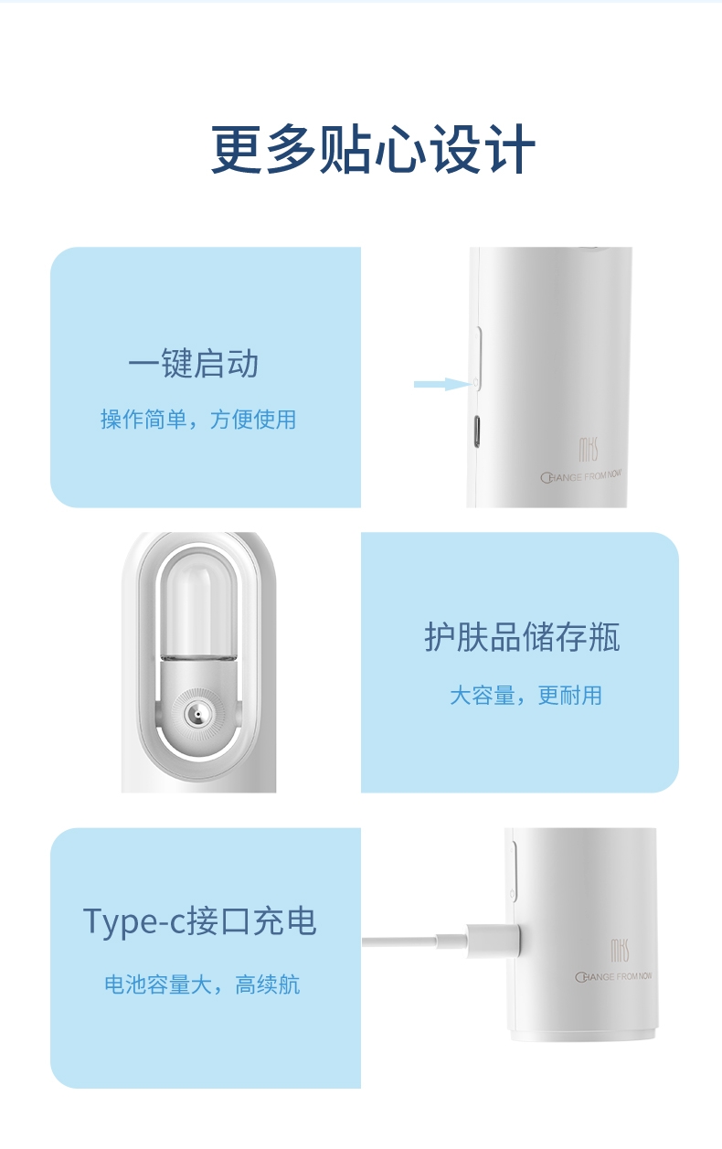打造水光肌,改造干燥肌;高压雾化、注氧亮肤,补水锁水;纳米补水,打造肌肤舒适圈,促进护肤品吸收