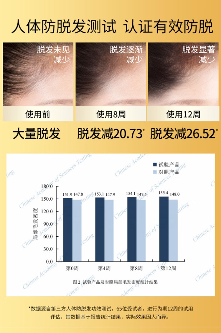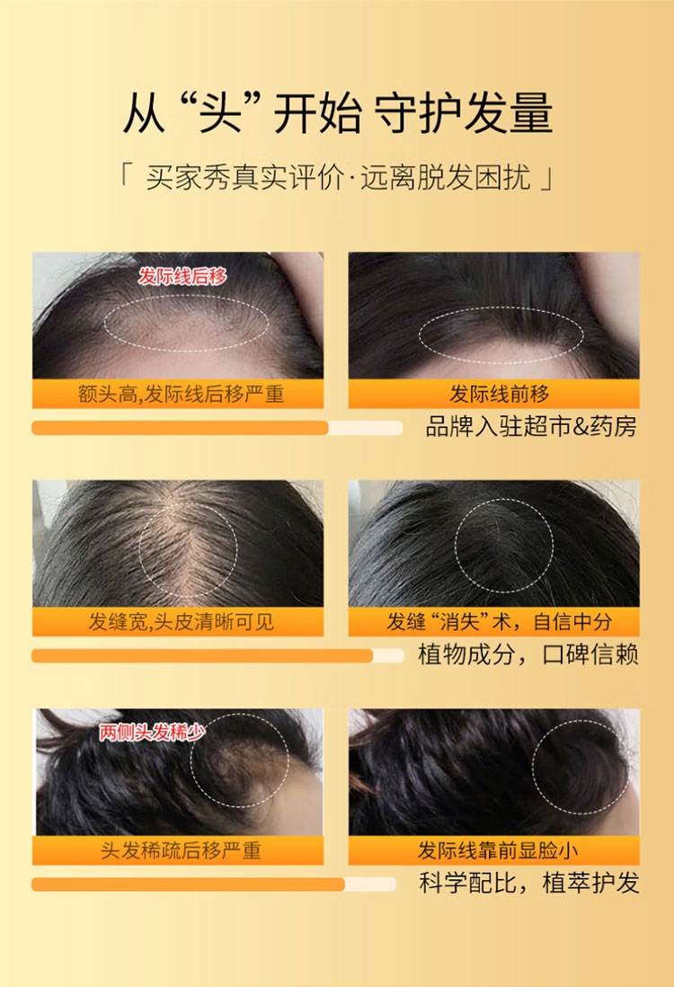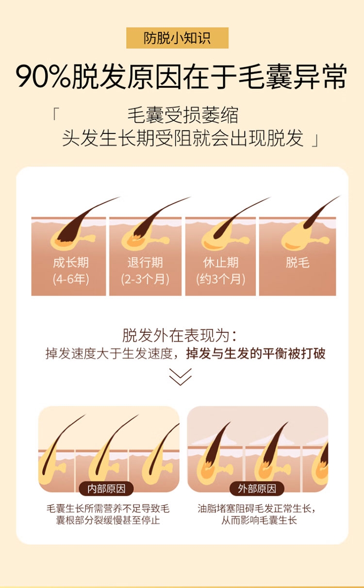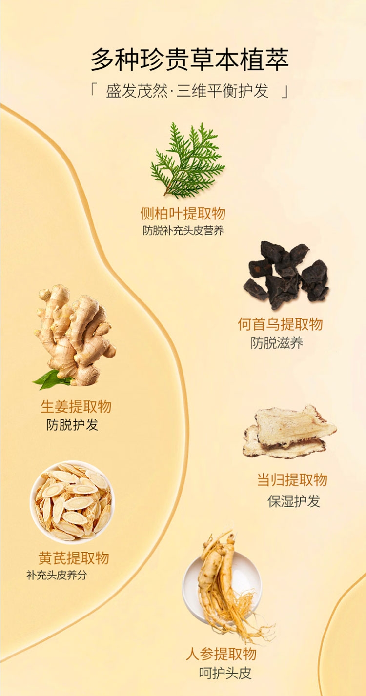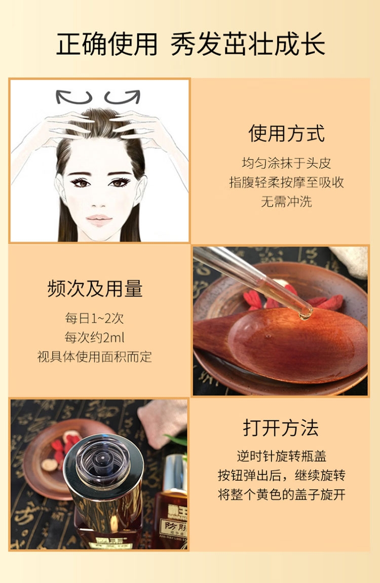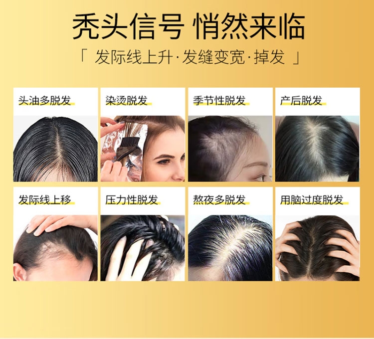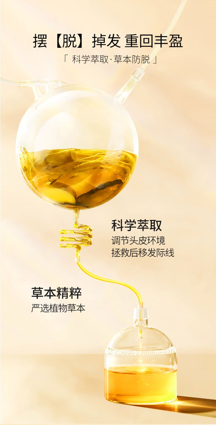 丰盈秀发,周期使用,蓬蓬发量看得见;有效防脱,多重珍贵草本植萃,减少脱发掉发;调节头皮环境,头油过多引起的堵塞,轻松防脱