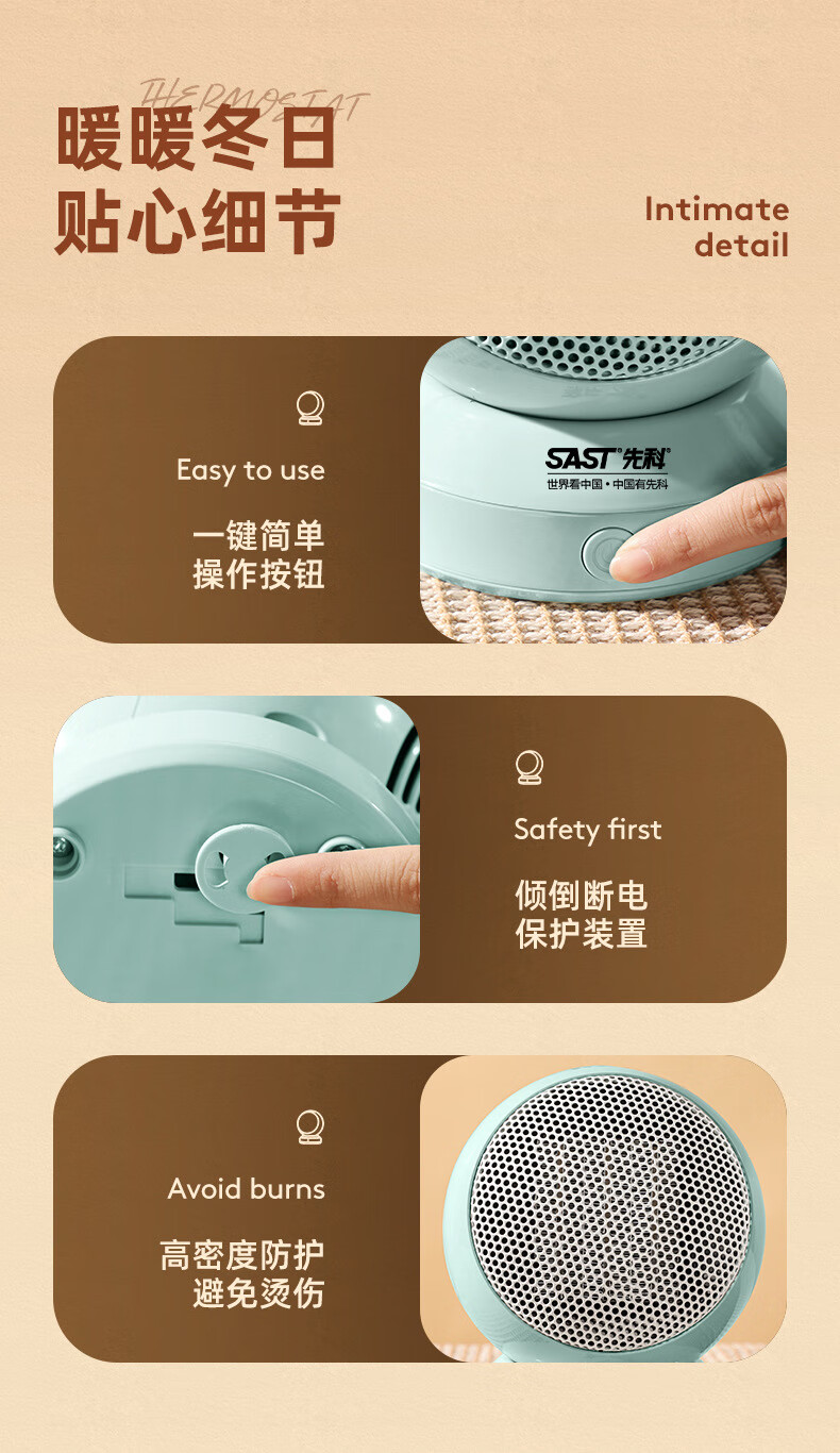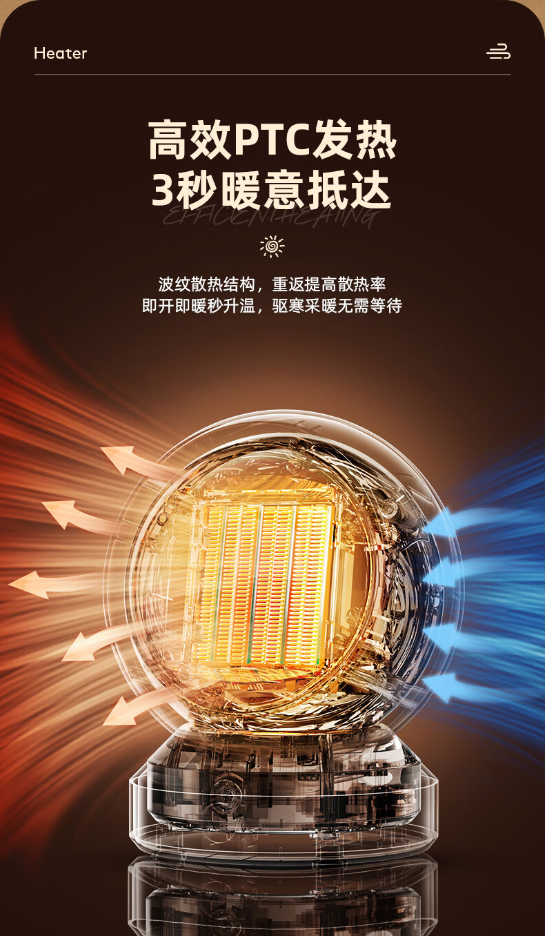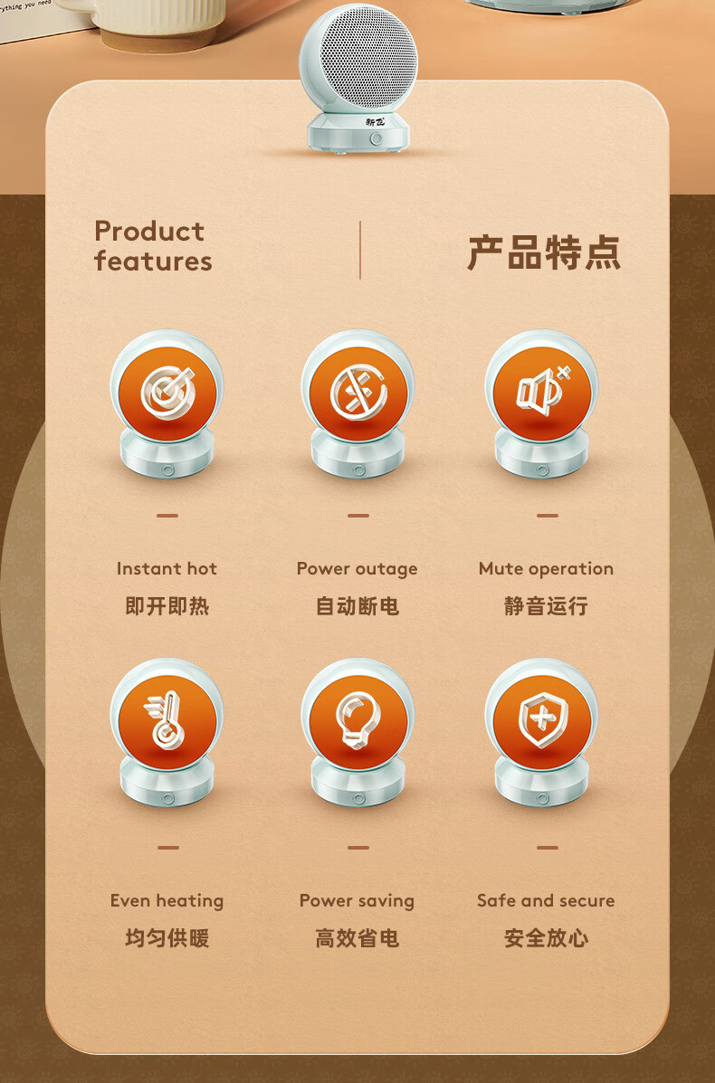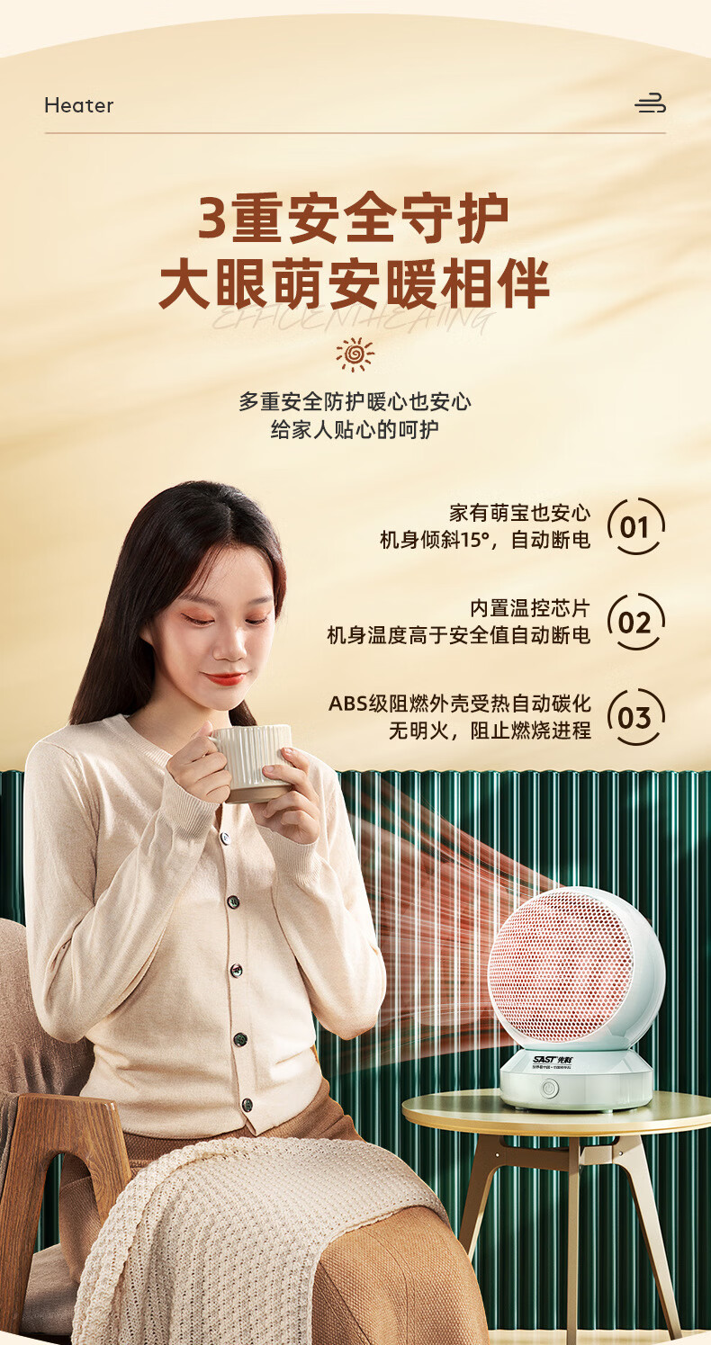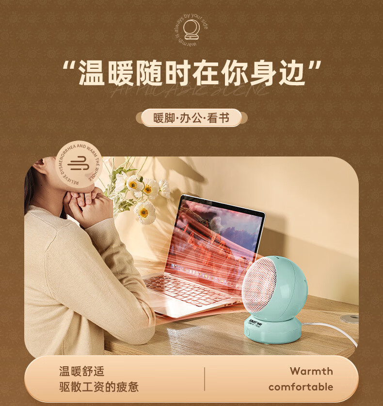 居浴两用:即开即热,手动调节;倾倒断电:过热保护,优质PTC陶瓷加热;循环送暖:冷暖两用,高档1000W;母婴优选:防烫格栅,金属网罩使用安全