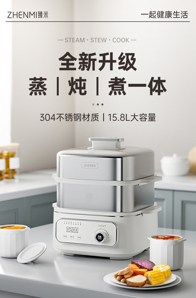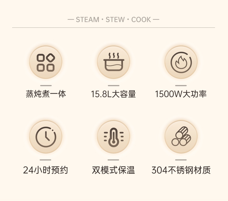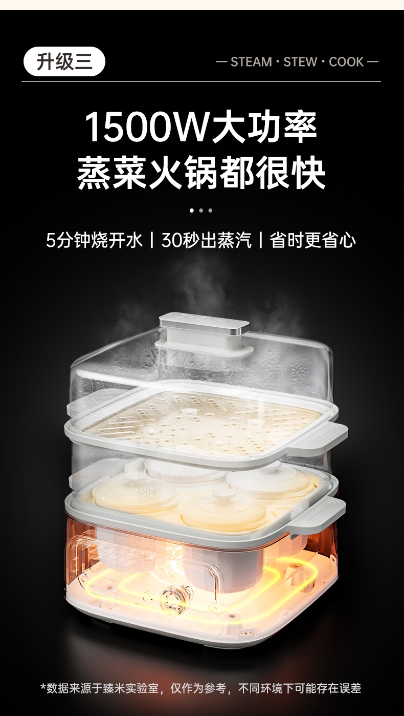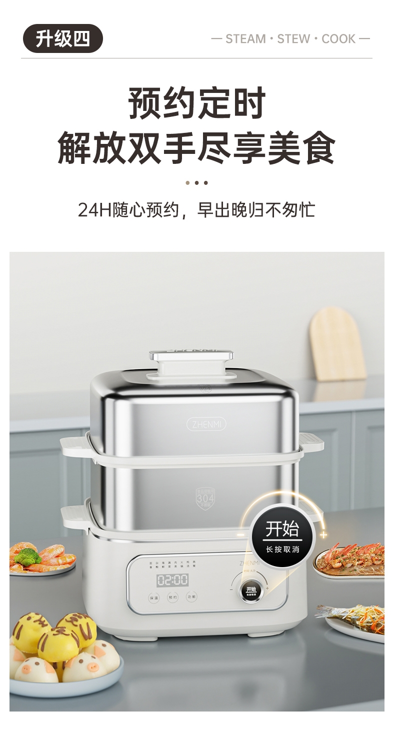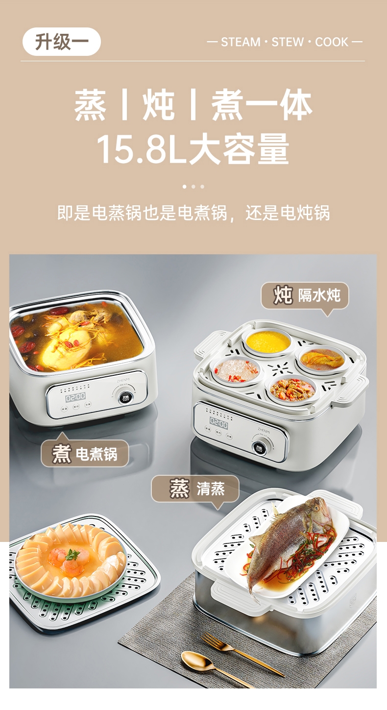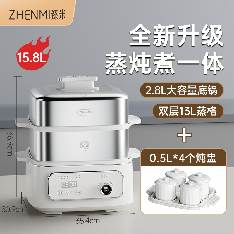 升级15.8L产品容量,蒸煮一体随意搭配健康美食;0.5L*4Pcs选配炖盅,轻松驾驭4种炖汤口味;24H随心预约,早出晚归不匆忙