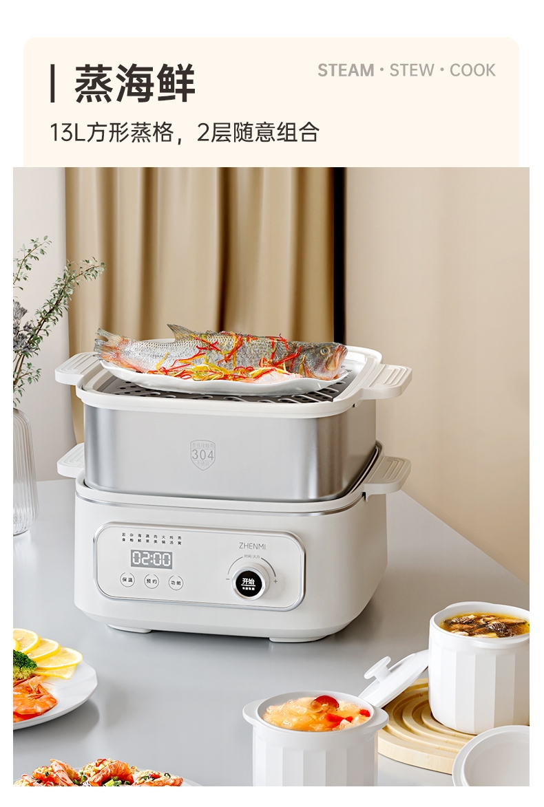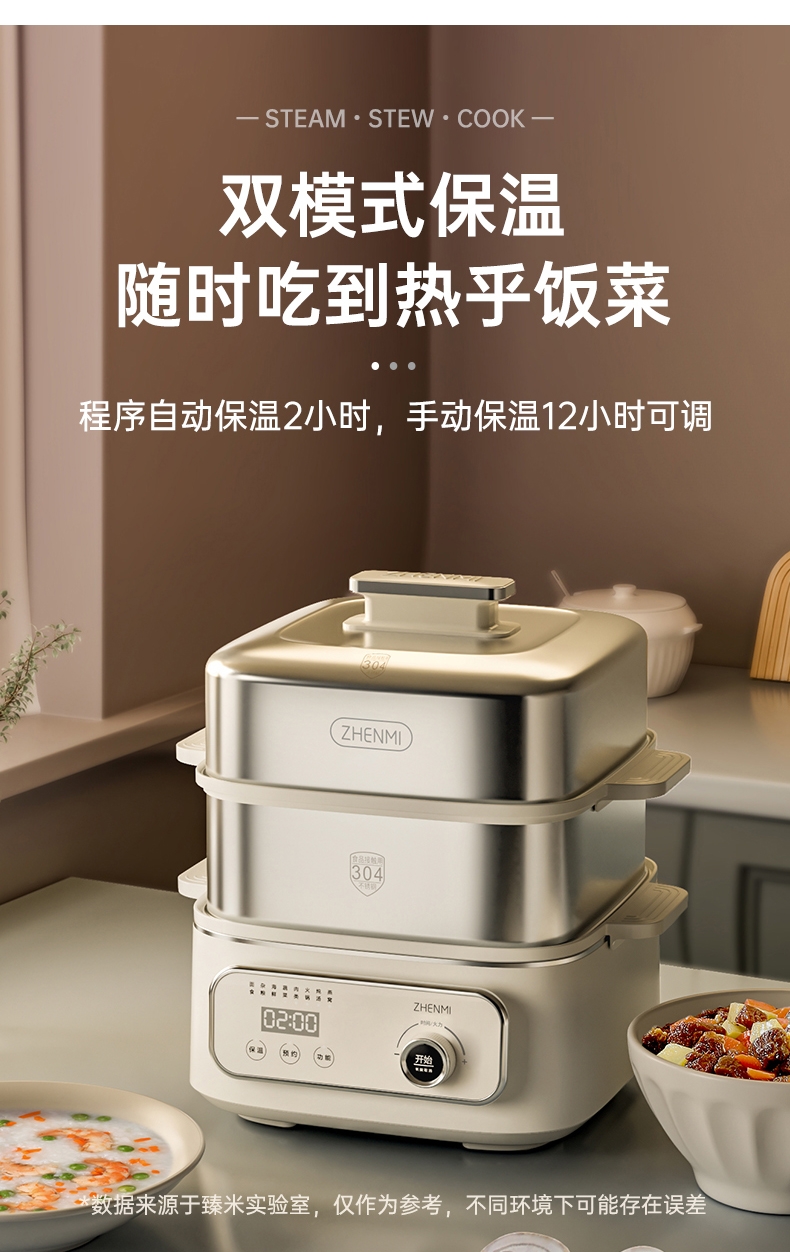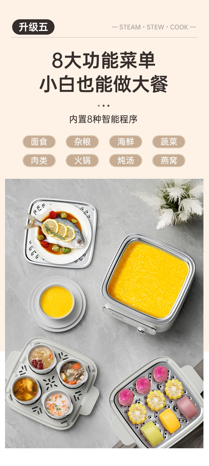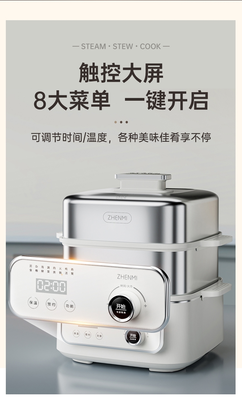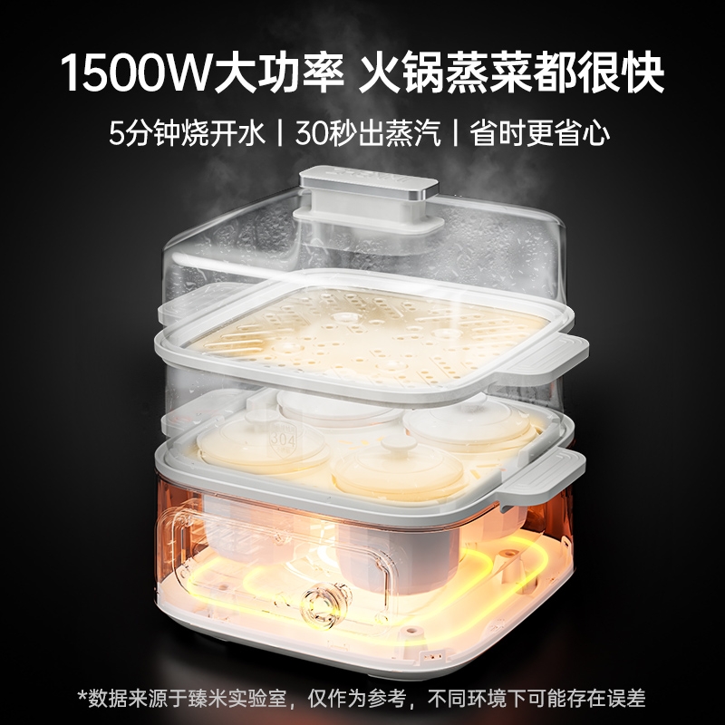 升级15.8L产品容量,蒸煮一体随意搭配健康美食;0.5L*4Pcs选配炖盅,轻松驾驭4种炖汤口味;24H随心预约,早出晚归不匆忙