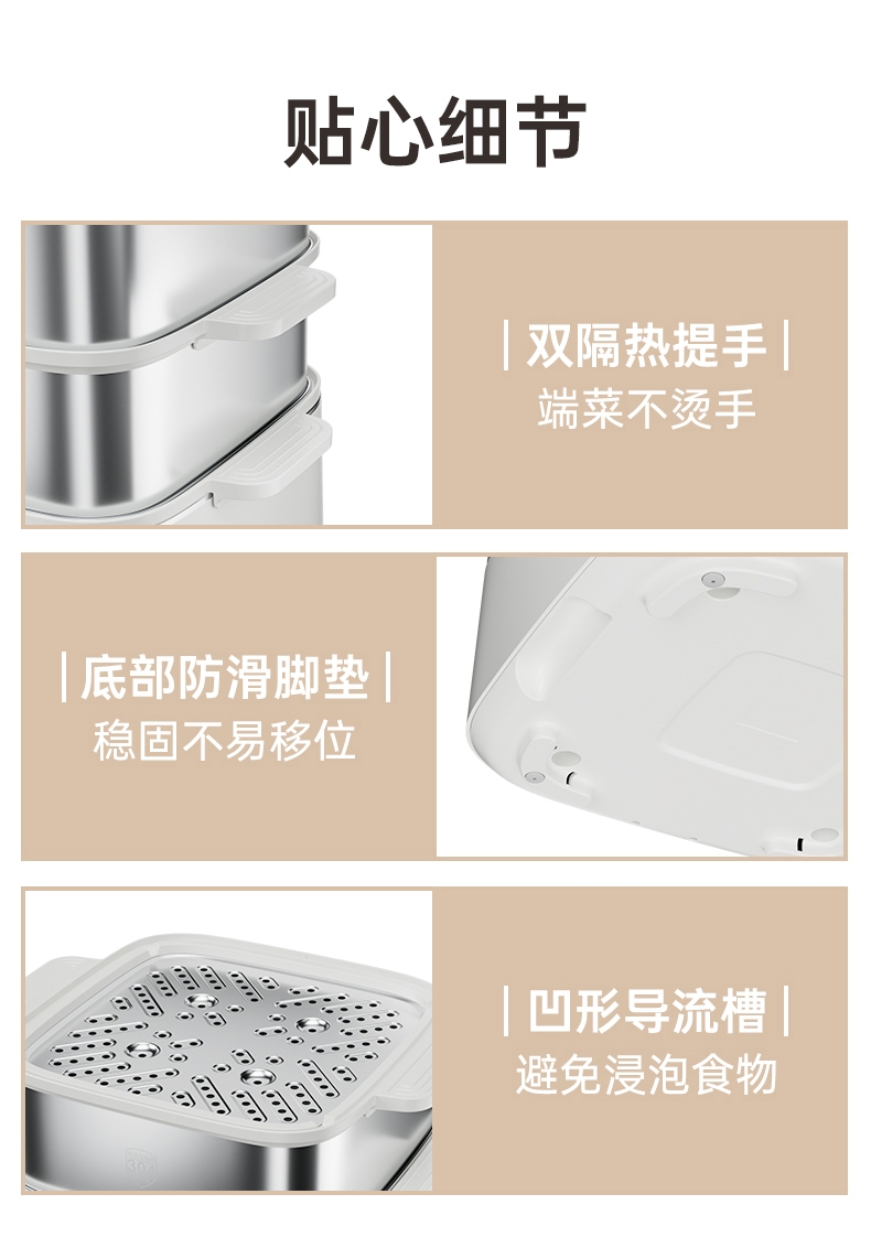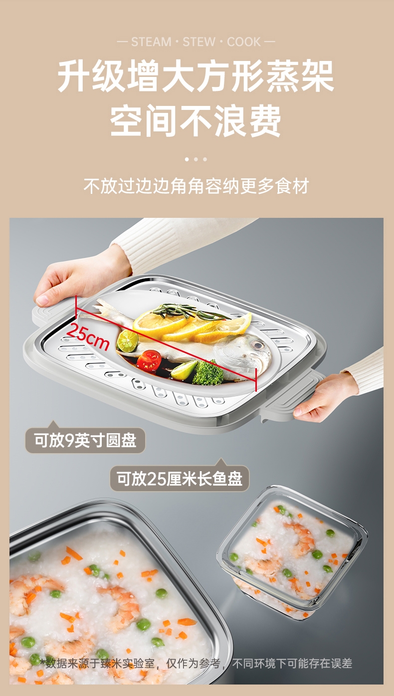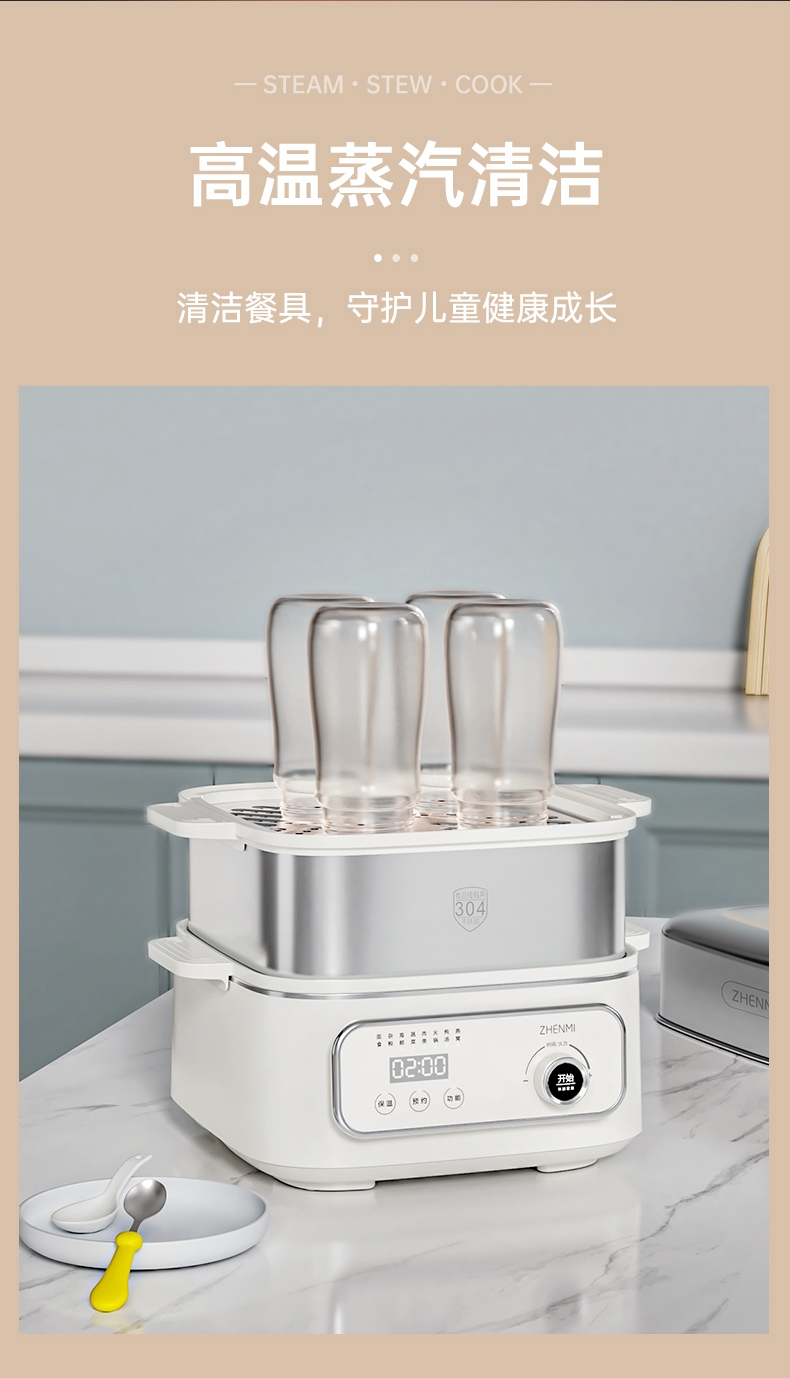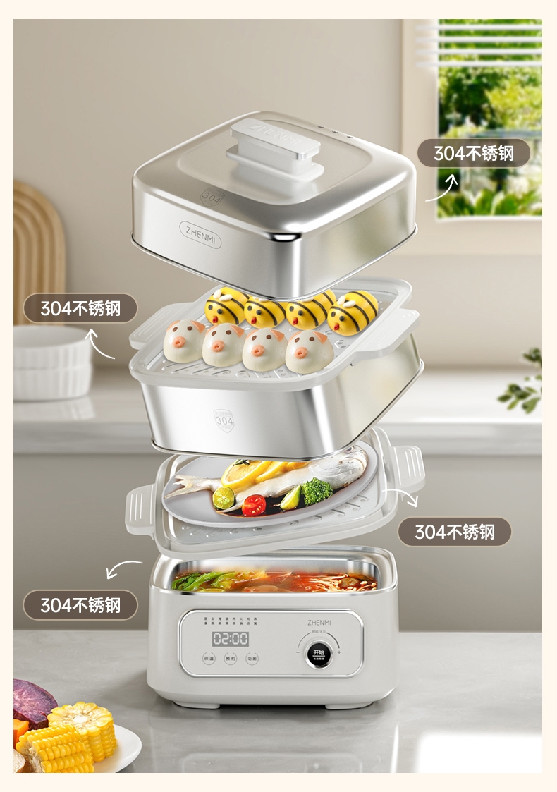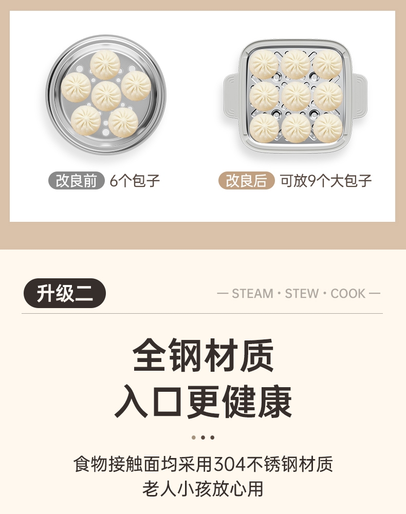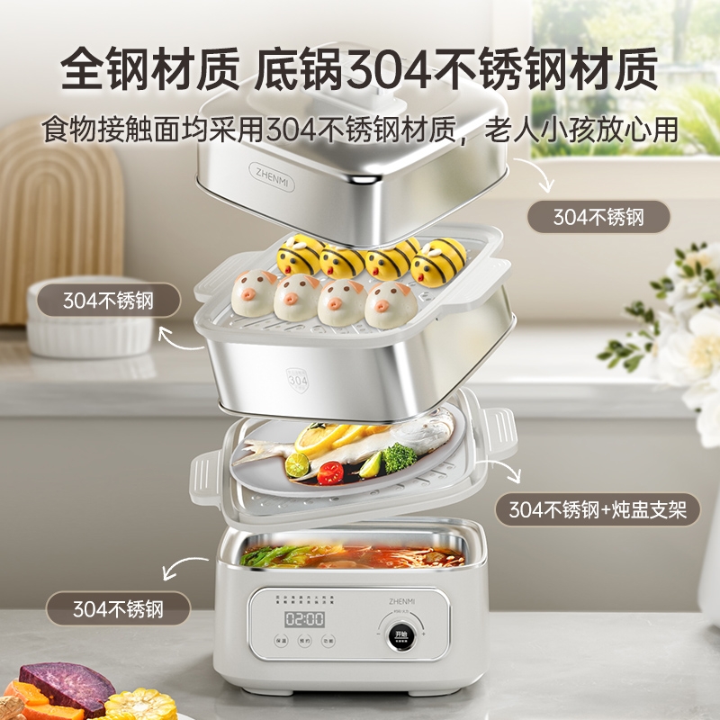 升级15.8L产品容量,蒸煮一体随意搭配健康美食;0.5L*4Pcs选配炖盅,轻松驾驭4种炖汤口味;24H随心预约,早出晚归不匆忙