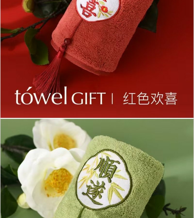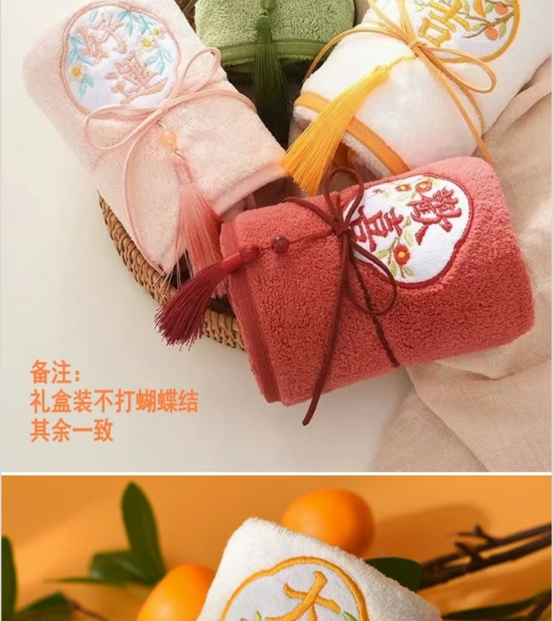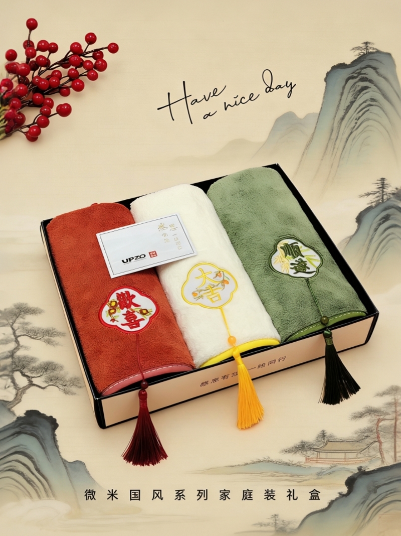 微米国风毛巾 精制包边 厚实面料 结合国风刺绣 ;三条装礼盒 顺遂 大吉 欢喜 祝福融入;迪穆系列天地盖礼盒加手提袋设计 靓丽外观