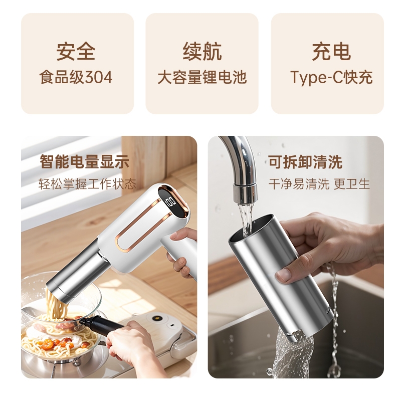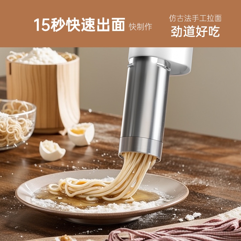 便携无线手持,全自动出面;智能电量显示,轻松掌握工作状态;15秒快速出面,一次压出180g-200g劲道好面;五款面条模型:扁面/方面/宽面/粗面/细面;可拆卸设计,轻松收纳,方便清洗