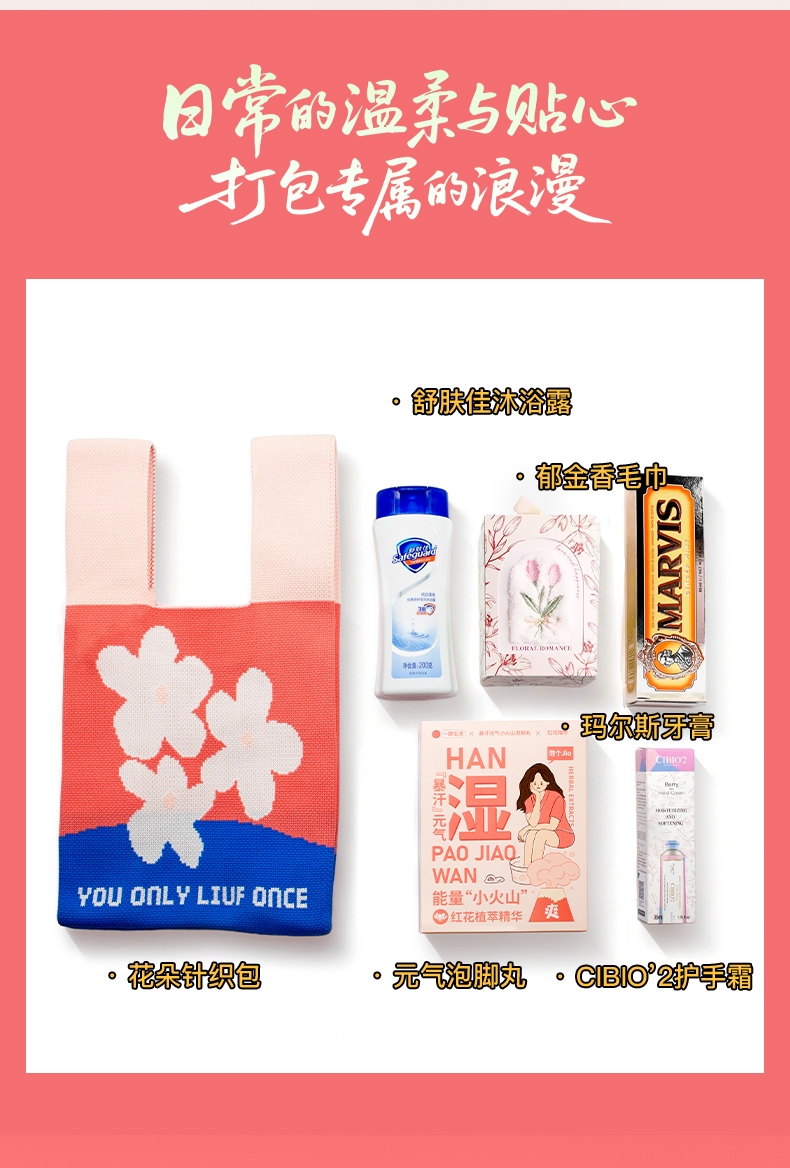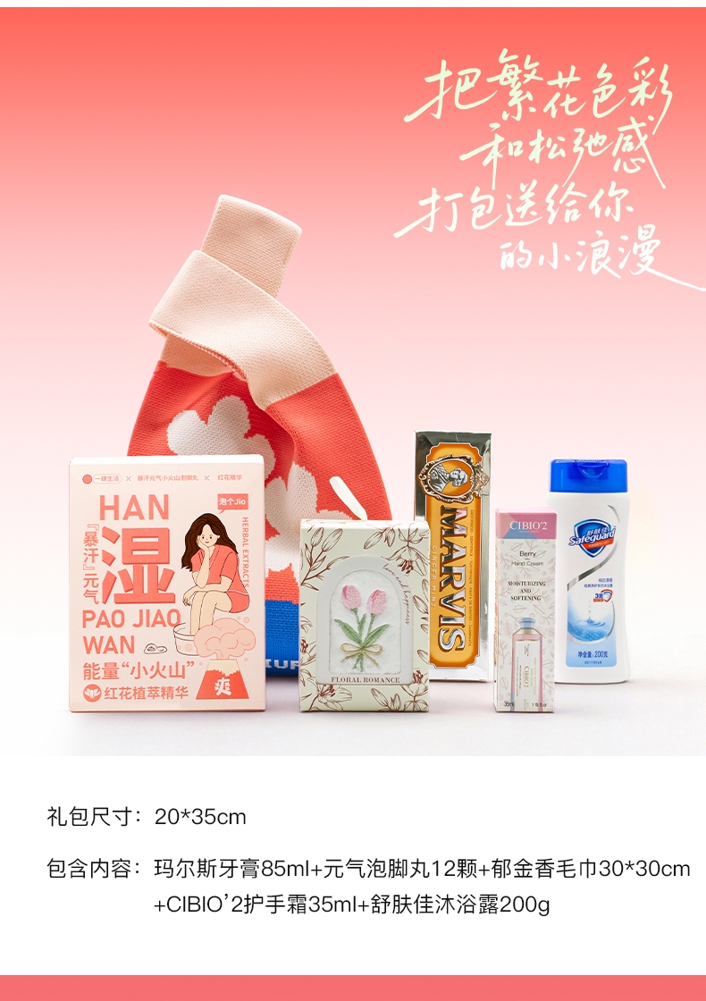 配置清单:花朵针织包20*35cm+玛尔斯牙膏85ml+元气泡脚丸12颗+CIBIO2护手霜35ml+舒肤佳沐浴露200g+郁金香毛巾30*30cm
