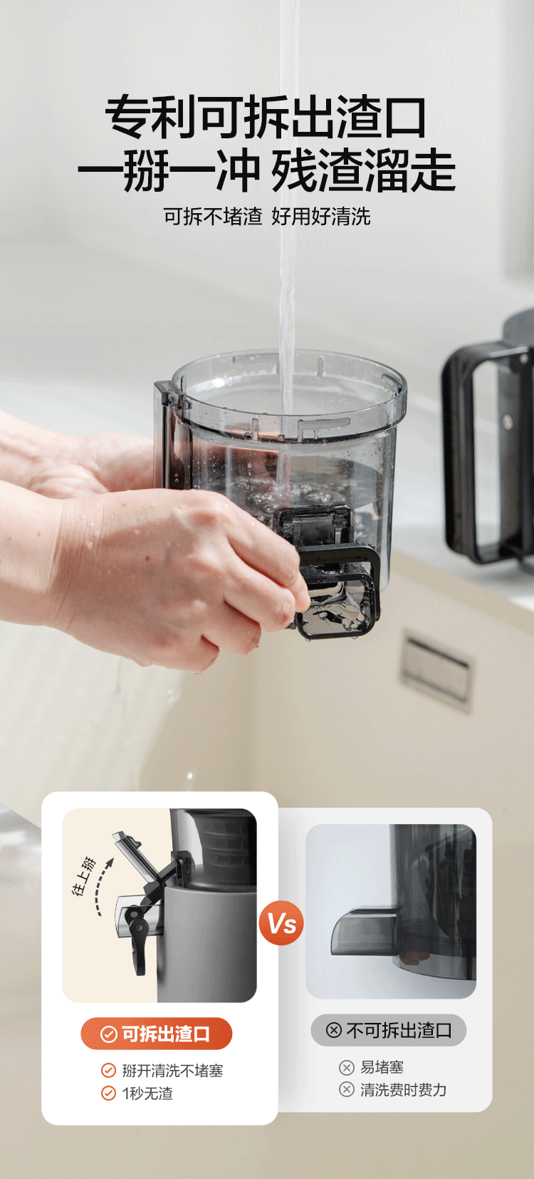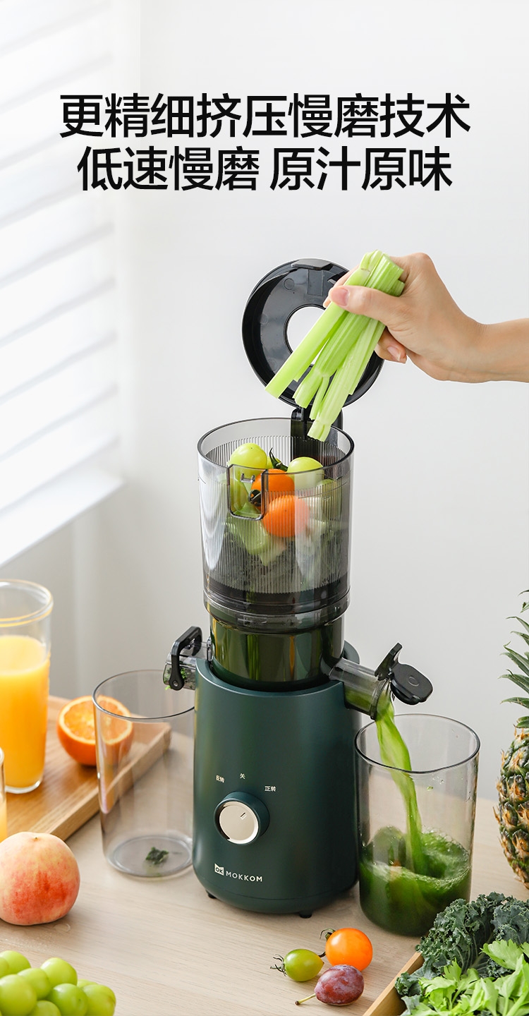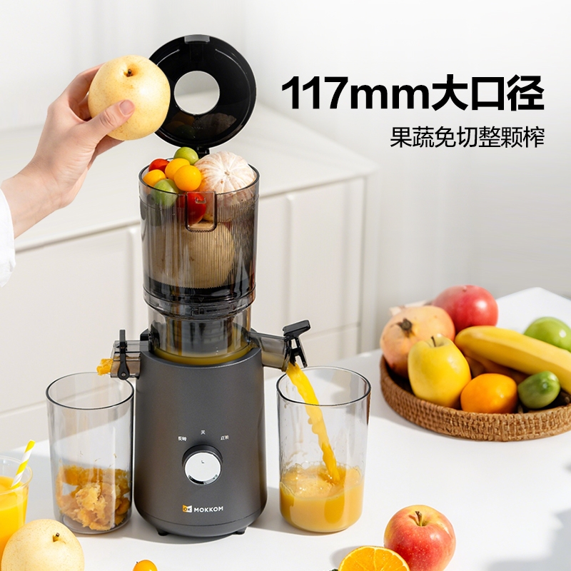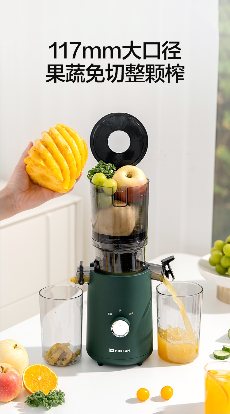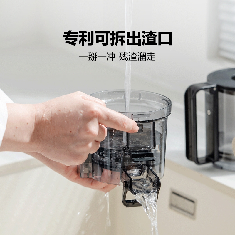 渣汁分离 营养更容易吸收;易洗不堵渣, 一掰一冲 ,残渣溜走;117mm大口径,
