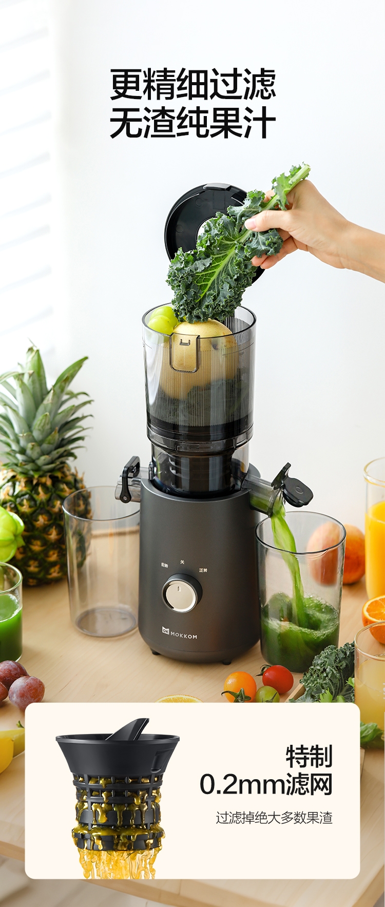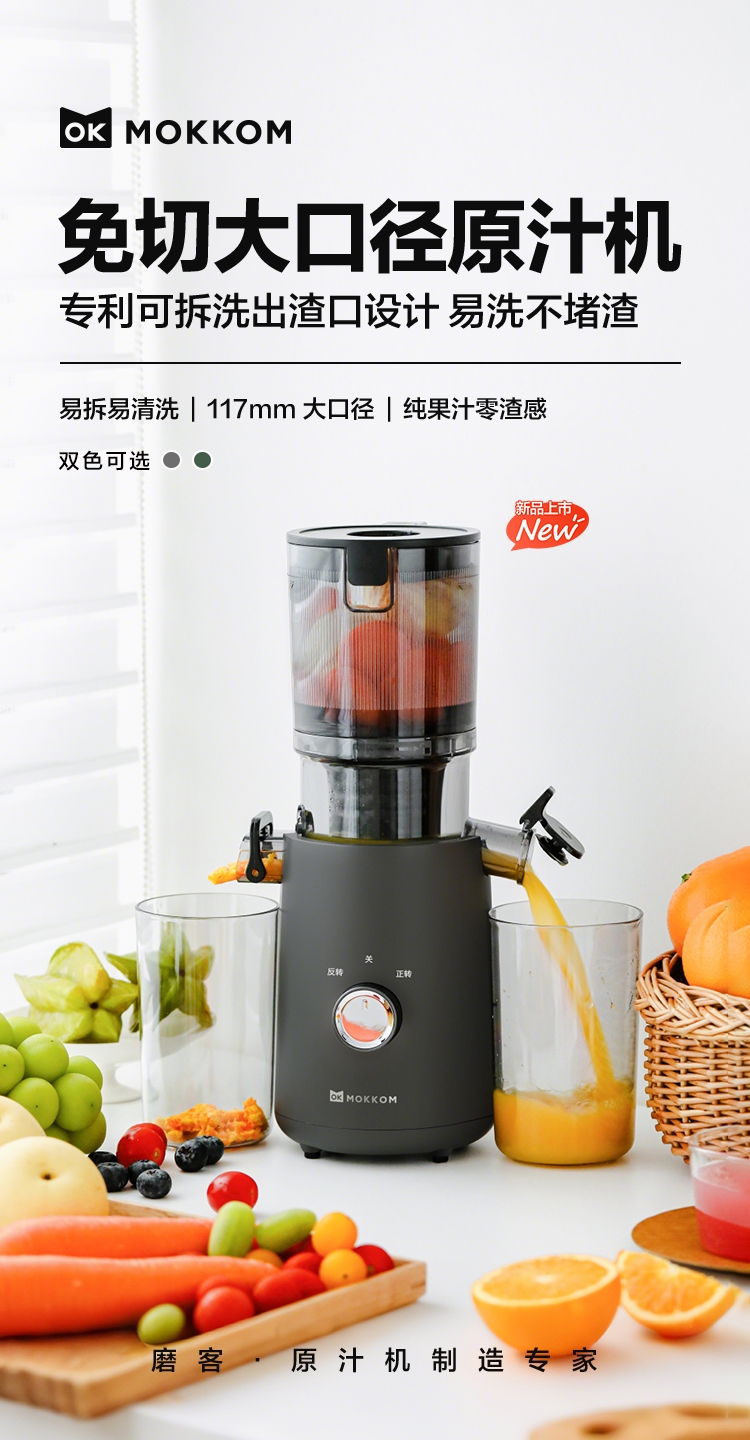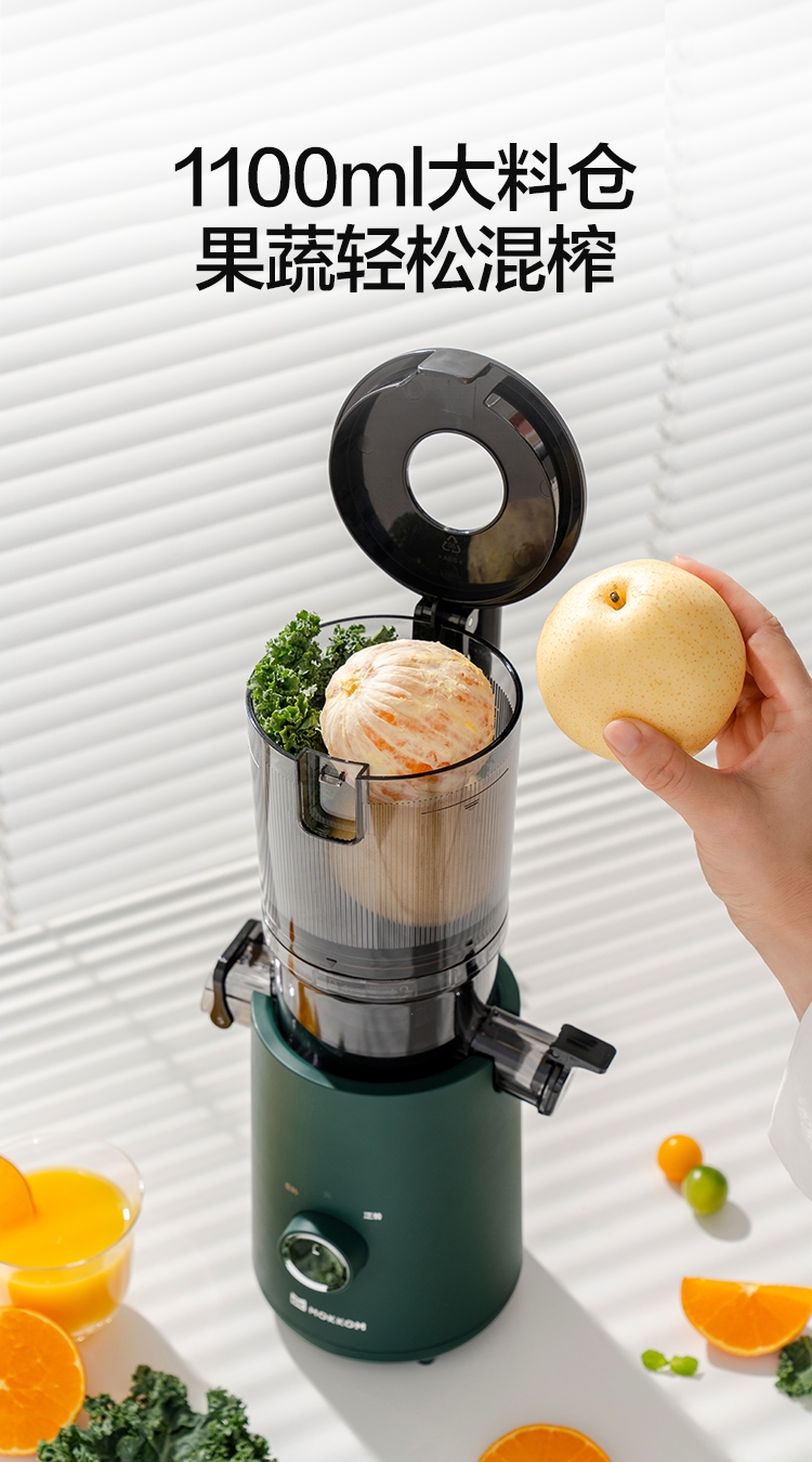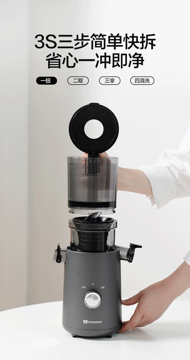 渣汁分离 营养更容易吸收;易洗不堵渣, 一掰一冲 ,残渣溜走;117mm大口径,