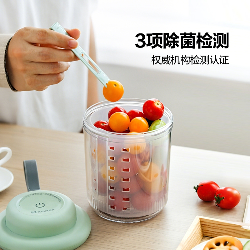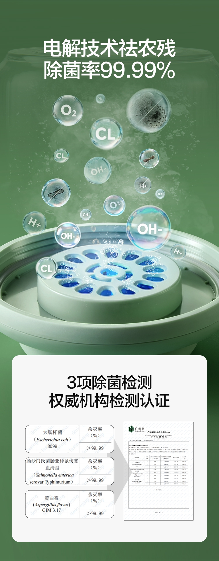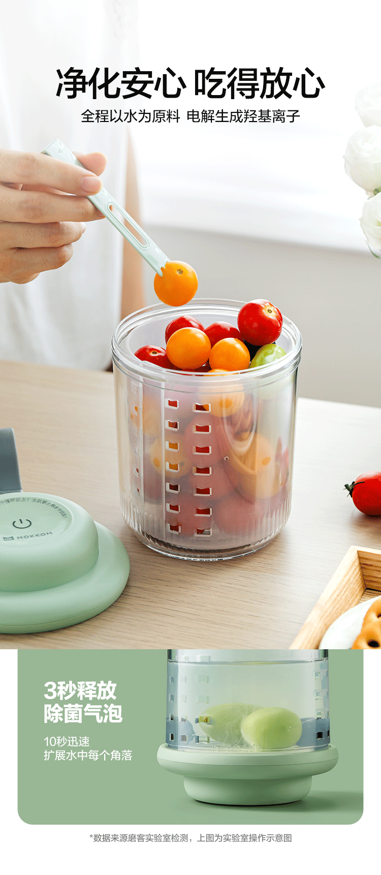 电解技术,一键祛农残,除菌率99.99%;3分钟即可快速清洗祛农残,净化安心,吃得放心;3秒释放除菌气泡,10秒迅速扩展水中每个角落