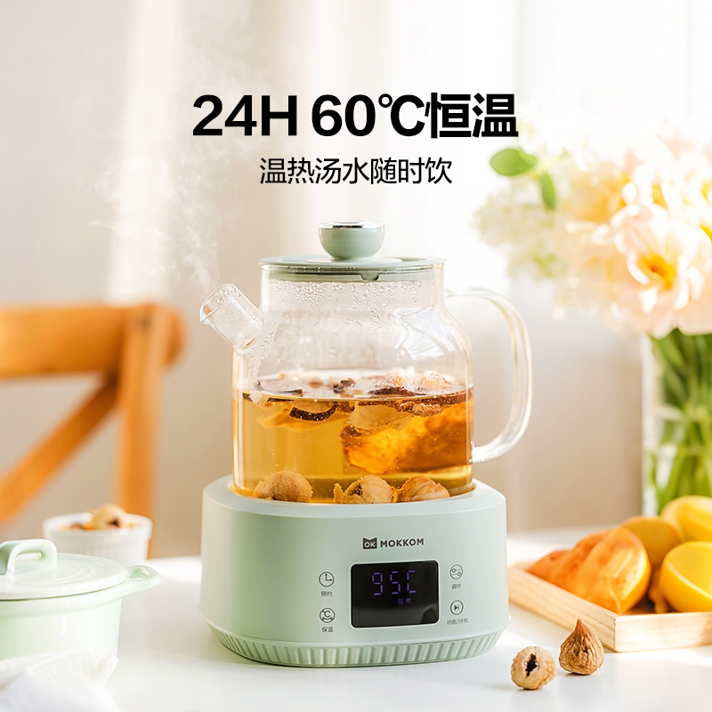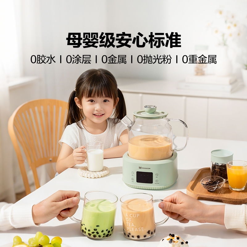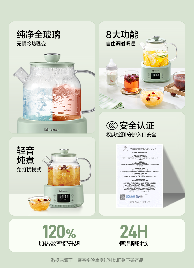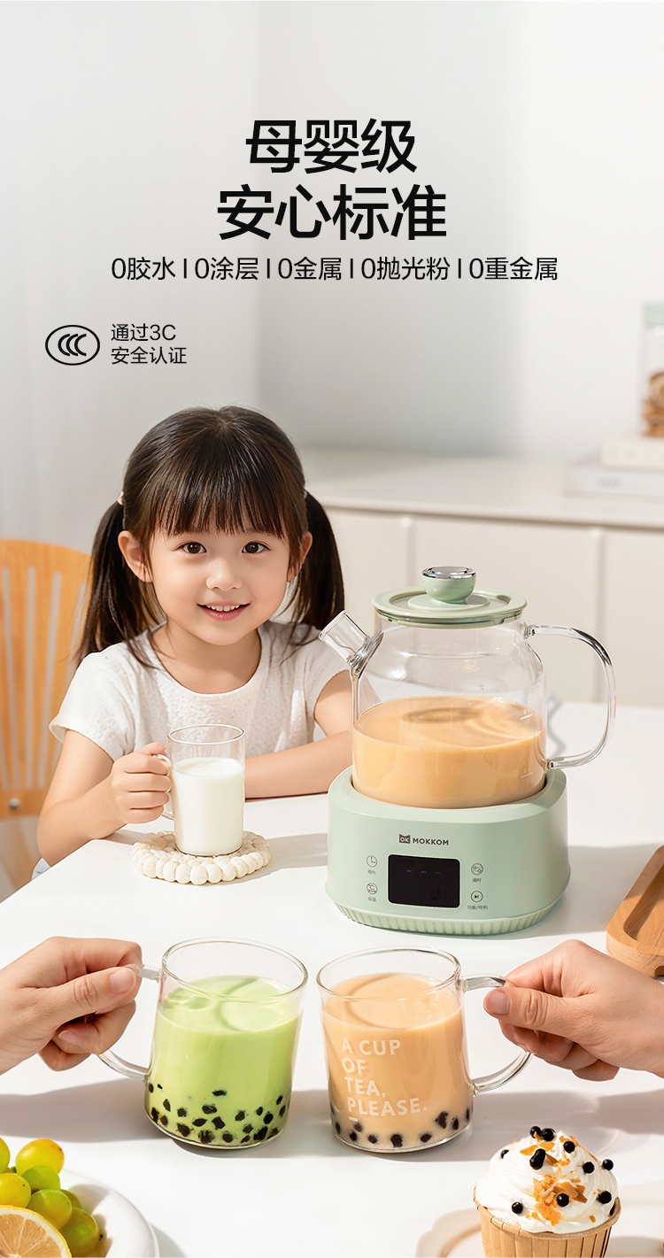 母婴级安心标准, 0胶水,0涂层,0金属,0抛光粉;全玻璃一体成型,无死角,无磨底,更稳固;;24小时智能预约,24小时60℃恒温, 温热汤水随
